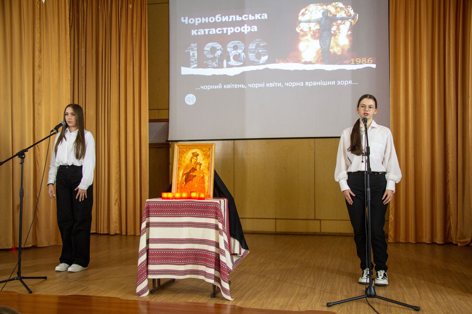 Емоційності додавали театралізовані образи Чорнобильської Мадонни, Мавки, вмираючої дитини, свічки біля образу Богоматері, дзвони Чорнобиля.