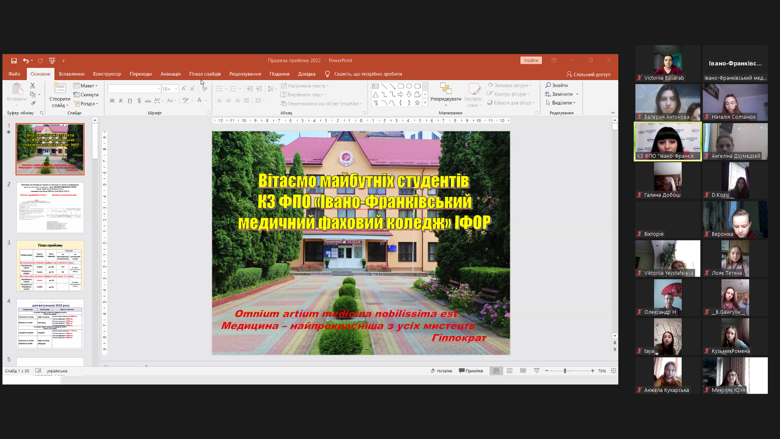 На жаль, останні два роки таке знайомство доводиться проводити дистанційно, на платформі Zoom. І розпочалося воно з відеоролика про Івано-Франківський медичний фаховий коледж, підготовленого до його 80-річчя.