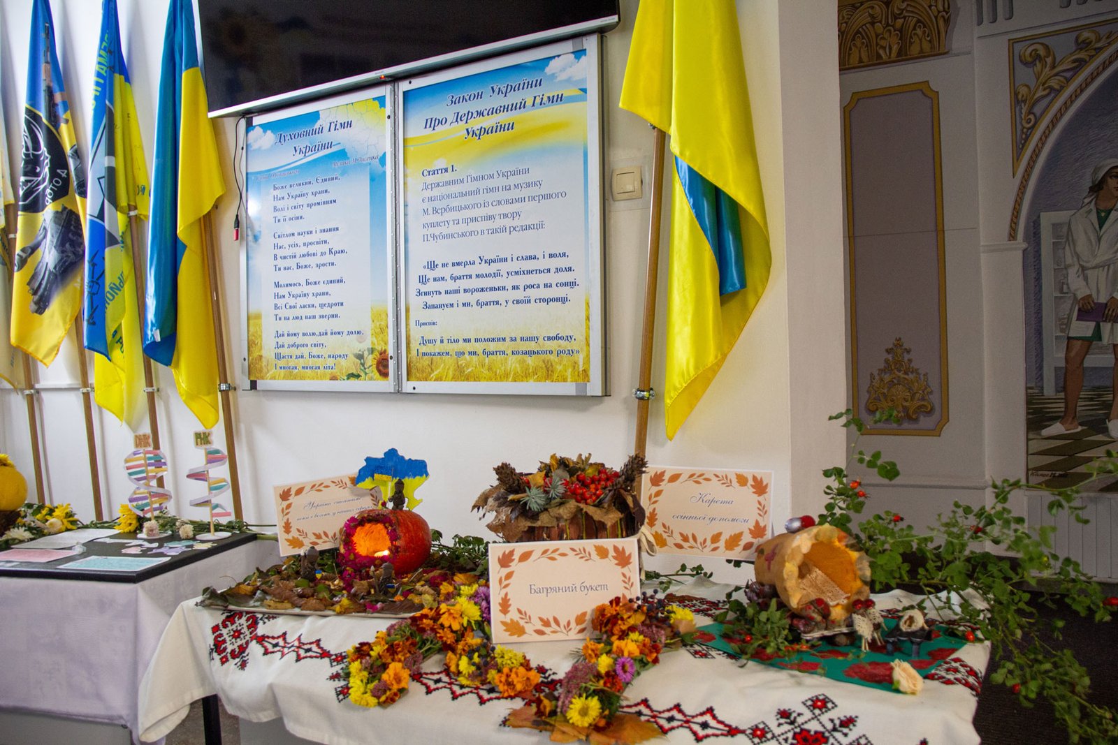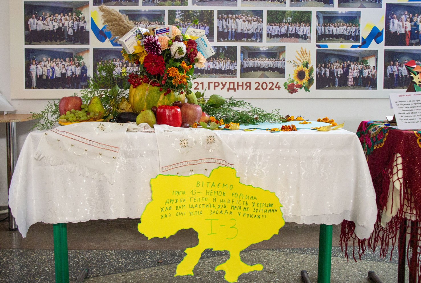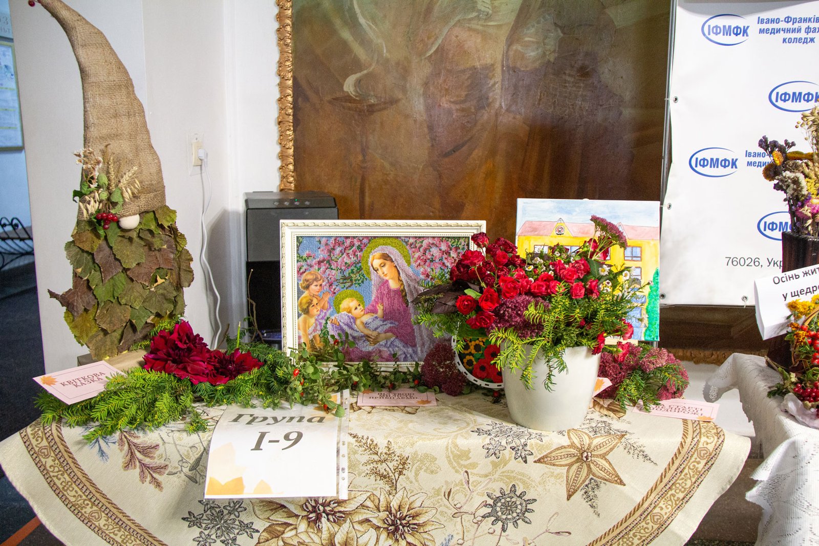 А першокурсники до такого календарного свята підготували свої творчі доробки. Кожна група на окремому столі презентувала по три композиції: на національно-патріотичну, медичну і довільну тематику. Оскільки це свято осені, основою композицій стали овочі, фрукти, квіти – дари природи, особливо щедрої саме восени.