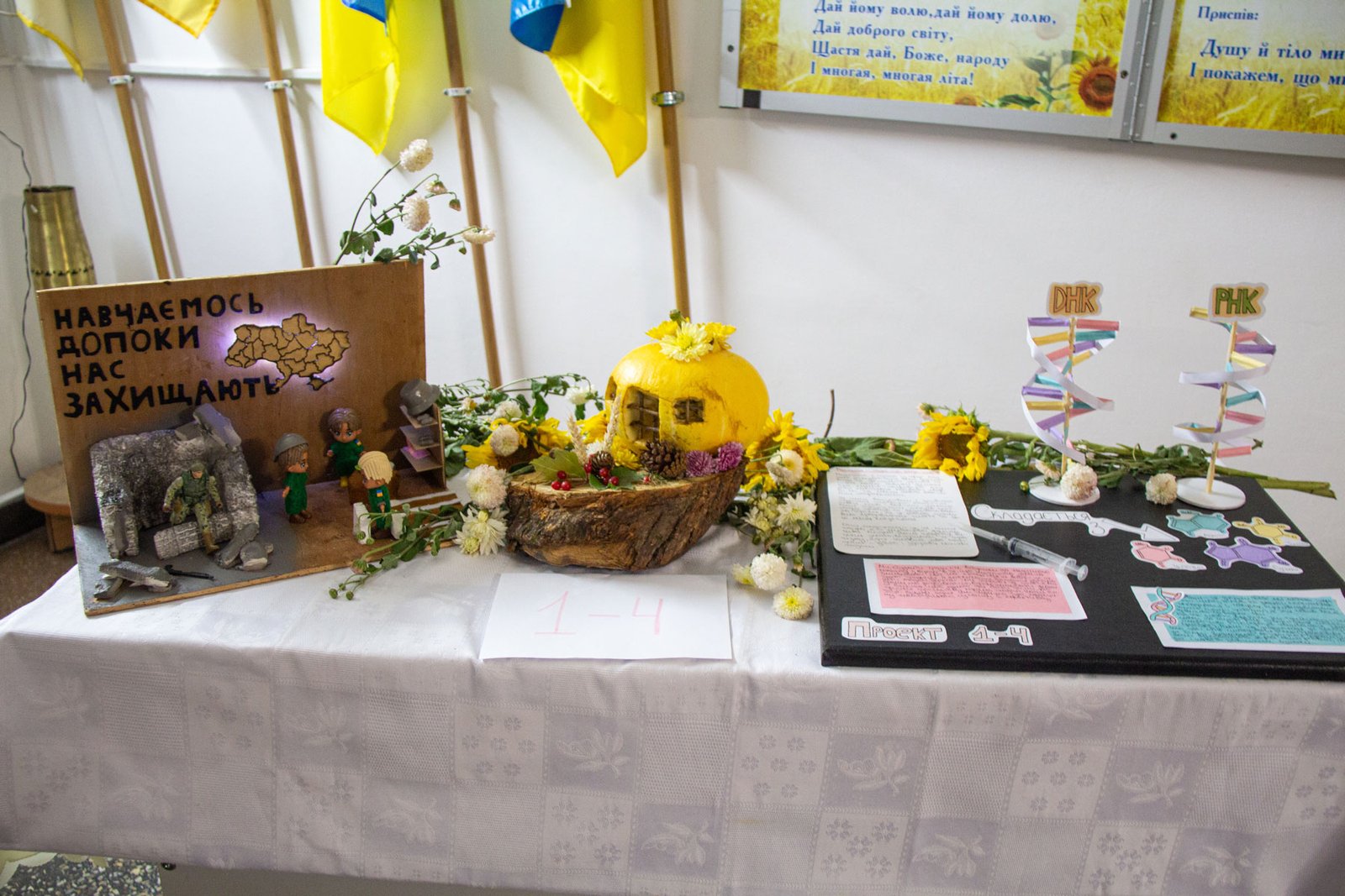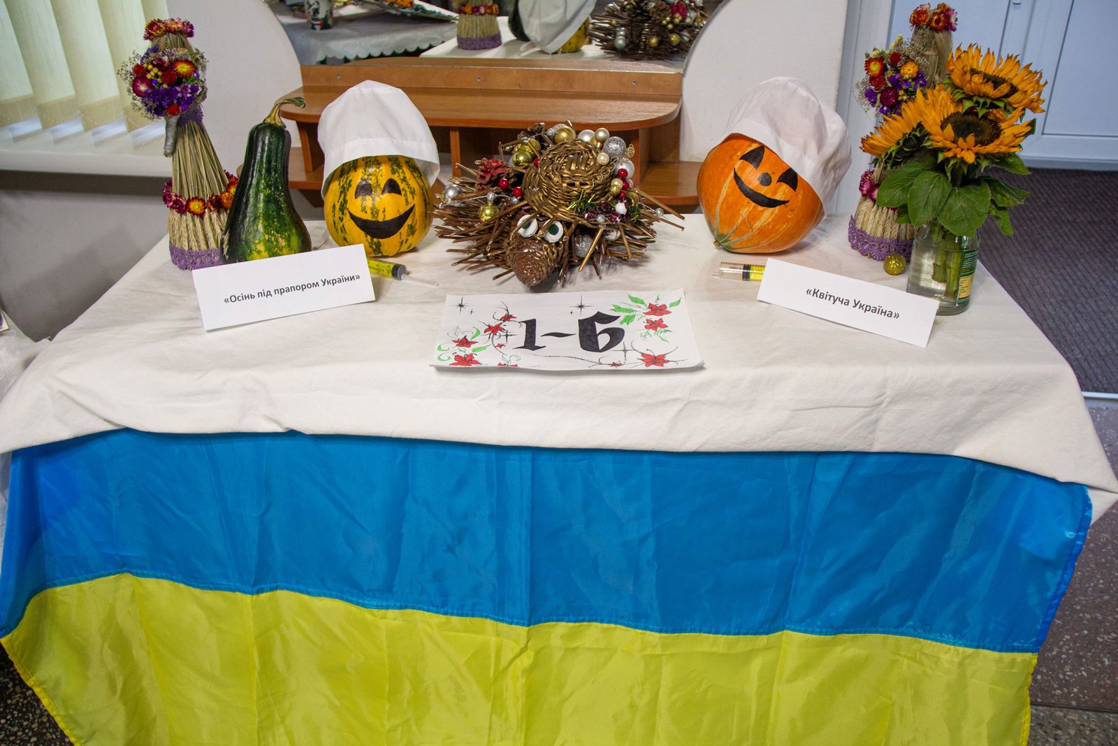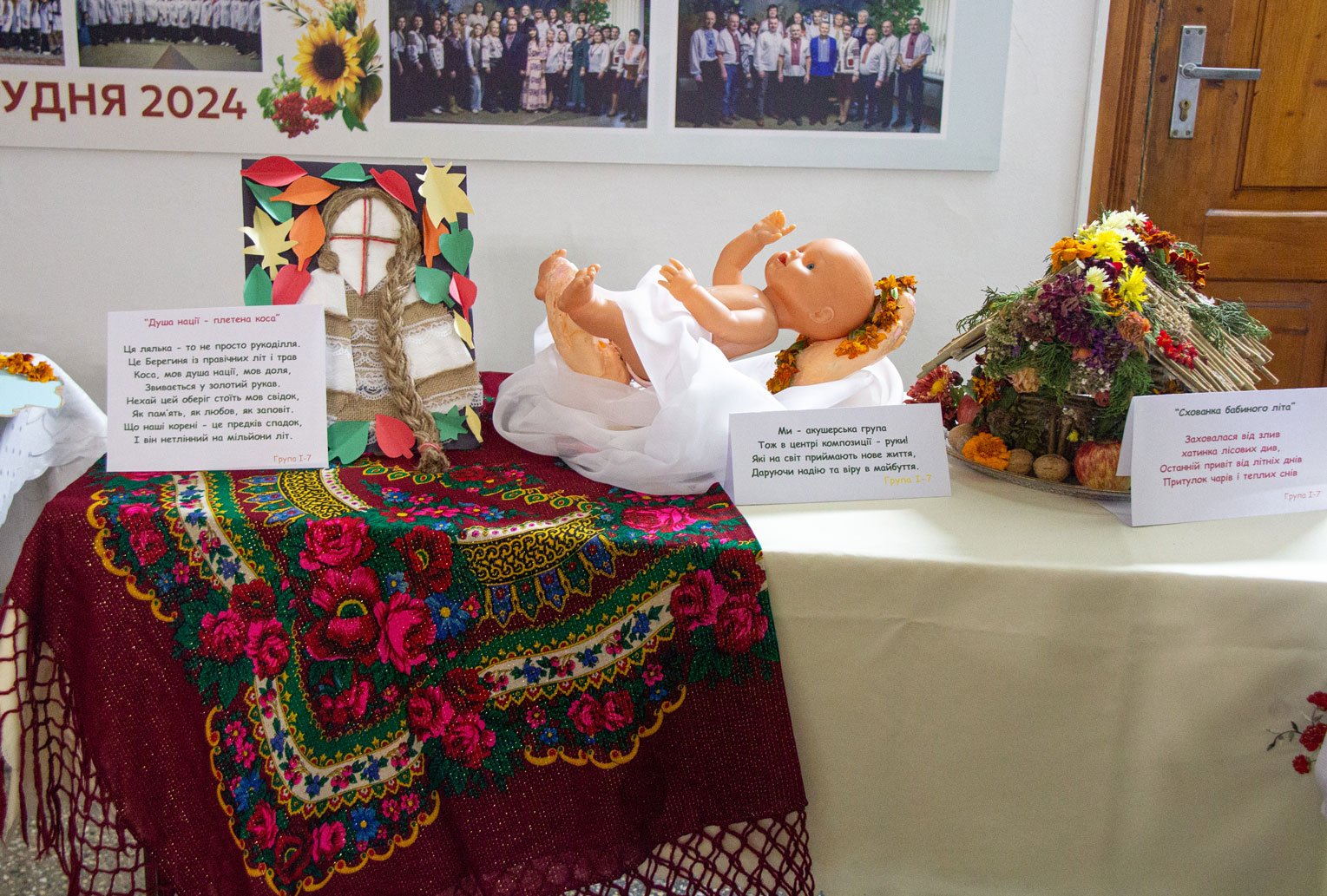 А першокурсники до такого календарного свята підготували свої творчі доробки. Кожна група на окремому столі презентувала по три композиції: на національно-патріотичну, медичну і довільну тематику. Оскільки це свято осені, основою композицій стали овочі, фрукти, квіти – дари природи, особливо щедрої саме восени.