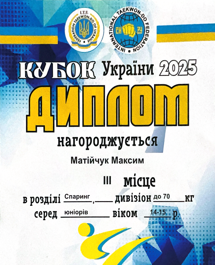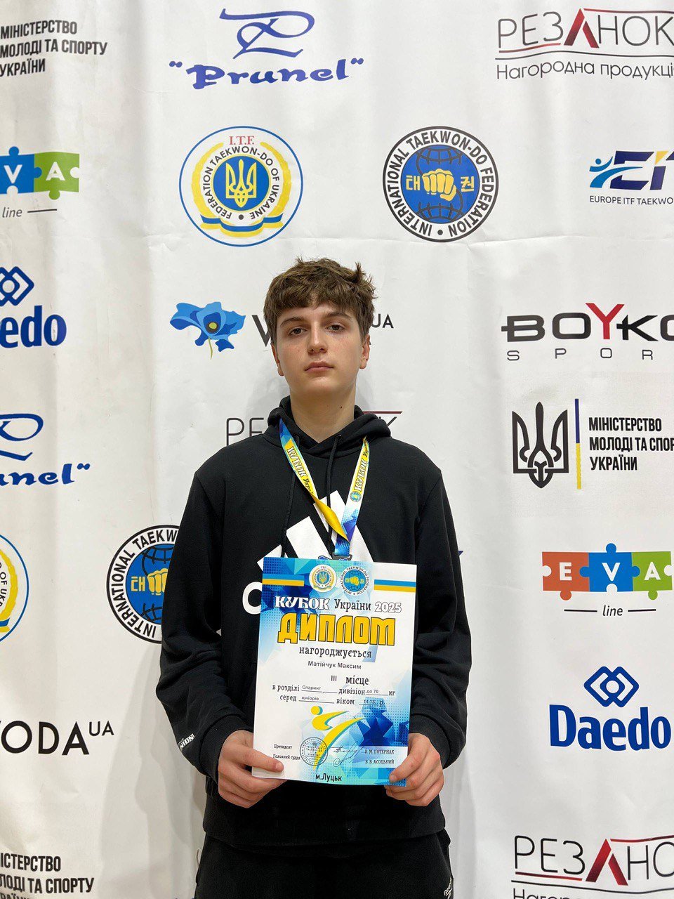 Кубок України з таеквондо (ІТФ) проходив у м. Луцьку з 13 по 16 листопада 2025 р. Максим МАТІЙЧУК виступав у розділі «Спаринг» у дивізіоні до 70 кілограмів серед юніорів віком 14 – 15 років.