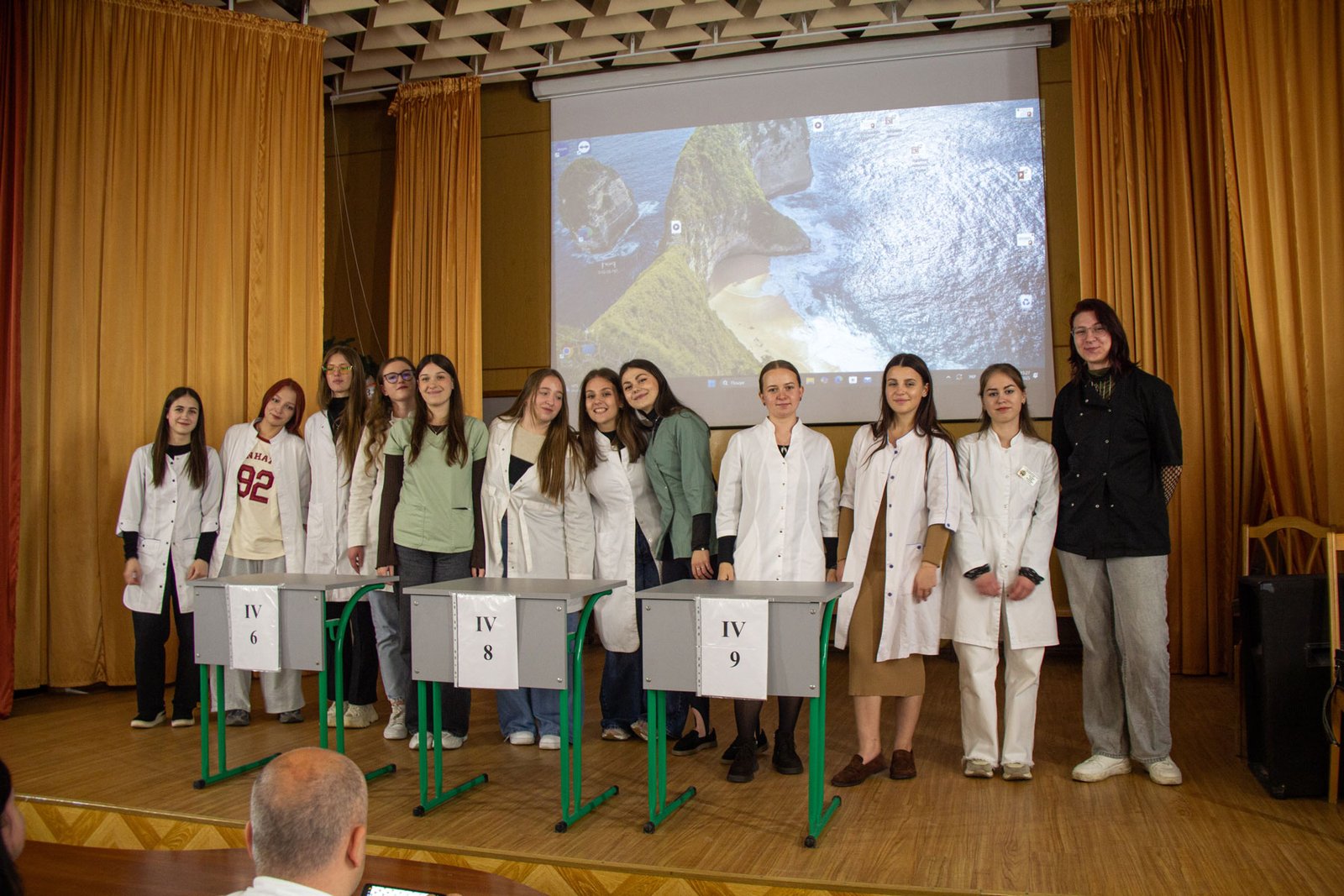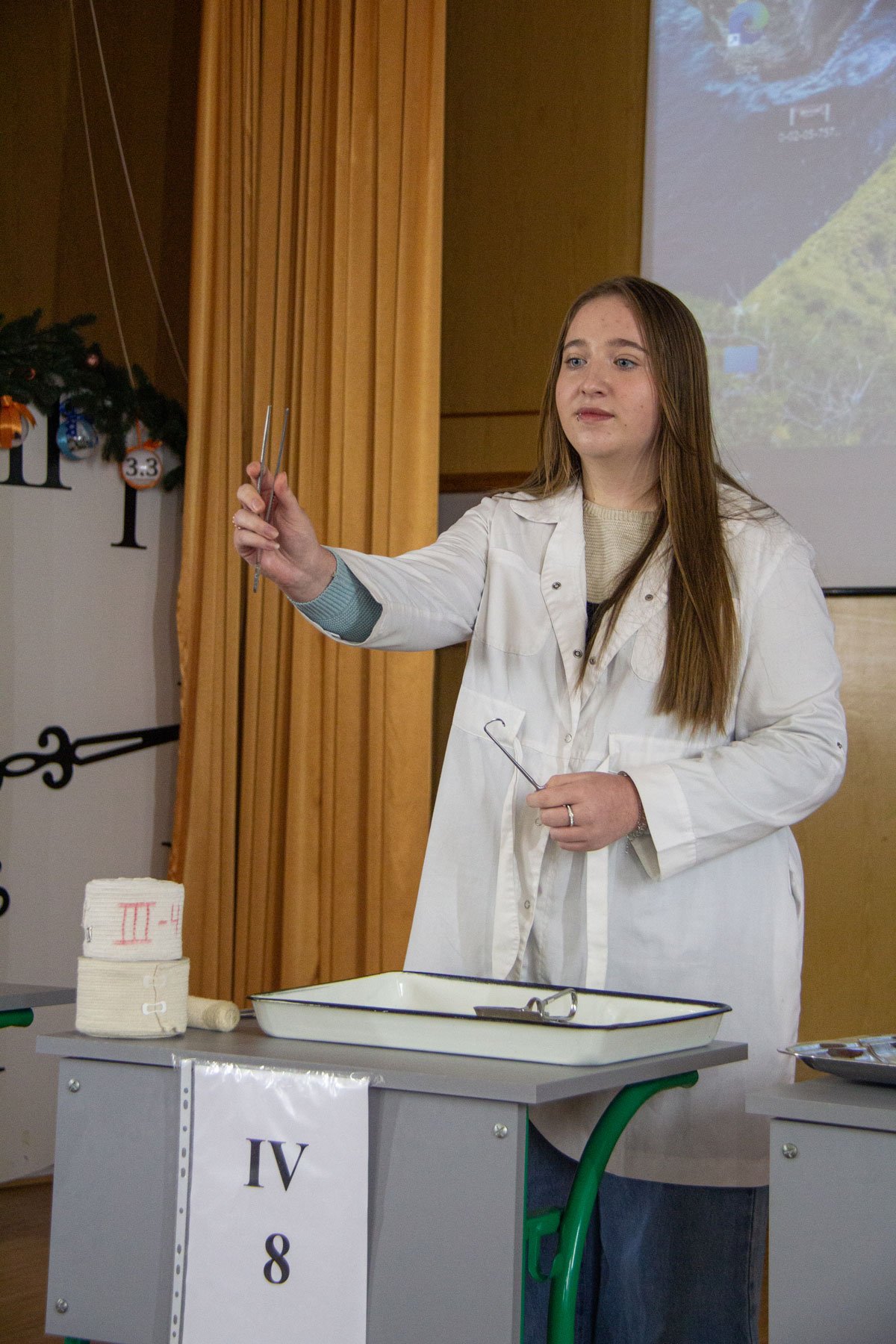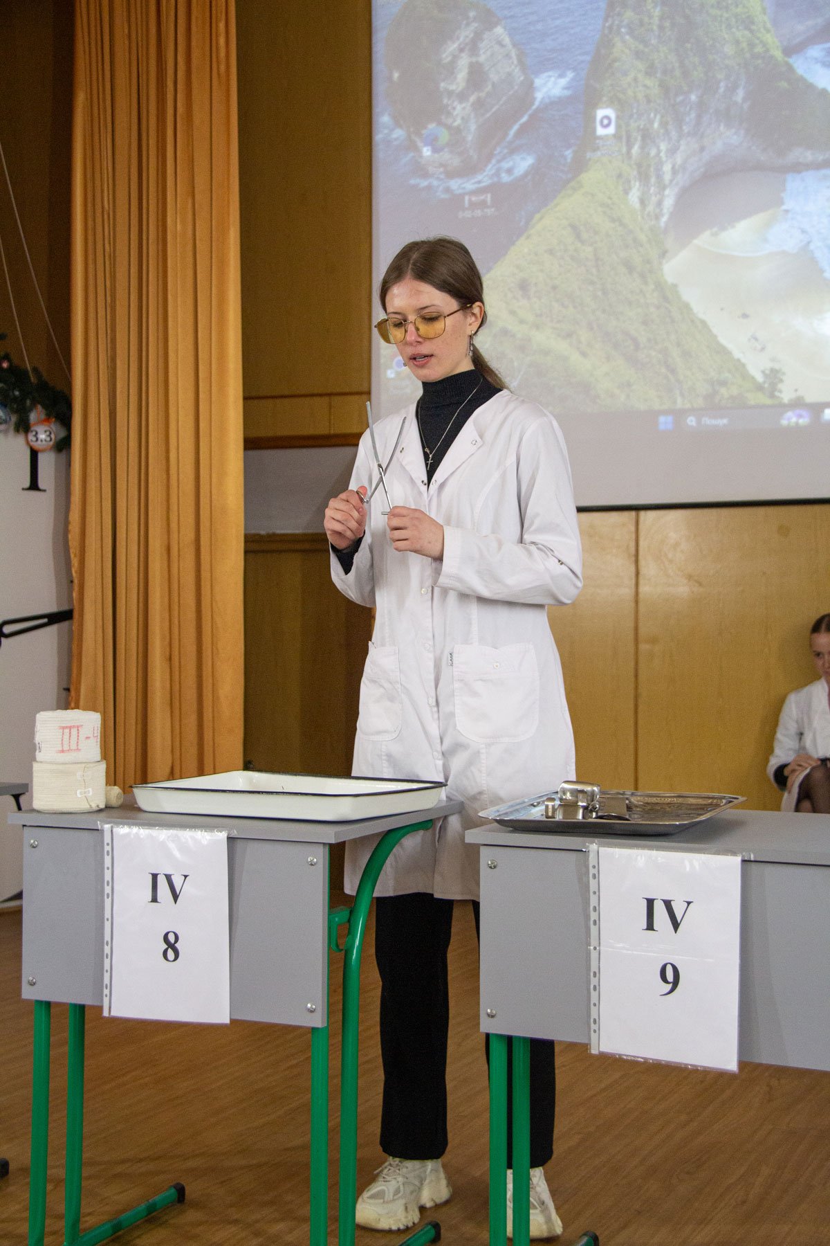 Три команди медсестринських груп четвертого курсу – 6, 8 і 9, у кожній по чотири здобувачі освіти, змагалися у чотирьох конкурсах: накладання кровоспинного джгута, накладання пов’язок, знання хірургічного інструментарію і загальні теоретичні питання. Практичні навики і теоретичні відповіді студентів оцінювало журі у складі заступника директора з навчально-виробничої роботи Василя ВАСИЛЮКА, викладачів хірургії Мар’яни ГОДОВАНЕЦЬ і Олександра ЦИБАНЬОВА. Журі визначало кращих після кожного етапу, а результати оголошував ведучий.