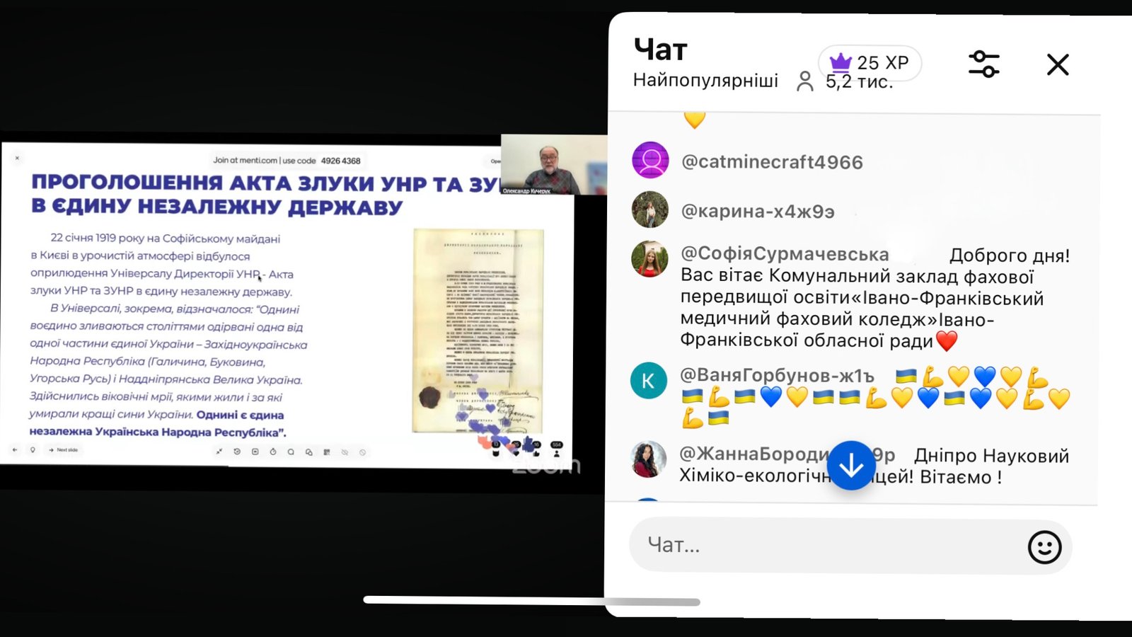 Здобувачі освіти груп різних курсів ОПП Сестринська справа, ОПП Лікувальна справа та ОПП Акушерська справа разом з кураторами взяли участь у спеціальному онлайн-уроці до Дня Соборності України, який провів Освітній центр Верховної Ради України на платформі Zoom із паралельною трансляцією на YouTube-каналі центру.