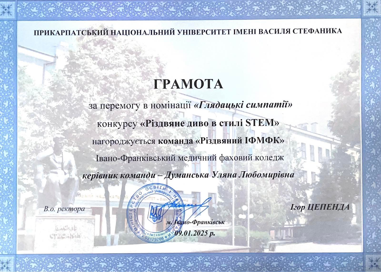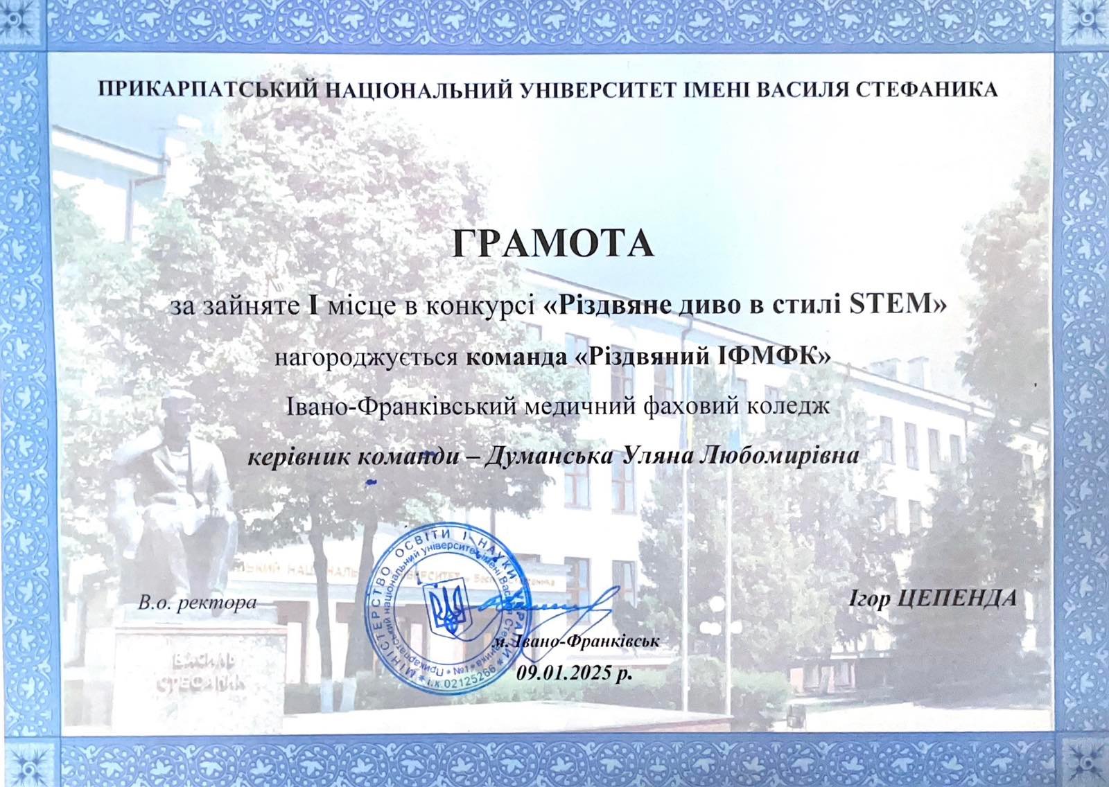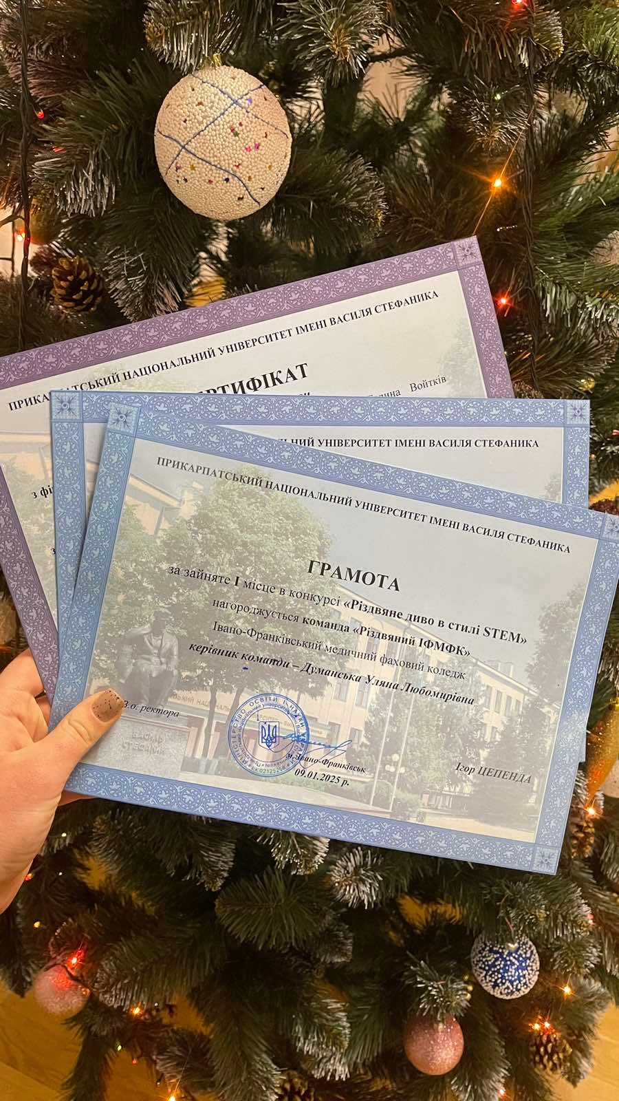 У конкурсі «Різдвяне диво в стилі STEM», який проводив Центр інноваційних методик навчання Прикарпатського національного університету імені Василя Стефаника, перемогли представники КЗФПО «Івано-Франківський медичний фаховий коледж» ІФОР (вул. Гетьмана Мазепи, 165): команда «Різдвяний ІФМФК» – здобувачка освіти першого курсу ОПП Сестринська справа Мар’яна Новіцька, керівниця Уляна ДУМАНСЬКА.