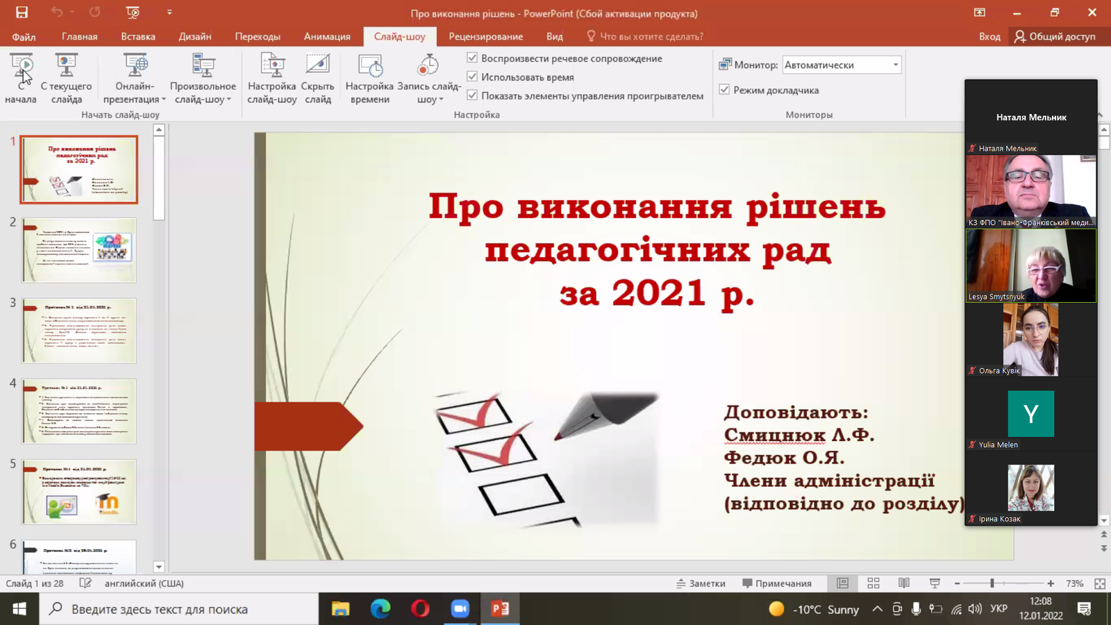 Секретар педагогічної ради Леся Федорівна Смицнюк поінформувала про виконання рішень попередніх педрад. У 2021 році їх було 9, 95% рішень виконано. А інженер з техніки безпеки коледжу Василь Васильович Гевюк повідомив, що 17 січня буде проведена перевірка журналів з охорони праці і пожежної безпеки.