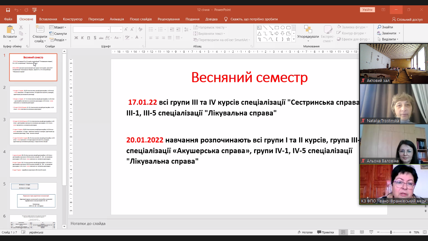 Заступниця директора з навчально-методичної роботи Олександра Денисівна Воєвода поінформувала, як розпочнеться весняний семестр. З 17 січня до навчання приступлять всі групи ІІІ і ІV курсів спеціалізації "Сестринська справа", 1 і 5 груп ІІІ спеціалізації "Лікувальна справа". З 20 січня вчитимуться студенти І і ІІ курсів, 7 групи ІІІ курсу та 1 і 5 груп ІV курсу. Навчання для усіх розпочнеться з дистанційної начитки лекцій. Потім - змішана форма навчання.