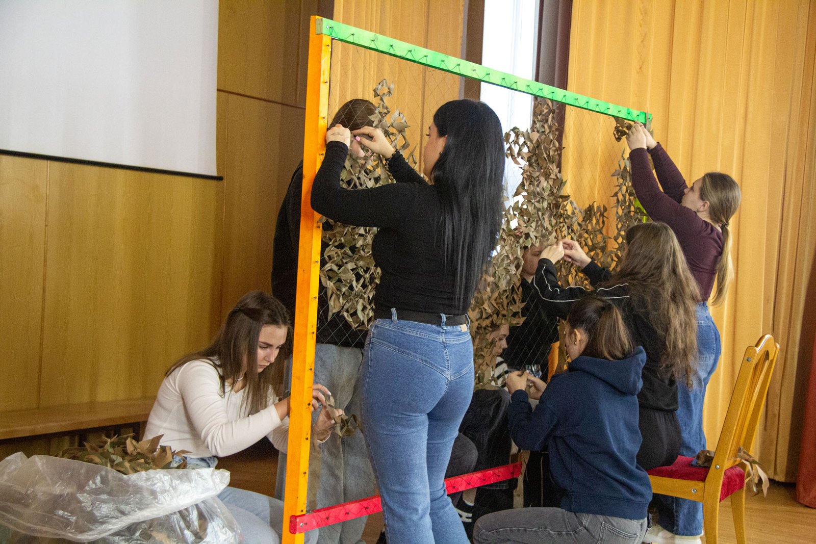Сюди приходитимуть студенти на перервах, під час занять з фізичного виховання, у вільний час після пар, щоб долучитися до волонтерської справи. Стрічка до стрічки, вузлик за вузликом – так створюватимуться сітки, які забезпечать невидимість військовим на передовій. Матеріали для виготовлення сіток надає волонтерський центр «Маскувальні справи».