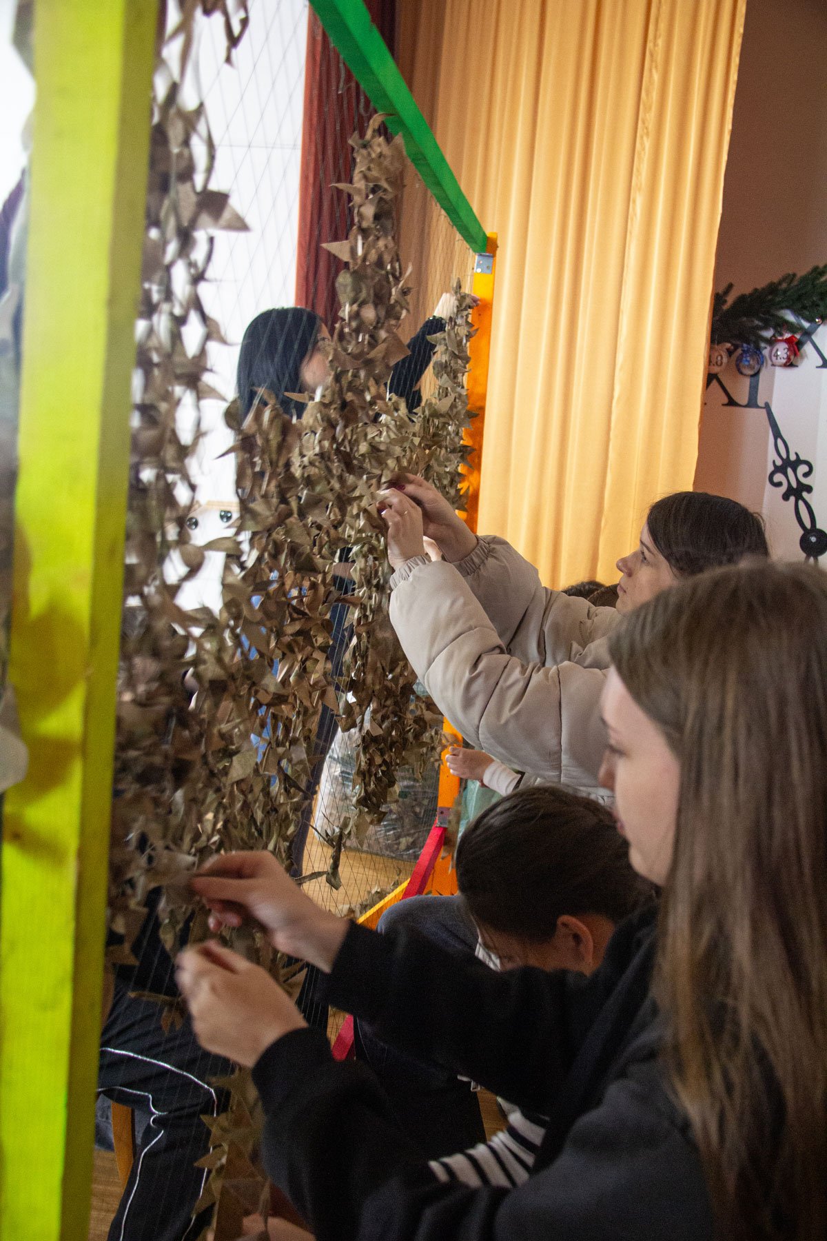 Якщо раніше здобувачі освіти випускного курсу під керівництвом голови циклової комісії військово-медичної підготовки, захисту України та фізичного виховання Петра ГОДОВАНЦЯ приходили у парафіяльно-гарнізонний храм Різдва Христового ПЦУ неподалік коледжу, щоб плести маскувальні сітки для наших захисників, то тепер відкрили локацію для такої важливої ініціативи безпосередньо у коледжі – в актовій залі.
