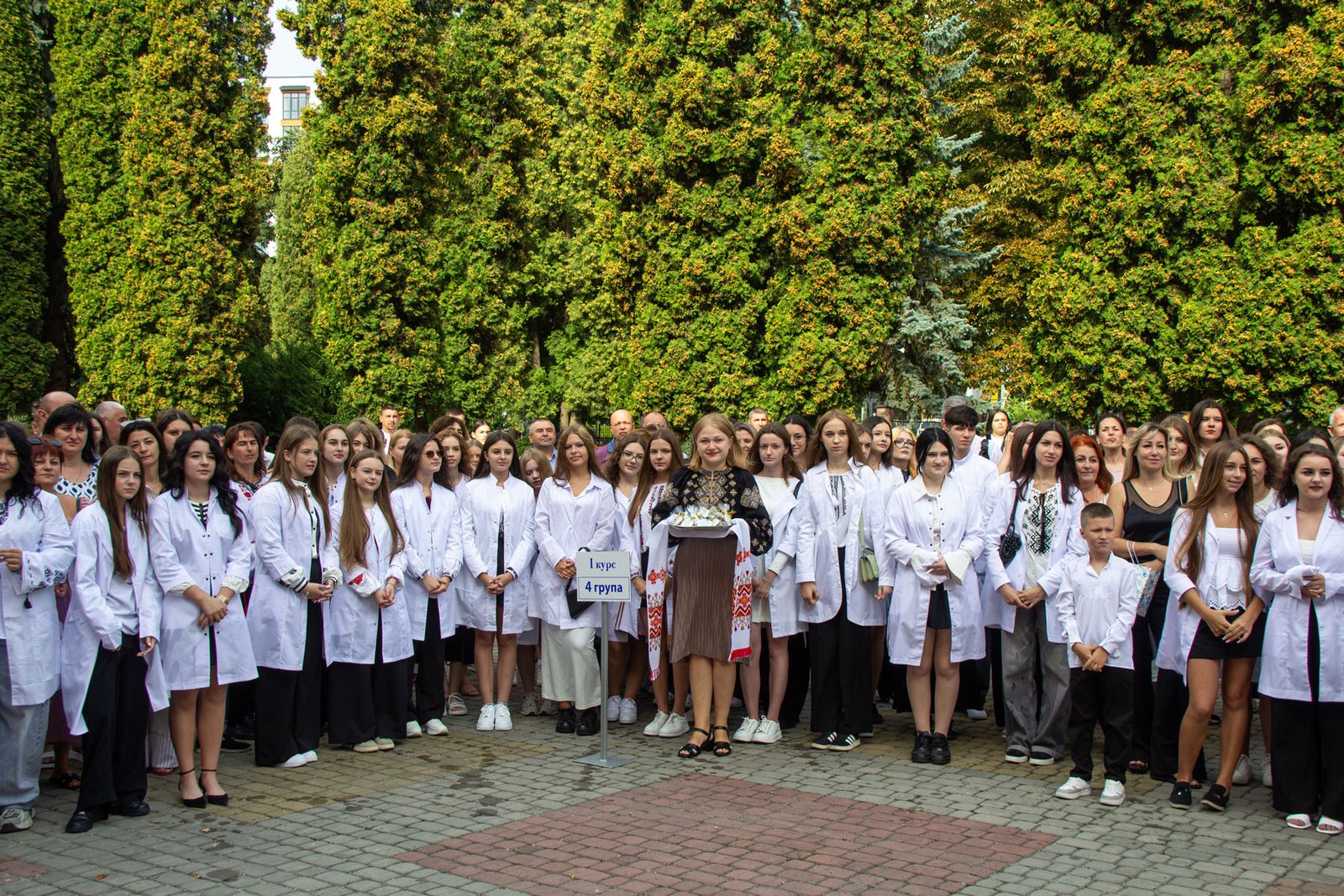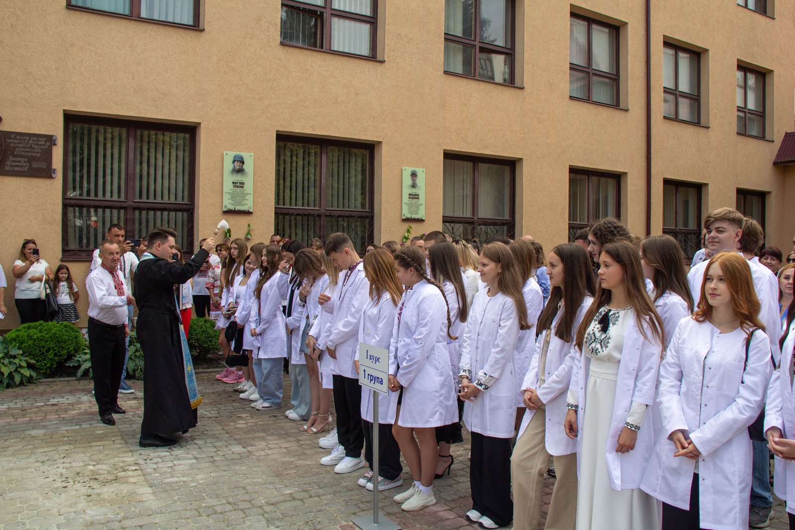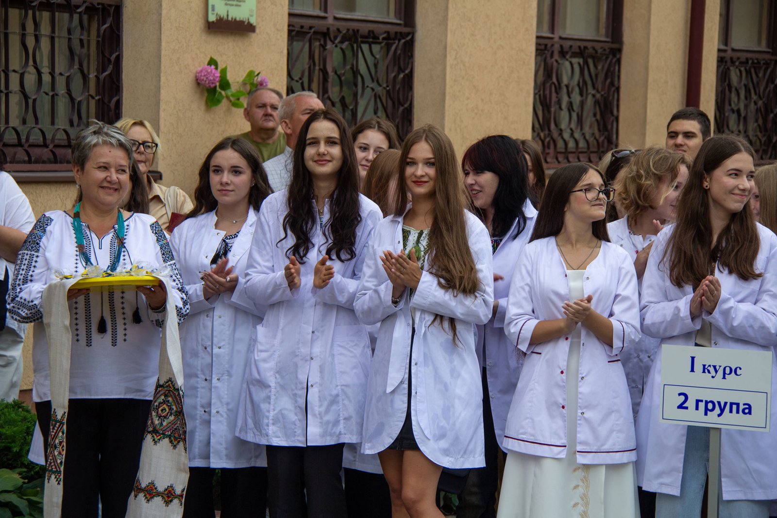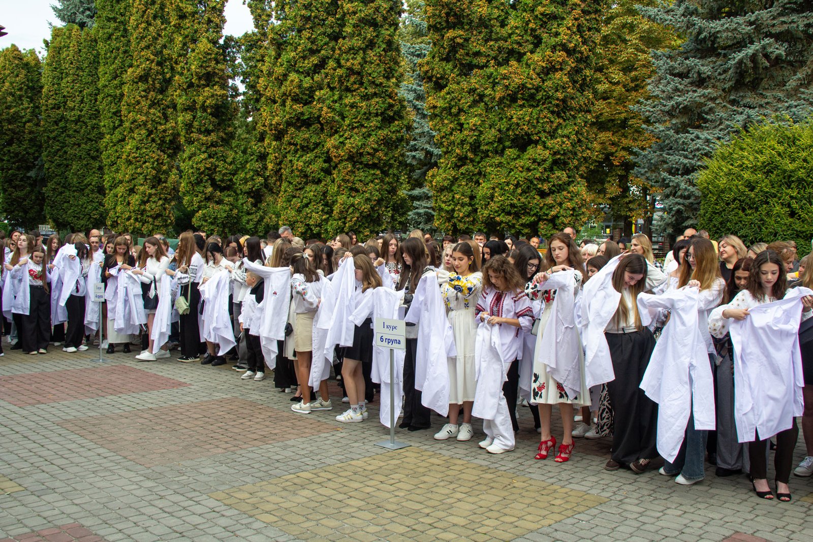Розпочалася посвята словами вдячності захисникам і захисницям, які боронять Україну від московитів, та хвилиною молитви за загиблими у війні. А після того, як урочистості відкрив Гімн України, здобувачі освіти одягнули білі халати – символ майбутнього фаху, чистоти покликання медичного працівника.