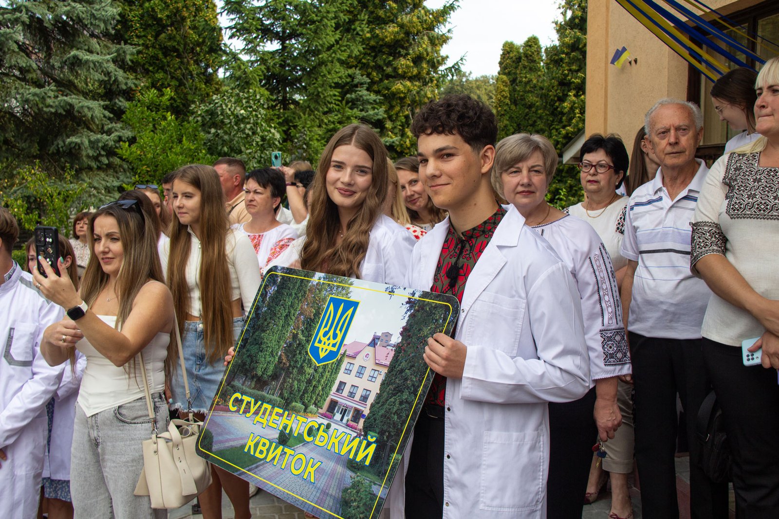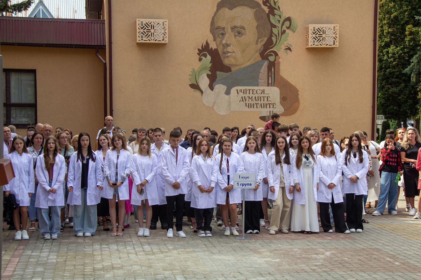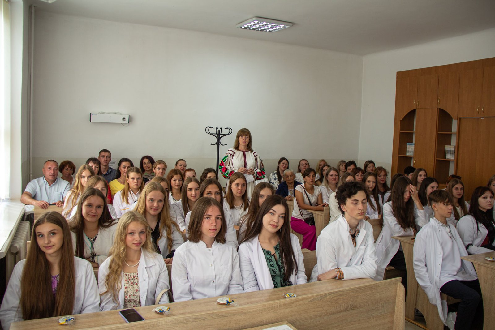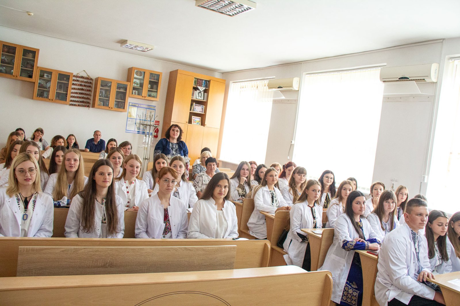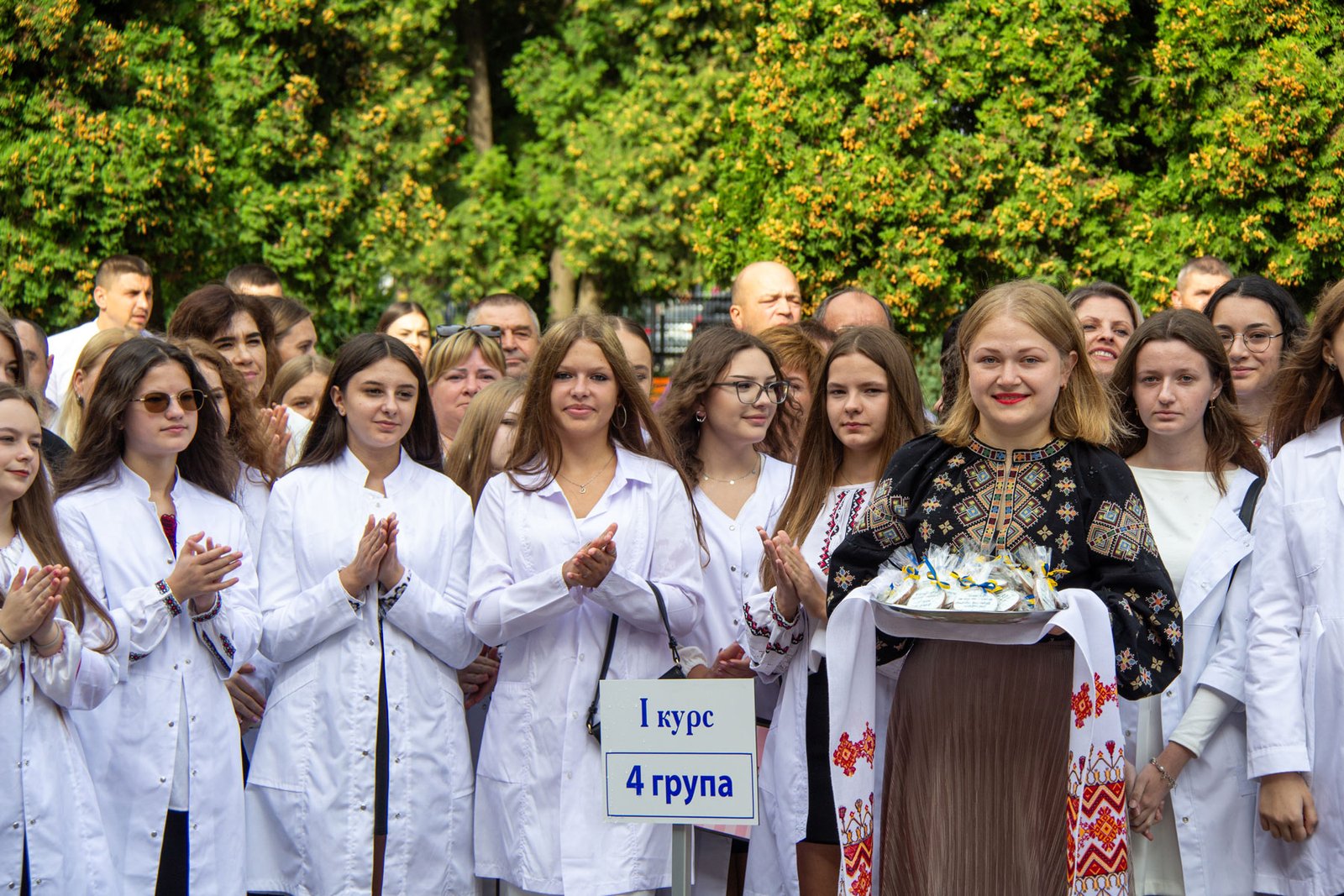 Розпочалася посвята словами вдячності захисникам і захисницям, які боронять Україну від московитів, та хвилиною молитви за загиблими у війні. А після того, як урочистості відкрив Гімн України, здобувачі освіти одягнули білі халати – символ майбутнього фаху, чистоти покликання медичного працівника.