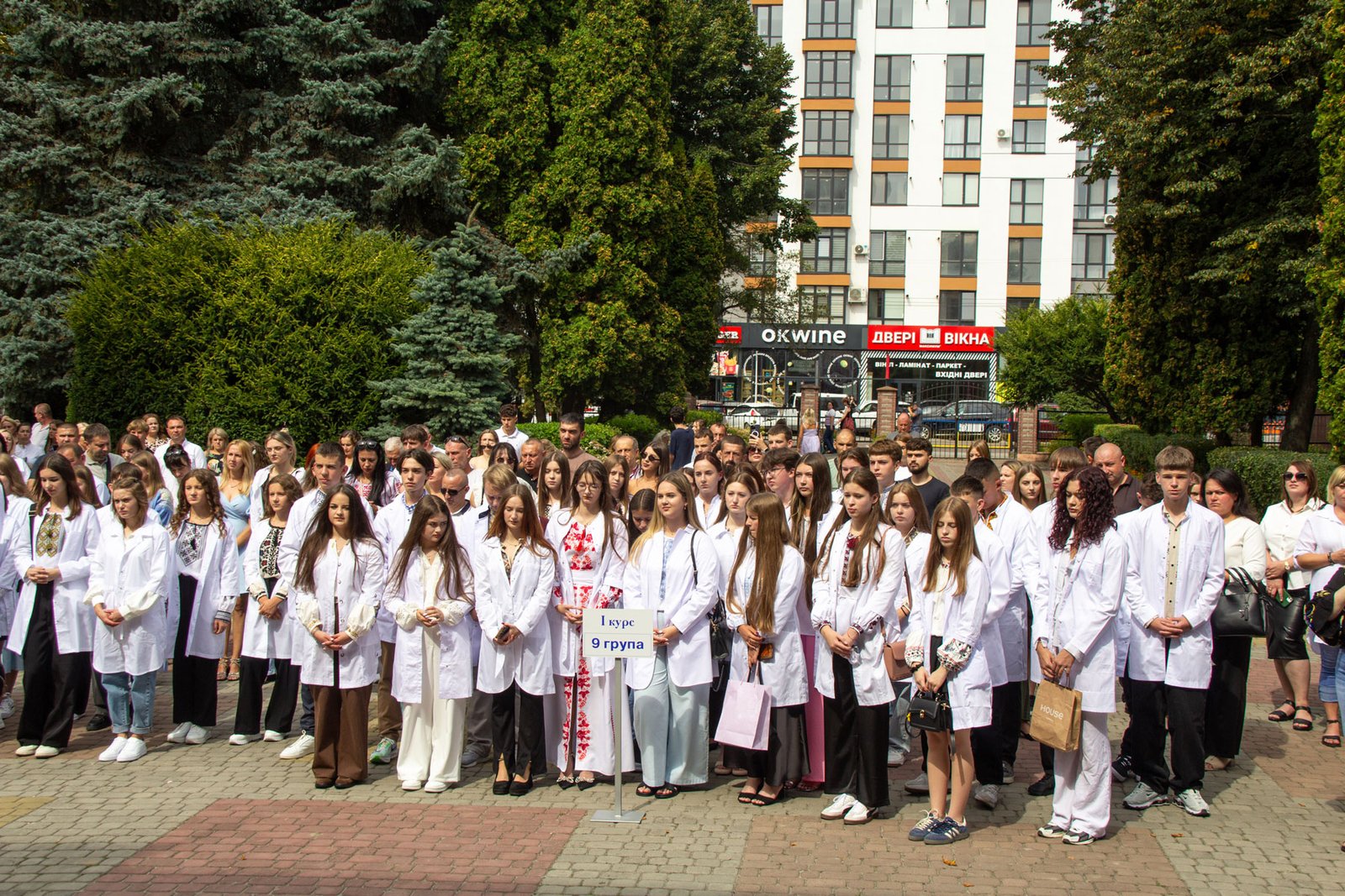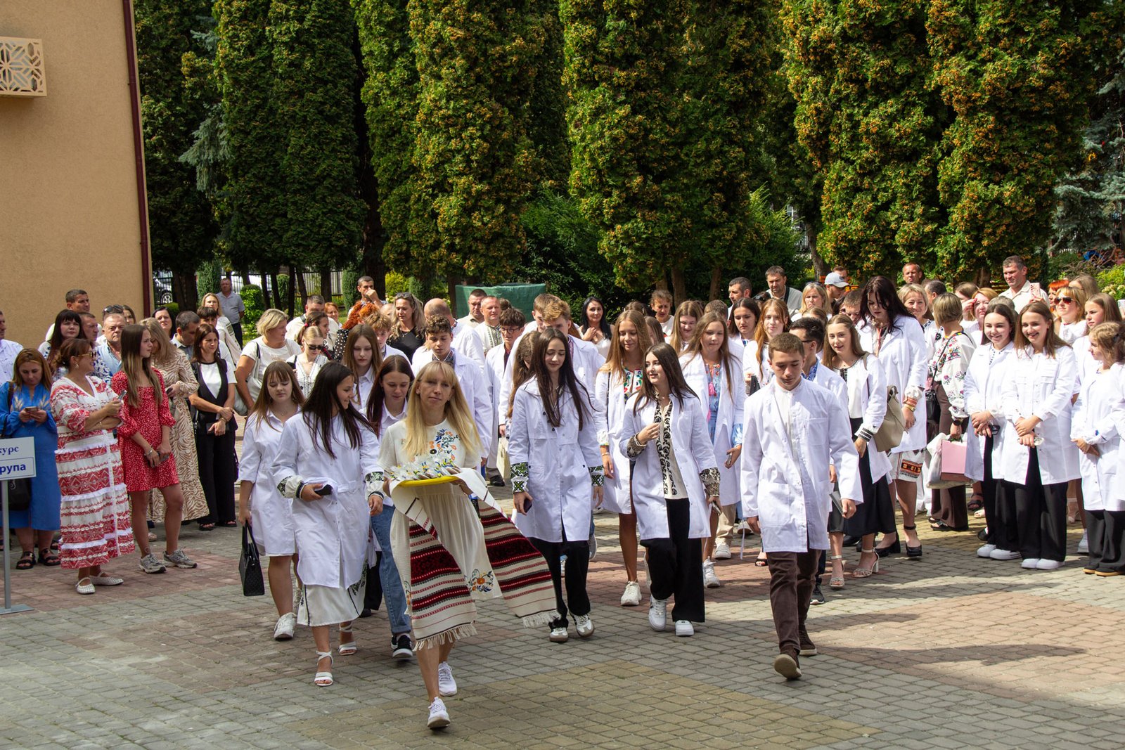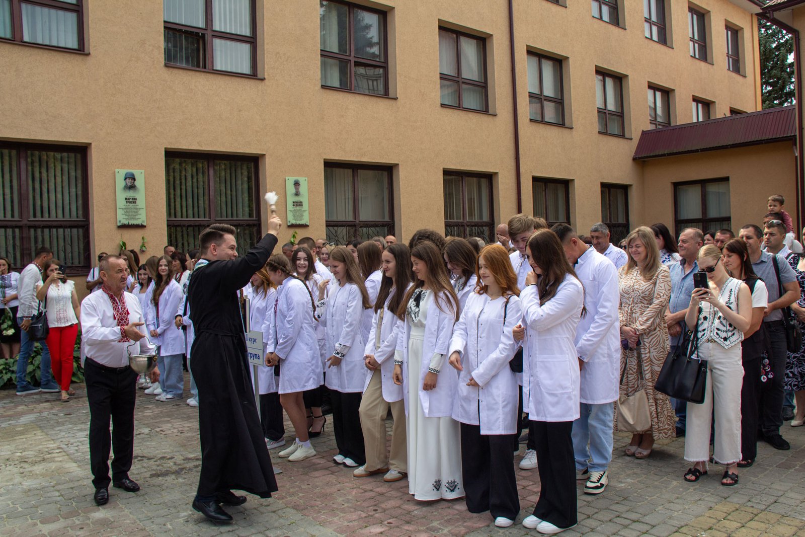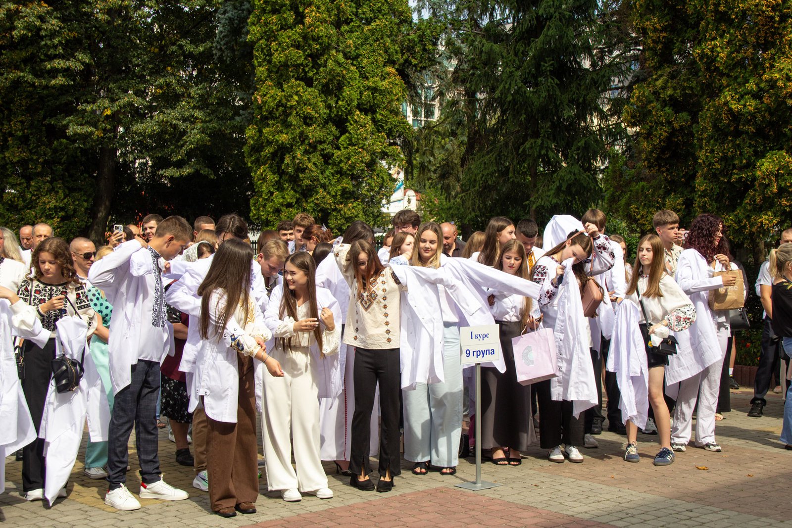 Розпочалася посвята словами вдячності захисникам і захисницям, які боронять Україну від московитів, та хвилиною молитви за загиблими у війні. А після того, як урочистості відкрив Гімн України, здобувачі освіти одягнули білі халати – символ майбутнього фаху, чистоти покликання медичного працівника.