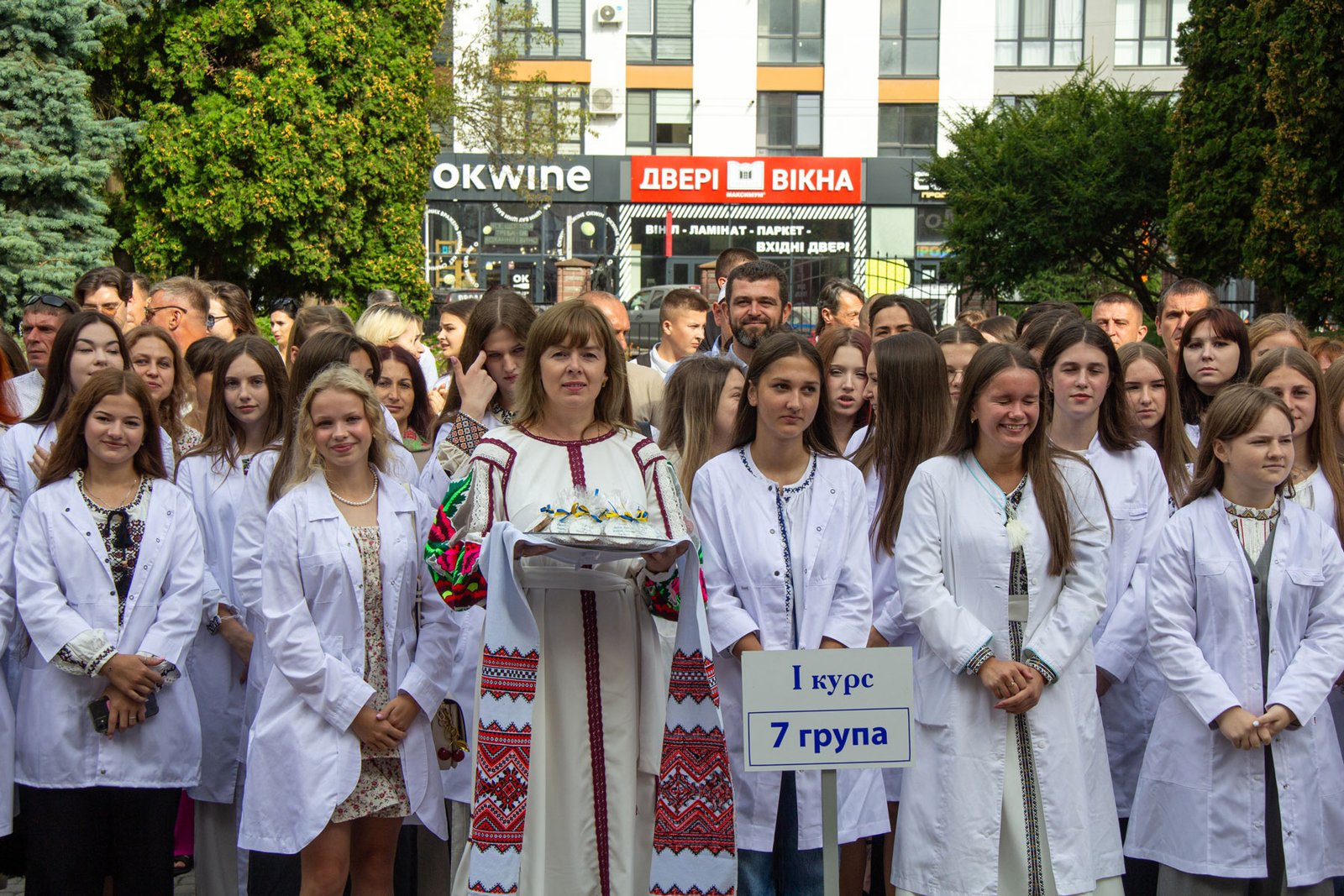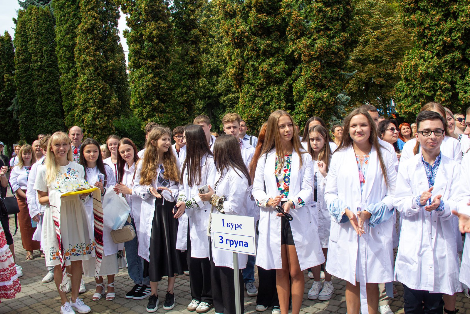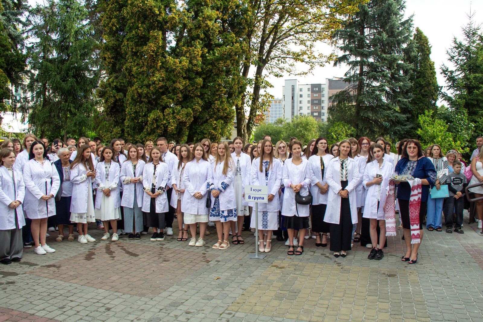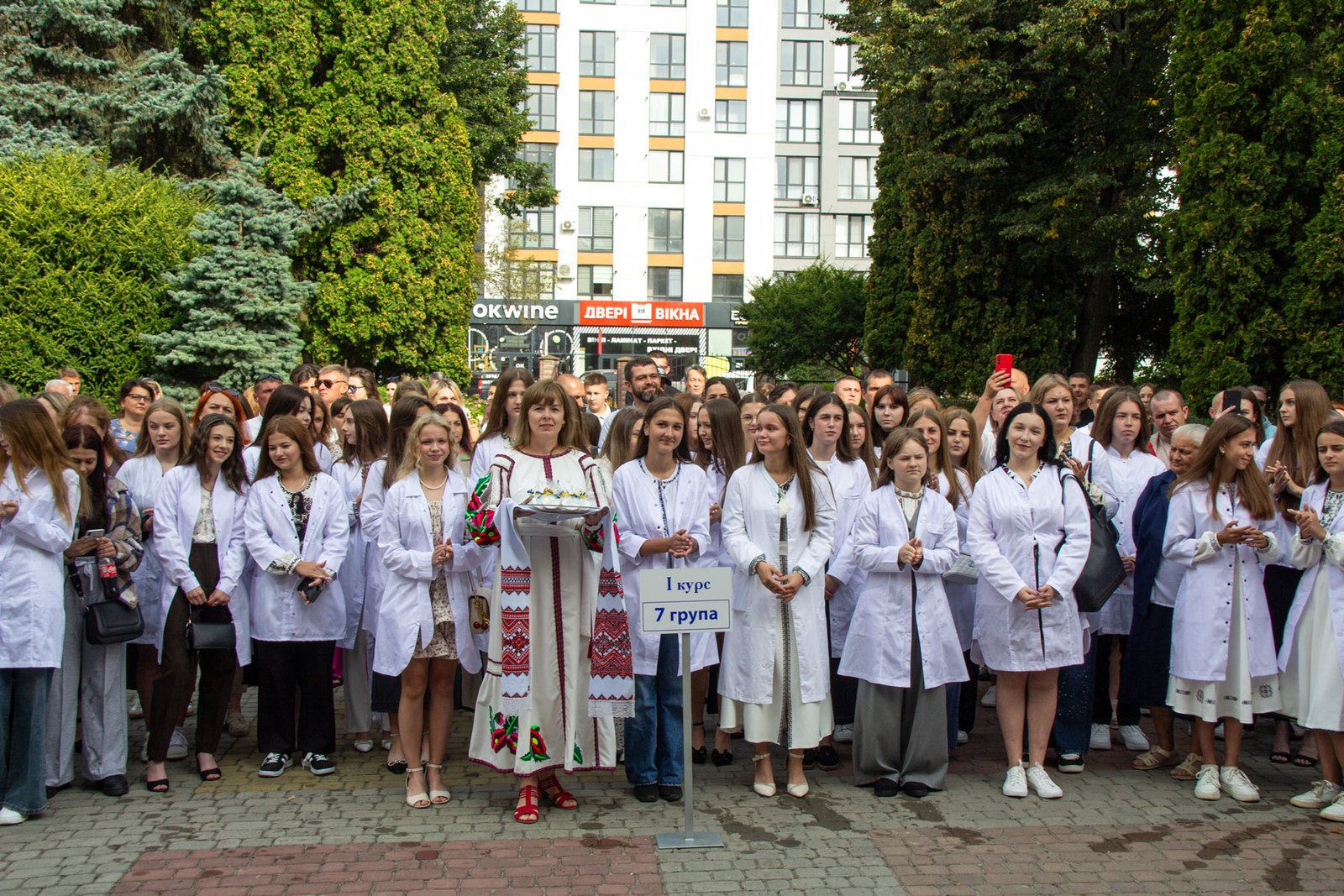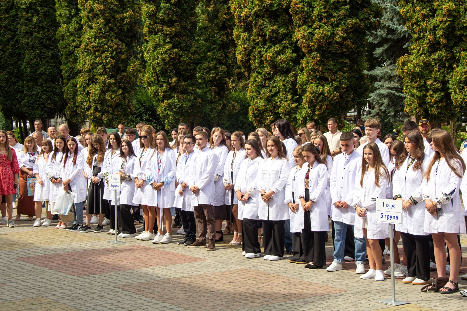 Розпочалася посвята словами вдячності захисникам і захисницям, які боронять Україну від московитів, та хвилиною молитви за загиблими у війні. А після того, як урочистості відкрив Гімн України, здобувачі освіти одягнули білі халати – символ майбутнього фаху, чистоти покликання медичного працівника.