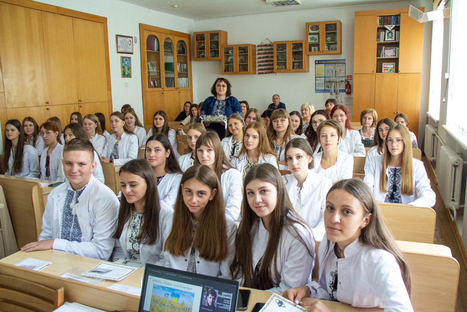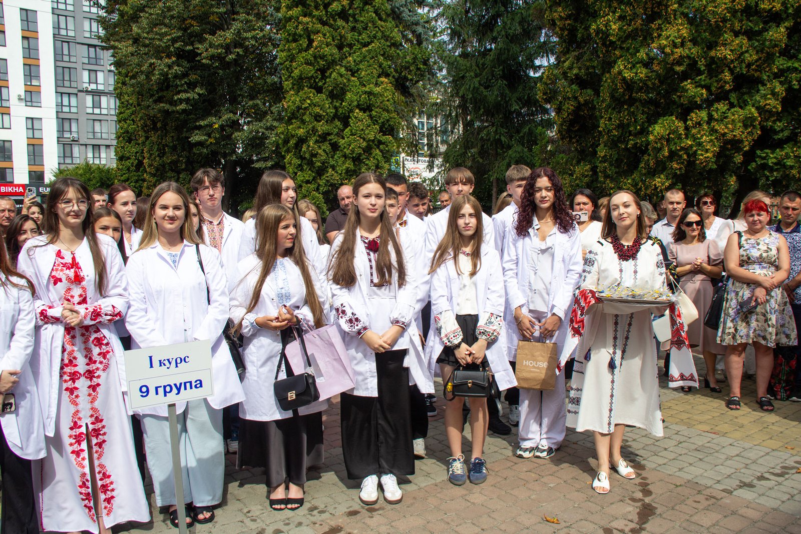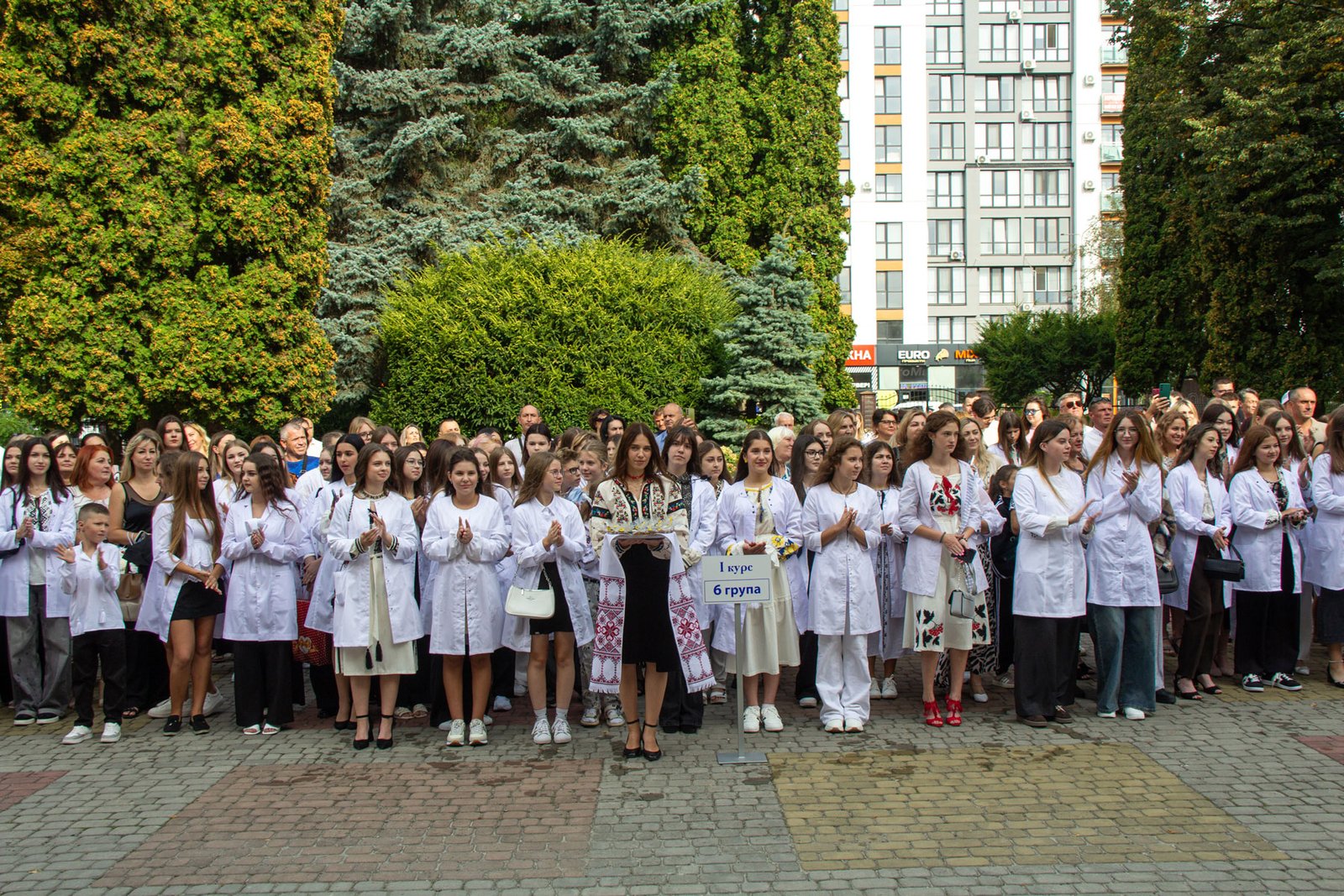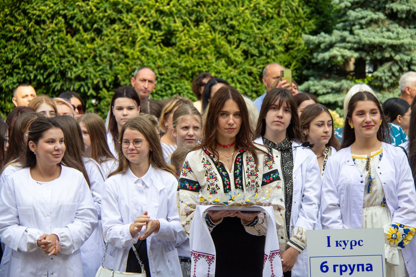 Розпочалася посвята словами вдячності захисникам і захисницям, які боронять Україну від московитів, та хвилиною молитви за загиблими у війні. А після того, як урочистості відкрив Гімн України, здобувачі освіти одягнули білі халати – символ майбутнього фаху, чистоти покликання медичного працівника.