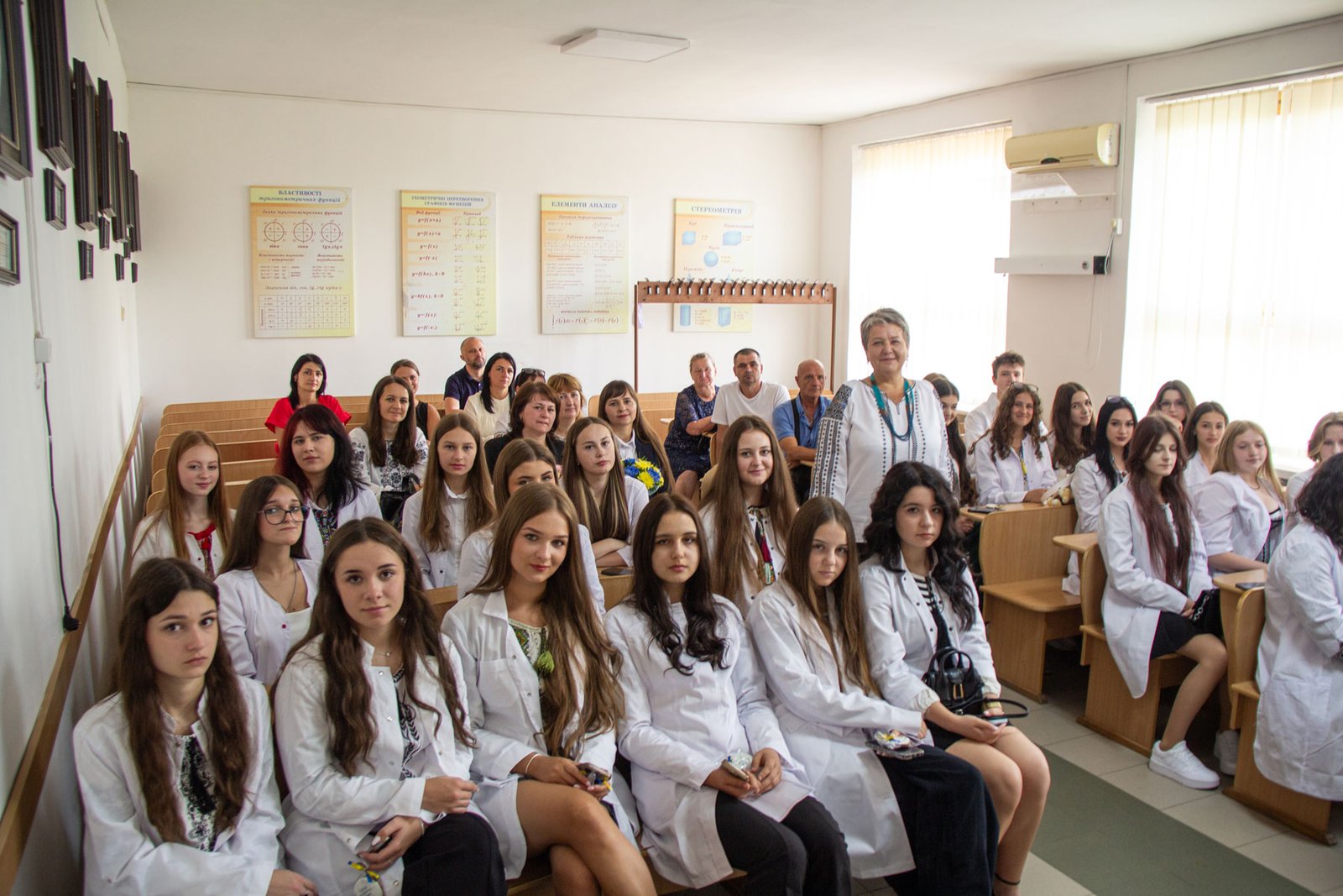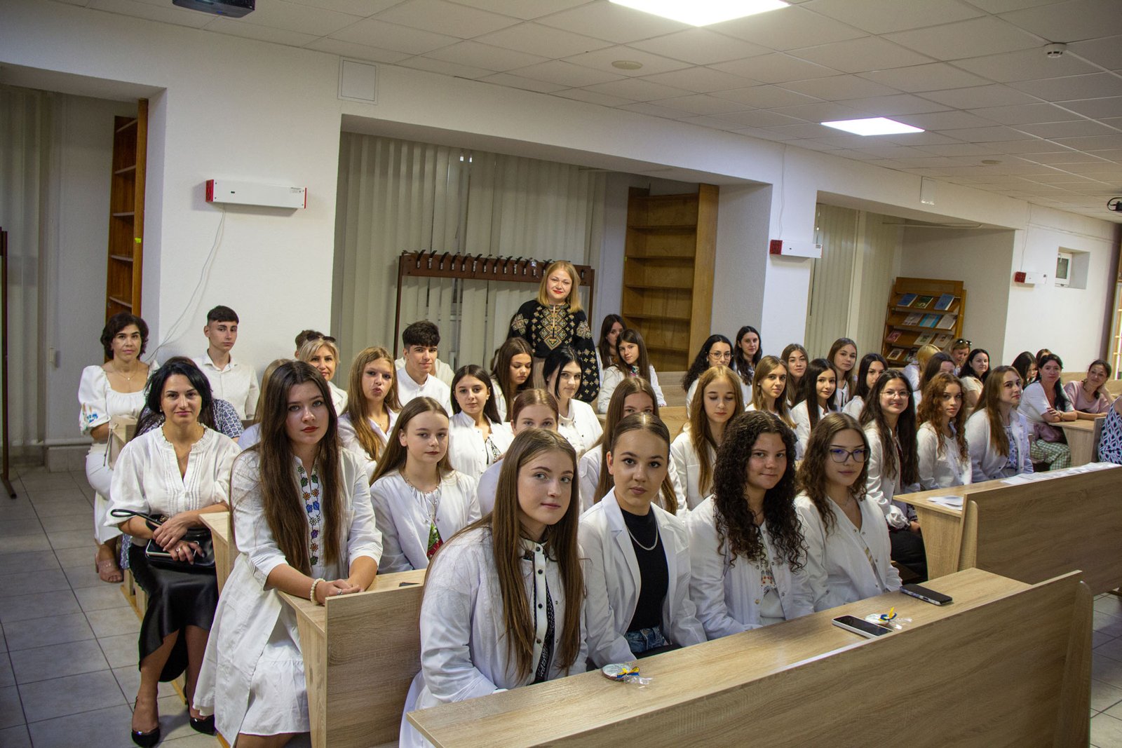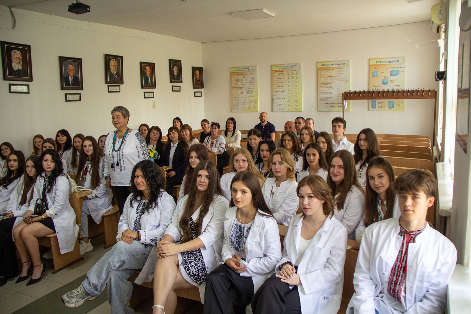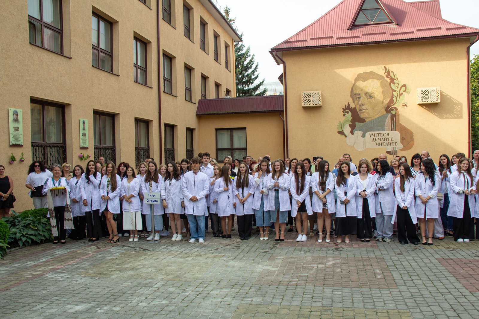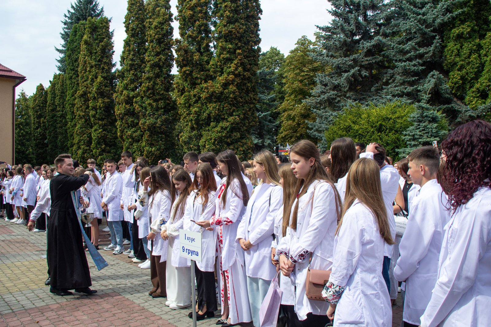 Розпочалася посвята словами вдячності захисникам і захисницям, які боронять Україну від московитів, та хвилиною молитви за загиблими у війні. А після того, як урочистості відкрив Гімн України, здобувачі освіти одягнули білі халати – символ майбутнього фаху, чистоти покликання медичного працівника.