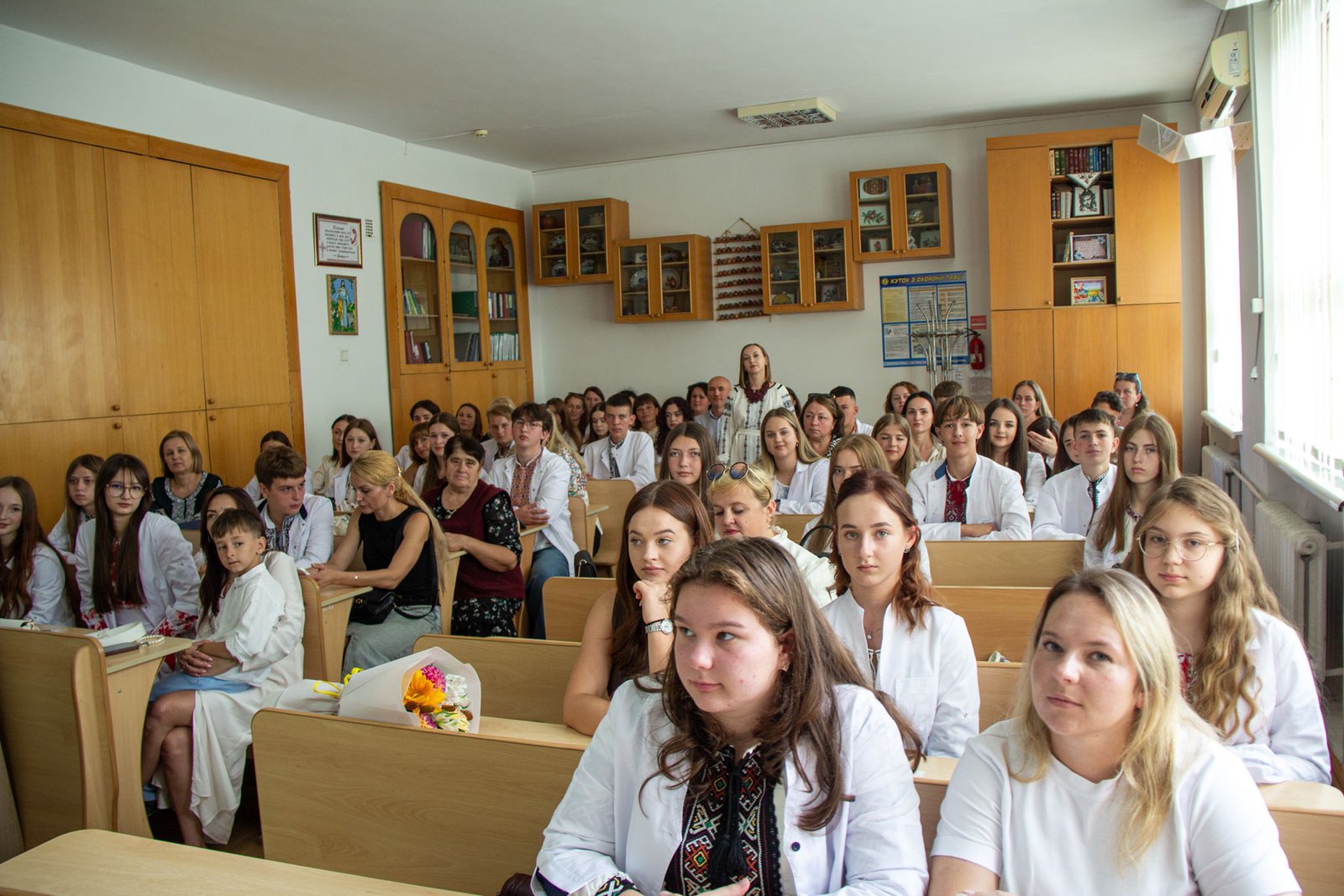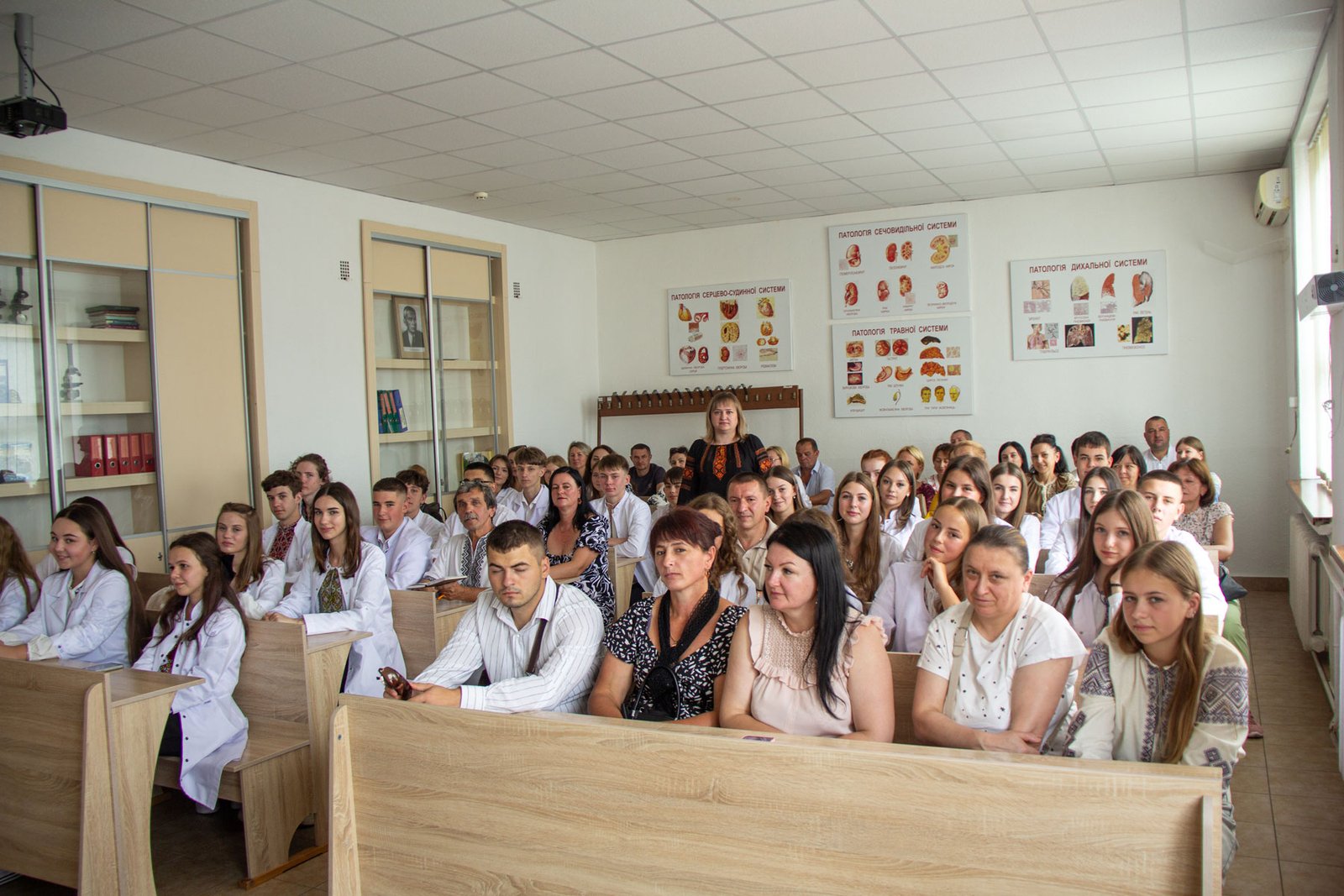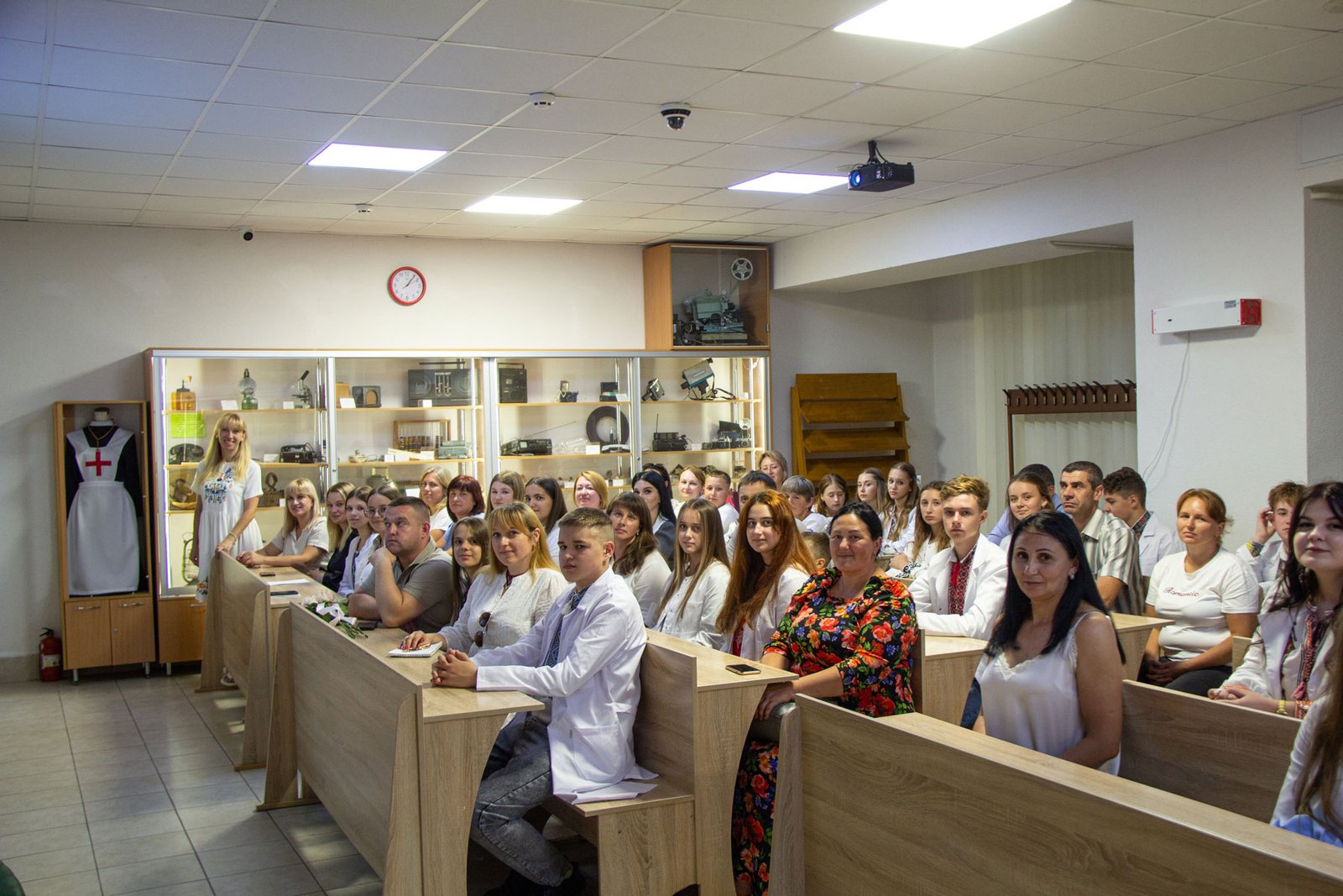 Урочисту посвяту вирішили проводити у два етапи – і з міркувань безпеки у воєнний час, і для можливостей прийняти не лише першокурсників, а й їхніх рідних, що прийшли розділити з ними цю щасливу мить. Першими на церемонію посвяти прийшли здобувачі чотирьох груп ОПП Сестринська справа і групи ОПП Акушерська справа, а згодом – чотирьох груп ОПП Лікувальна справа та студенти, зараховані на базі 11 класу.