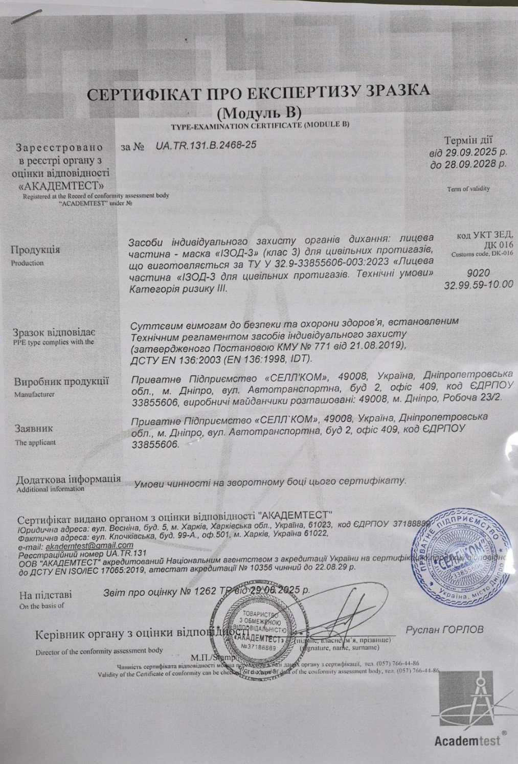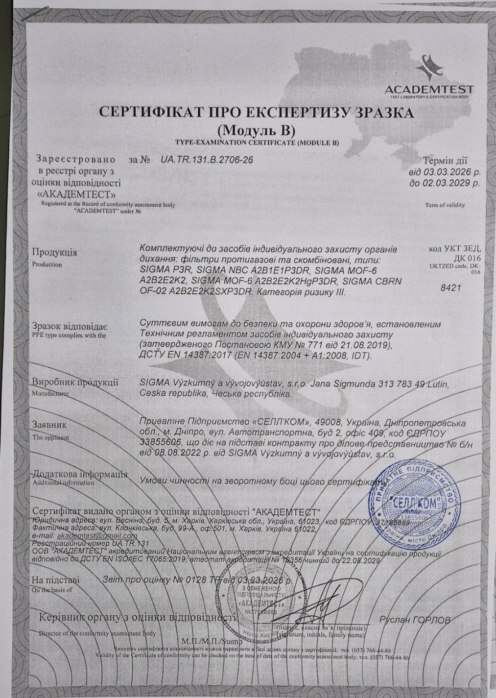 Засоби індивідуального захисту є сучасними і сертифікованими, відповідають вимогам до безпеки та охорони здоров’я. Складаються протигази з маски та фільтру чеського виробництв. Є надійним варіантом для цивільного захисту, насамперед органів дихання і шкіри обличчя.