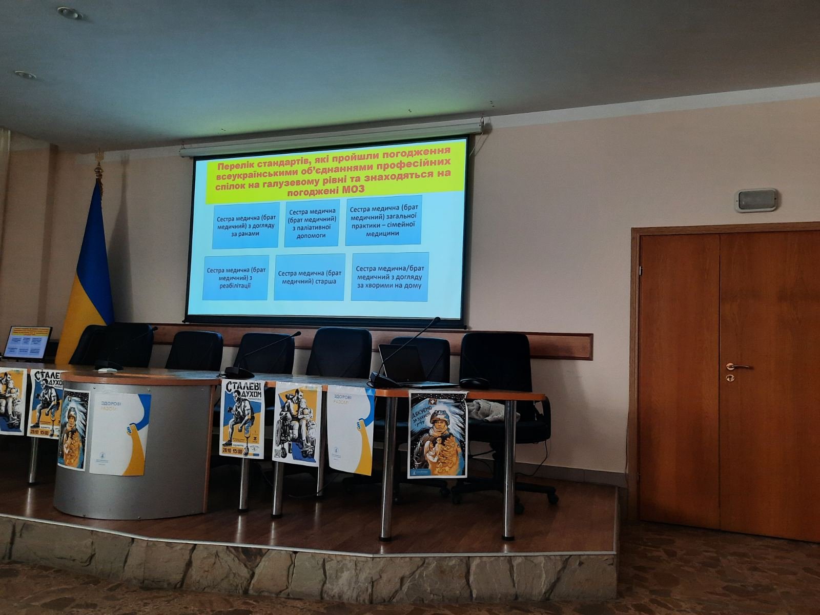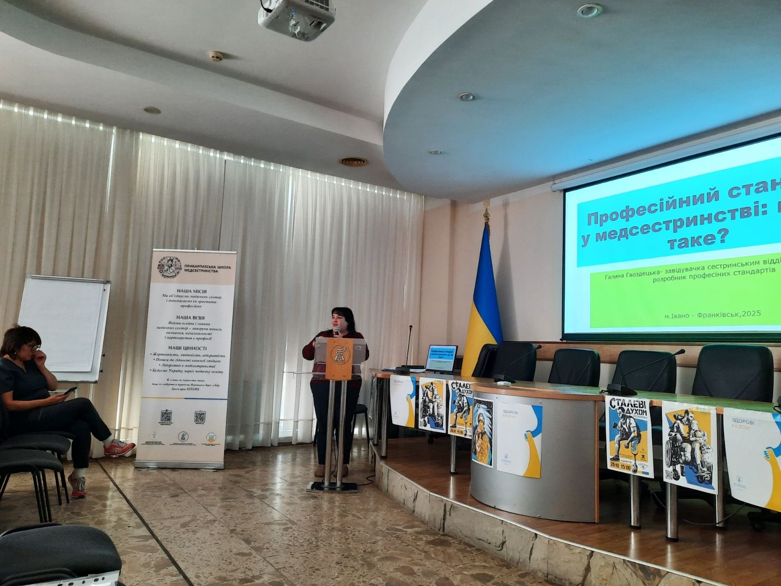 Завідувачка медсестринським відділенням медичного фахового коледжу Івано-Франківського національного медичного університету, експертка з розробки професійних стандартів «Сестра медична/брат медичний з паліативу» Галина Гвоздецька доповіла про стан підготовки професійних стандартів у медсестринстві, механізм їх розробки.