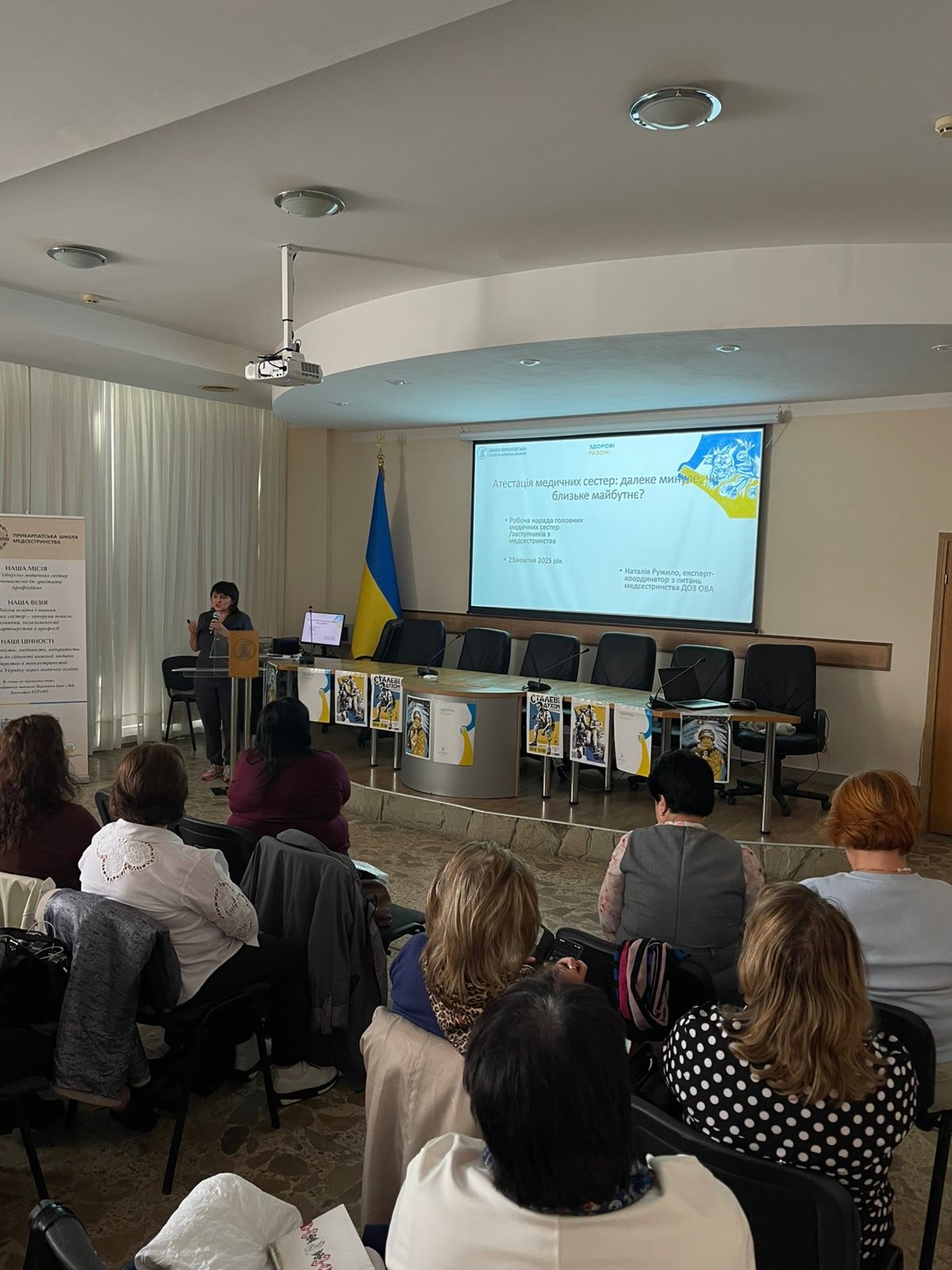Наталія Ружило ознайомила присутніх зі змінами у проведенні атестації фахівців відповідно до наказу МОЗ України № 650 від 16.04.2025 «Про затвердження Порядку проведення атестації працівників сфери охорони здоров’я та внесення змін до деяких наказів Міністерства охорони здоров’я України».