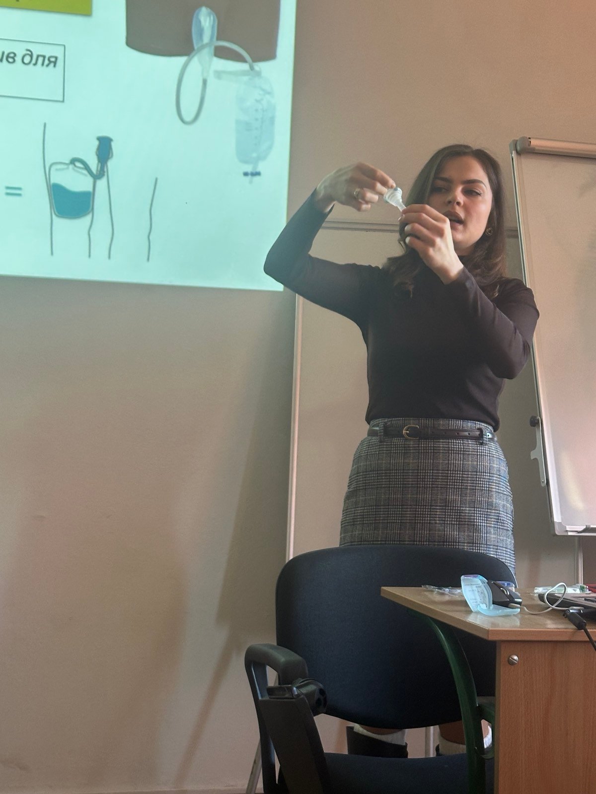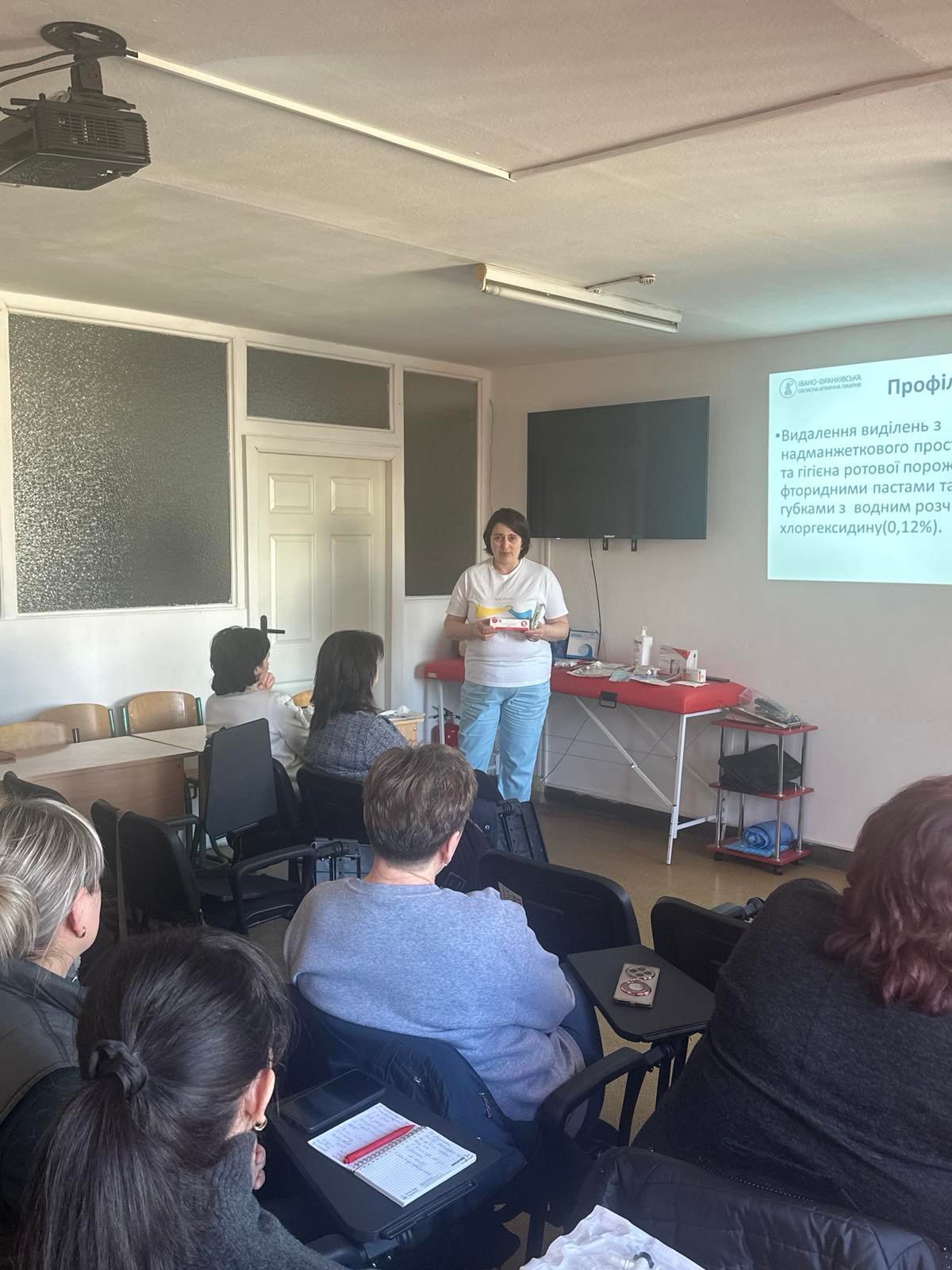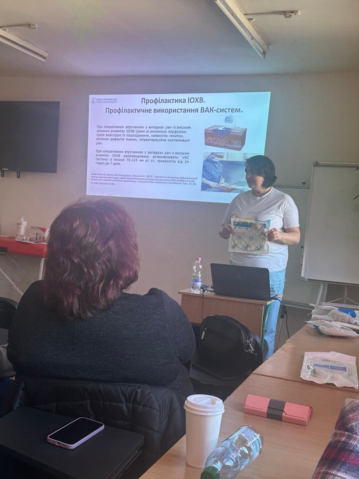 Слухачі відпрацювали навички безпечного догляду за центральним венозним та периферичним катетерами, заповнення форм збору даних КАІК, пов’язаних з центральним судинним та з периферичним судинним катетерами; догляду за сечовим катетером; догляду за трахеостомічною трубкою і проведення санації дихальних шляхів пацієнта; догляду за післяопераційною раною та забору біологічного матеріалу для мікробіологічного дослідження.