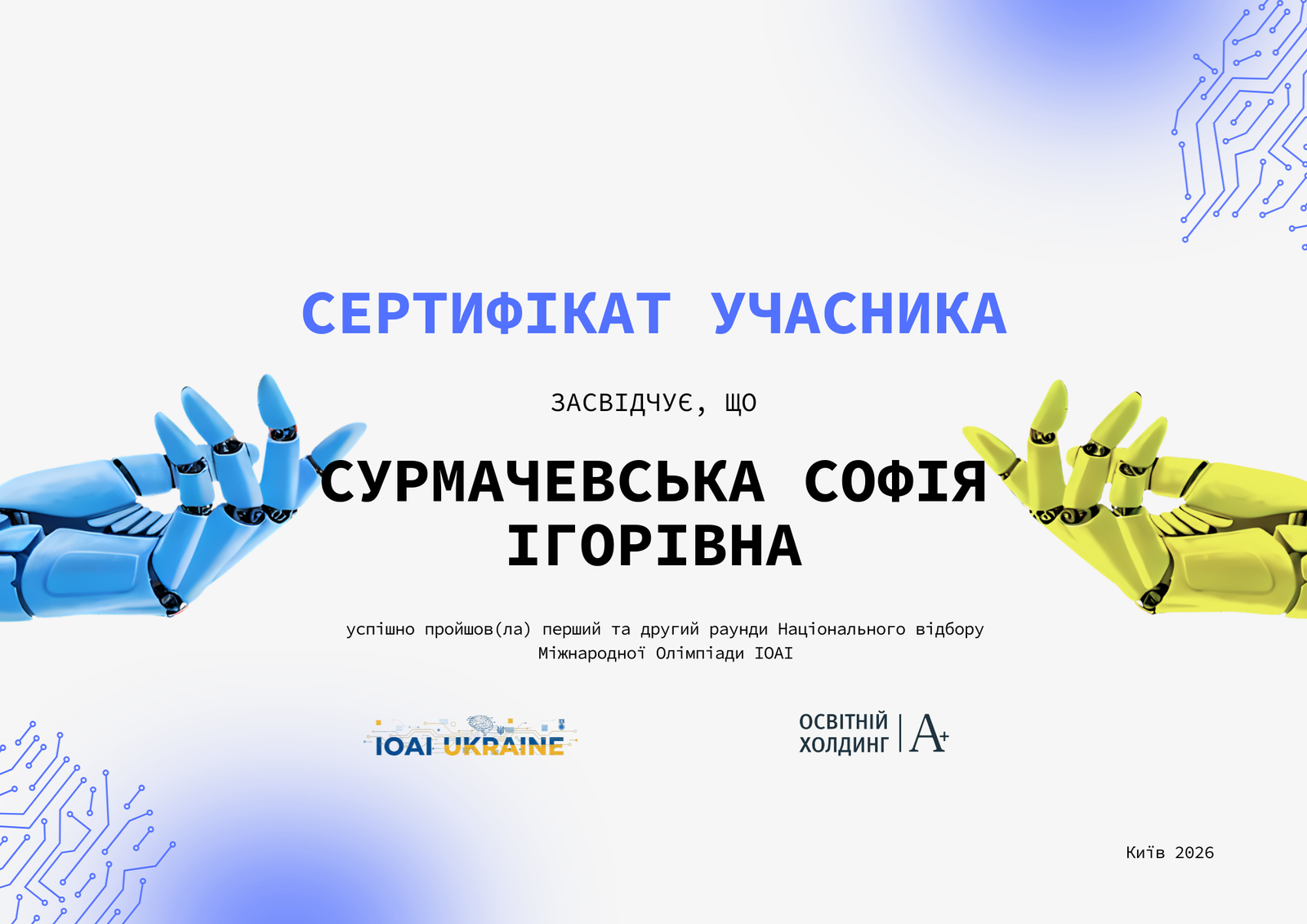 Студентка групи ІІ-2 ОПП «Сестринська справа» Софія СУРМАЧЕВСЬКА успішно пройшла перший та другий раунди Національного відбору Міжнародної олімпіади з штучного інтелекту – IOAI (International Olympiad in Artificial Intelligence).