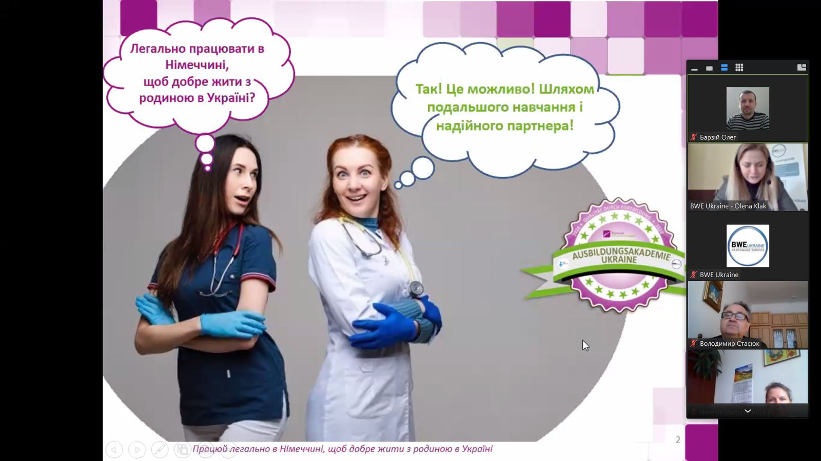 Івано-Франківський медичний фаховий коледж як один з авторитетних закладів такого типу в Україні отримує чимало пропозицій про співпрацю з-за кордону: на проходження практики в лікувальних закладах, працю медсестрами у клініках. Пропозиція співпраці надійшла і від Програми Ausbildungsakademie BWE Ukraine. 2 грудня директорка української філії Програми Олена Клак провела для працівників та студентів ІФМФК відеопрезентацію на платформі Zoom.