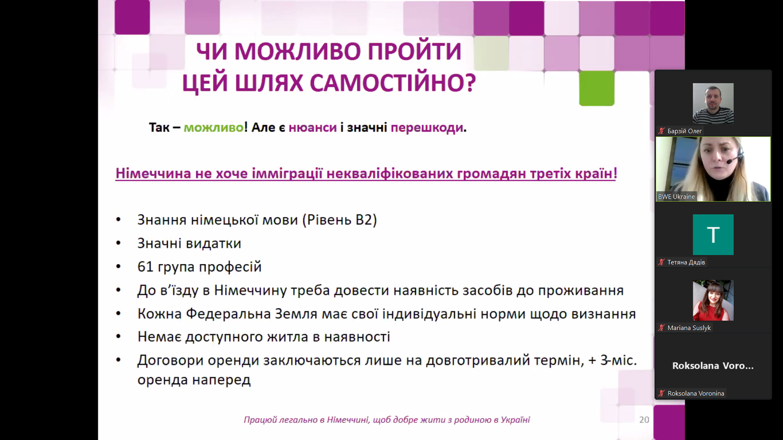 Одразу розставимо акценти: йдеться не про переманювання фахівців з України за кордон і обіцянки захмарних зарплат чи принад європейського життя в Німеччині та Швейцарії. Основний слоган, який супроводжував усю відеопрезентацію: «Легально працювати в Німеччині, щоб добре жити з родиною в Україні». Мається на увазі офіційна праця за контрактом, по 3-4 місяці або триваліше в Німеччині і відповідно на такий же термін вдома, в Україні.