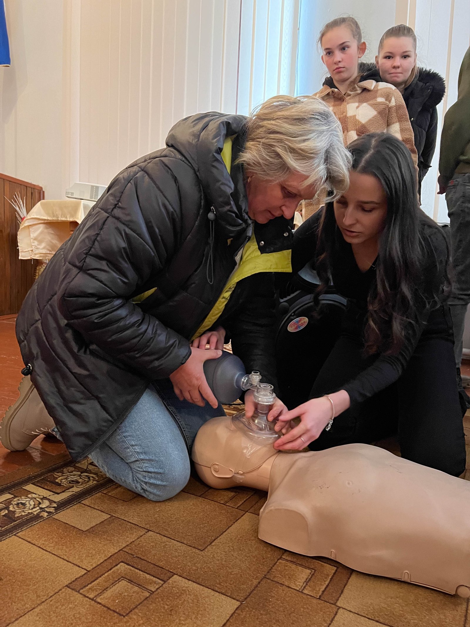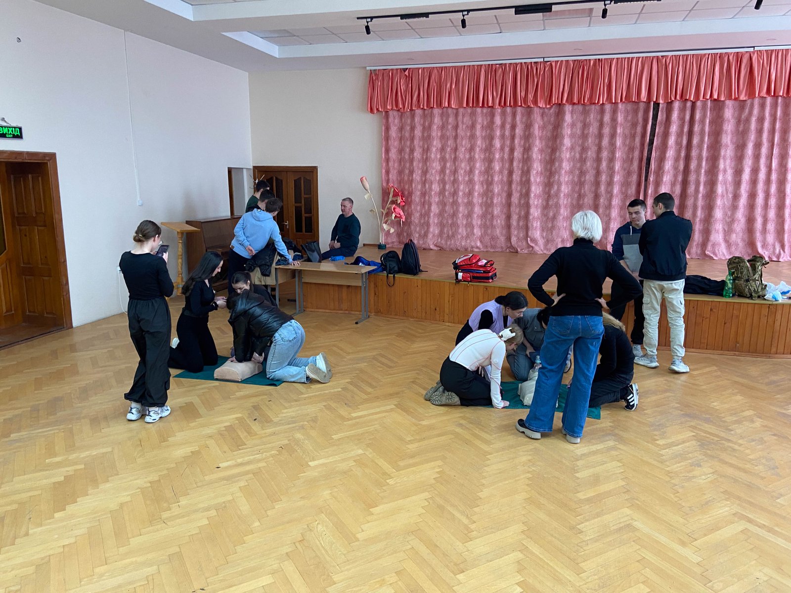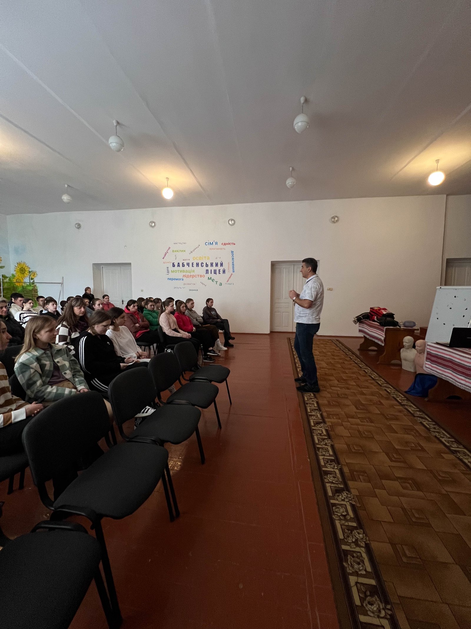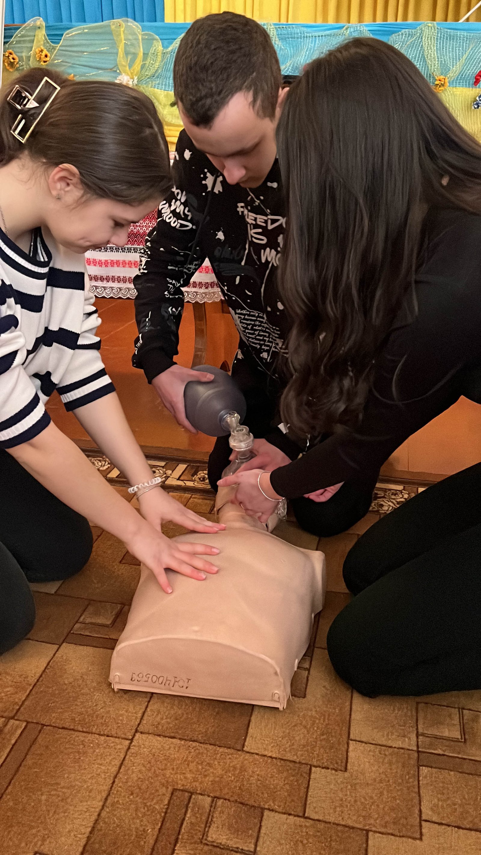Старшокласники мали змогу ознайомитися з основами долікарської невідкладної допомоги, виконували практичні навички на привезених з коледжу муляжах – непрямий масаж серця, штучна вентиляції легень мішком Амбу, застосування автоматичного зовнішнього дефібрилятора, вчилися накладати кровоспинні турнікети.