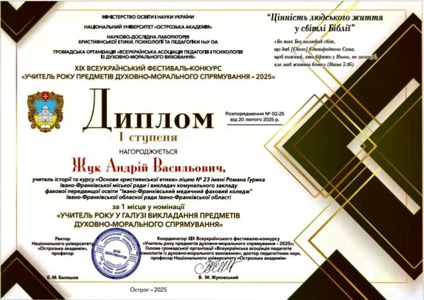 Колектив КЗФПО «Івано-Франківський медичний фаховий коледж» ІФОР (вул. Гетьмана Мазепи, 165) вітає викладача освітнього компоненту «Громадянська освіта» о. Андрія ЖУКА з перемогою у XІX Всеукраїнському фестивалі-конкурсі «Учитель року предметів духовно-морального спрямування – 2025».