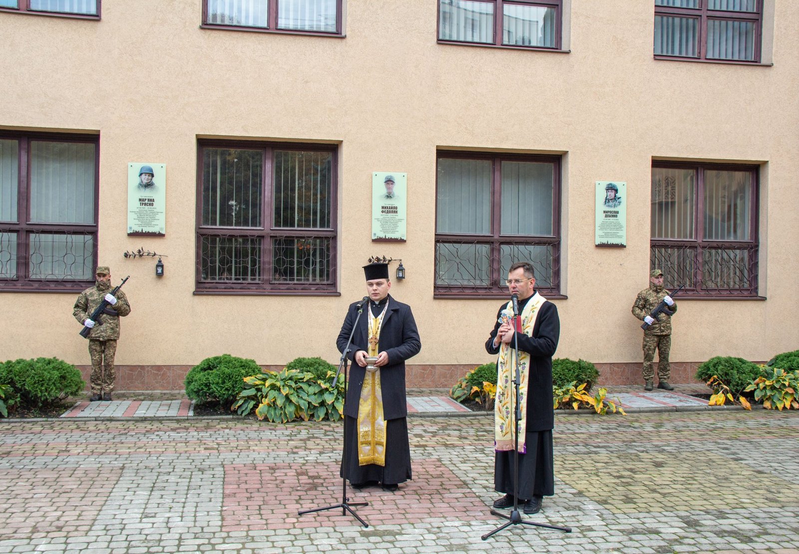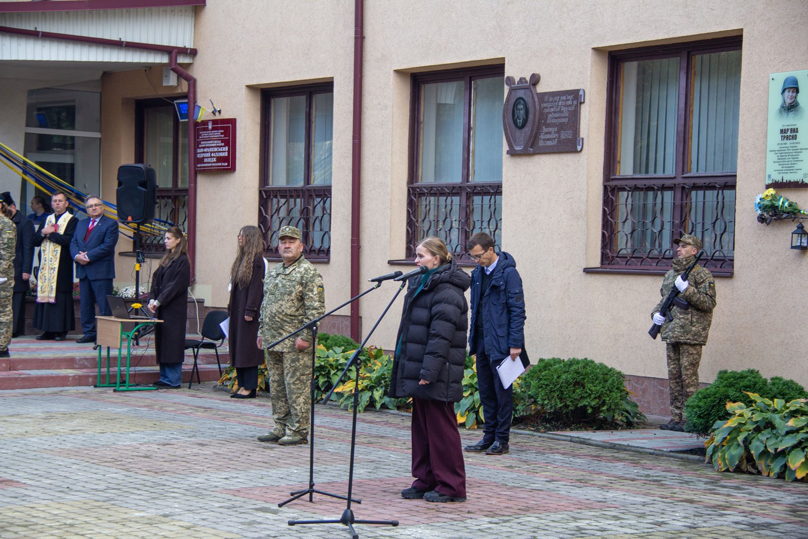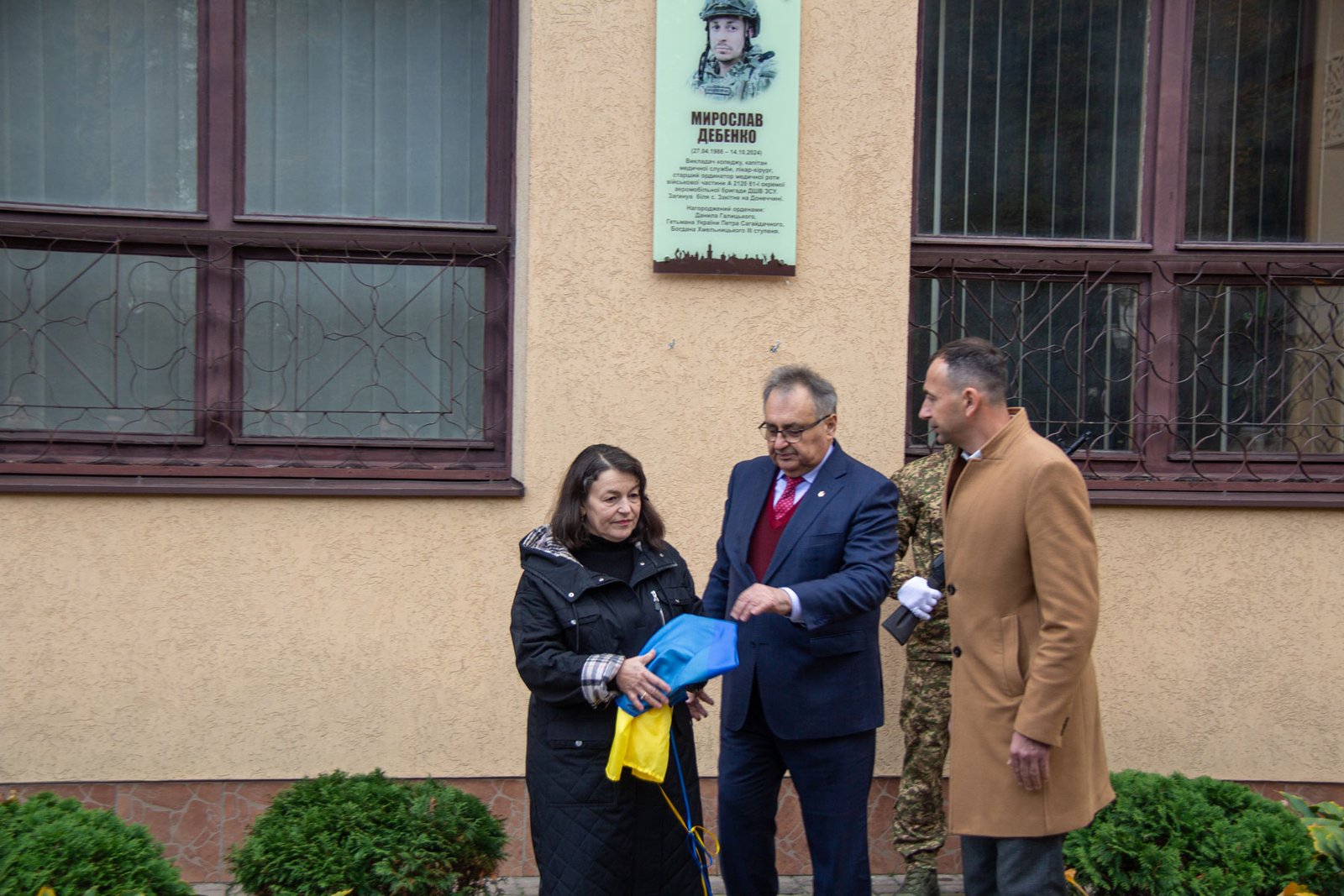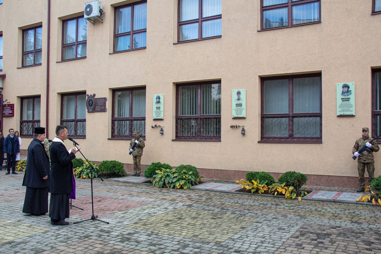 Пам’ятну дошку на фасаді коледжу відкрили мама Ольга ДЕБЕНКО, секретар Івано-Франківської міської ради Віктор СИНИШИН, директор ІФМФК Володимир СТАСЮК, а о. Йосафат БОЙКО і о. Андрій ЖУК освятили її.