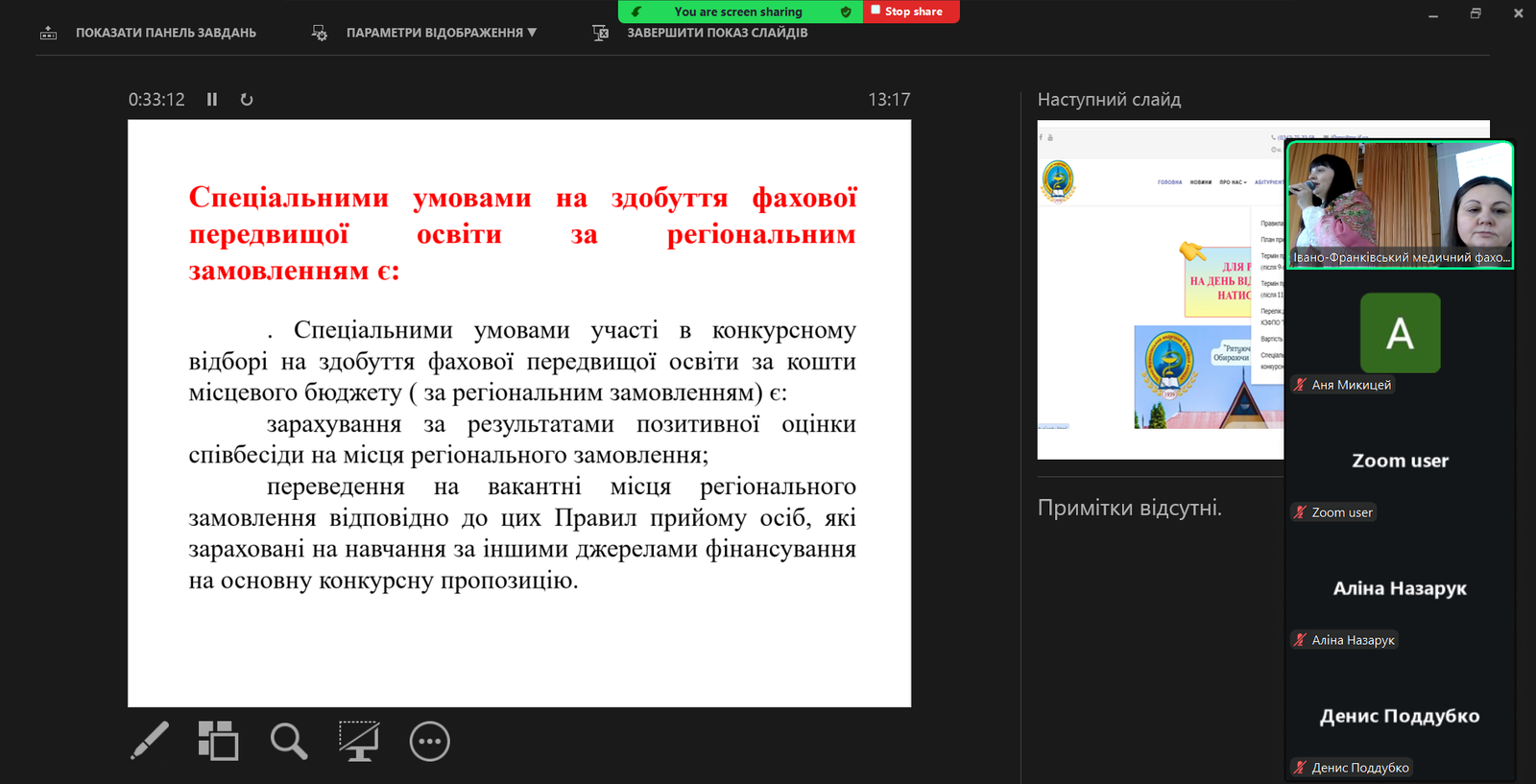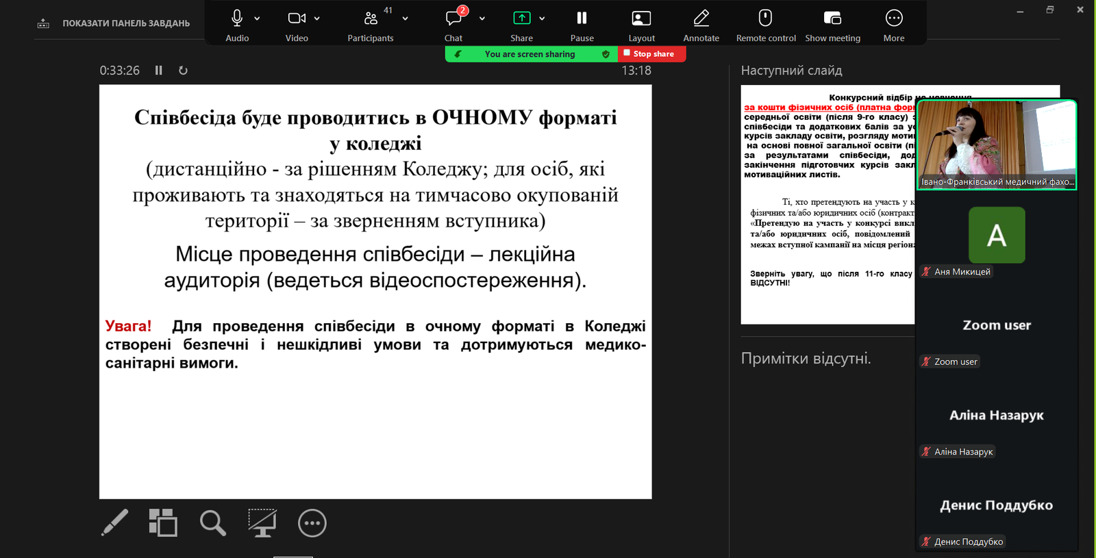 Альона Миколаївна розповіла, які документи подавати, як зареєструватися в електронному кабінеті, які терміни подачі документів, проведення конкурсного відбору, зарахування (наразі орієнтовні, до затвердження Правил прийому): з 25 червня – реєстрація в е-кабінеті, з 1 липня – прийом документів, 15-23 липня – співбесіда, після 14.00 23 липня – оприлюднення рейтингових списків для вступників після 9-го класу. Затверджені правила прийому до ІФМФК і вся інформація щодо вступної кампанії-2026 будуть оприлюднені на сайті коледжу у рубриці «Абітурієнту». Буде також створена вайбер-група вступників.