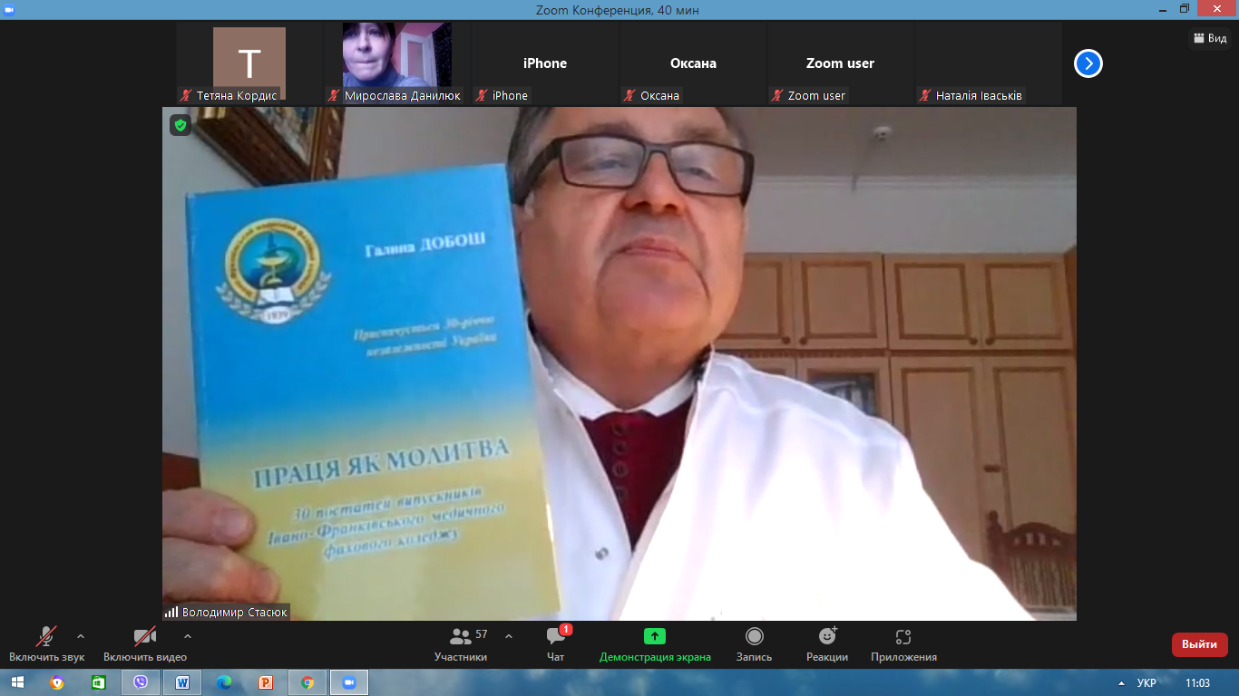 Наступне заняття провів директор коледжу Володимир Васильович Стасюк. Розпочав він його з короткого повідомлення про книжку «Праця як молитва. 30 постатей випускників Івано-Франківського медичного фахового коледжу», присвячену 30-річчю відновлення незалежності України, та анонсування наступного проєкту «85 розповідей випускників ІФМФК» до 85-річчя навчального закладу. Можливо, хтось з сьогоднішніх слухачів ПДО до нього теж долучиться.
