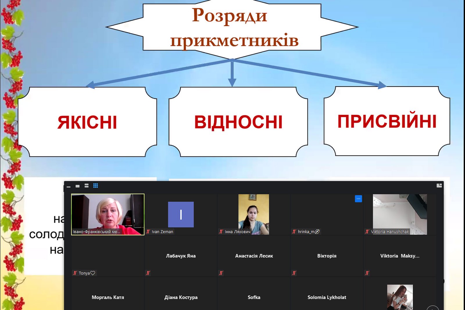 Після 20-хвилинної перерви відбулося заняття з української мови. Розглянуто питання морфології (синтаксис буде на наступному занятті), при цьому акцентовано на частинах мови та прикладах, де часто допускають помилки. Знову ж – використання таблиць, графічних зображень, увага до найскладніших і найважчих моментів. Як приклади наводилися тести – власне таку форму і матимуть іспити.