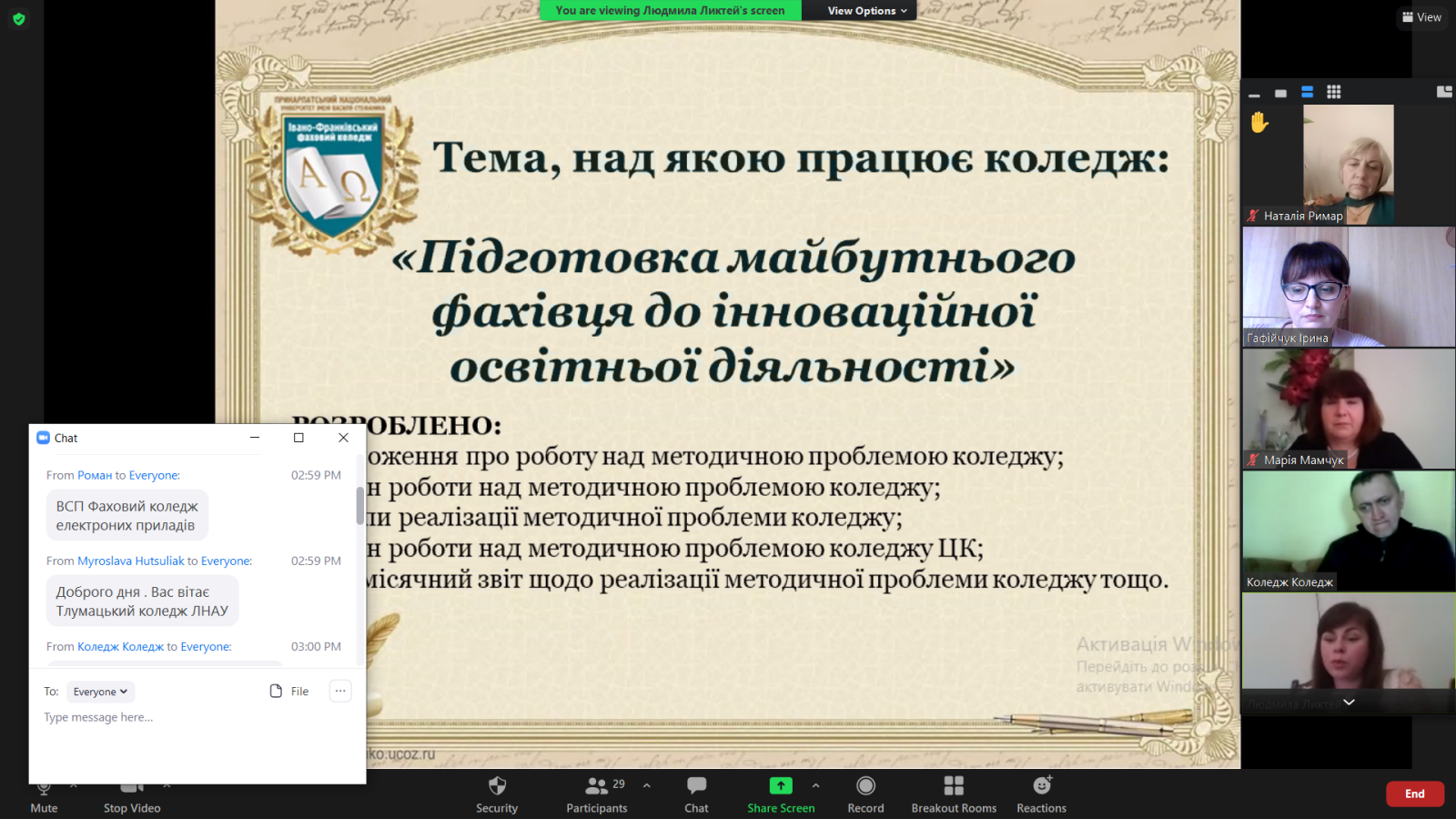 Тема, над якою працює Івано-Франківський фаховий коледж ПНУ, якраз стосується підготовки майбутнього фахівця до інноваційної освітньої діяльності. Людмила Миколаївна Ликтей поінформувала про різні цифрові ресурси, програми, інструменти, які використовуються для дистанційного навчання, акцентувала на підвищенні кваліфікації педагогів, медіакомпетентності, міжнародній діяльності. А розповідь про навчальну і виховну роботу у коледжі у звичному режимі, а не онлайн доповнила добірка світлин про тренінги, ділові ігри, конкурси, тематичні заходи тощо.