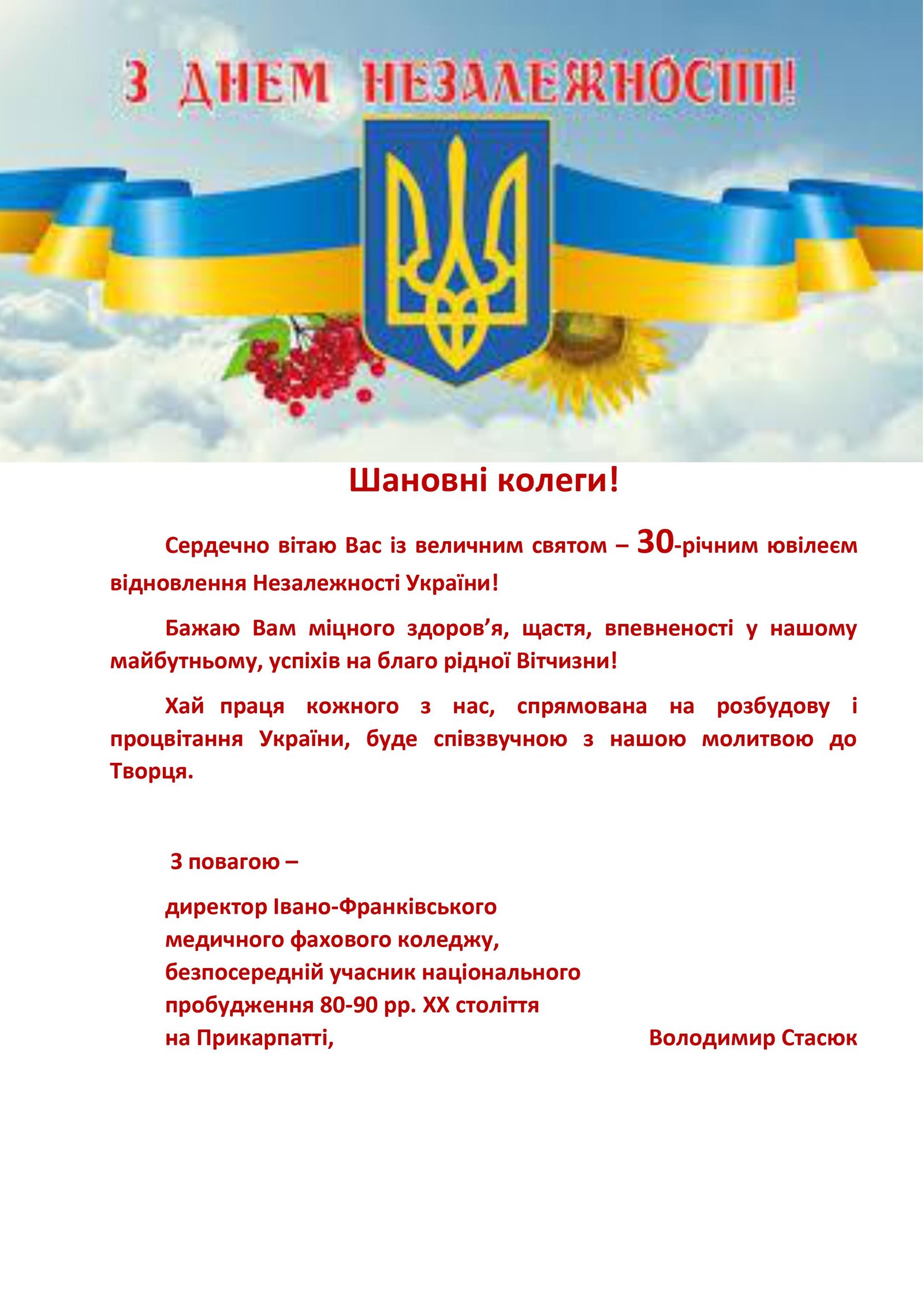 Вітаємо усіх з цими державними святами! Пам’ятаймо про тих, хто віддав своє життя за нашу Незалежність. Будуймо і зміцнюймо нашу державу своєю працею, навчанням, добрими справами. Усвідомлюймо свою відповідальність перед майбутніми поколіннями за долю соборної незалежної демократичної процвітаючої України.