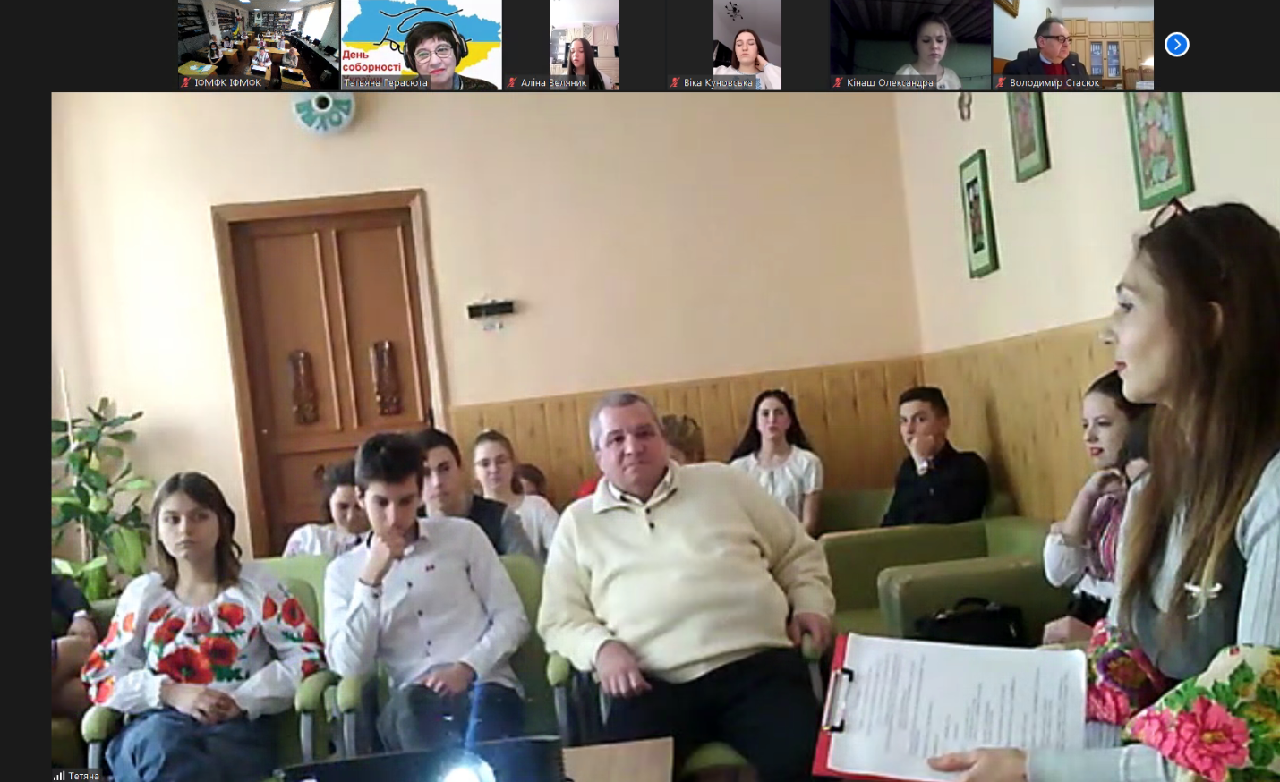 Студенти обох закладів освіти одночасно переглянули відеоролик "Злука". А потім відповідали на питання: як розумієте поняття "Соборність", що значить соборність для України, якою бачите Україну, своє місто, себе через 10 років? Якщо коротко про Україну через 10 років - без війни, учасниця ЄС, працюють підприємства, нема заробітчанства, всі розмовляють українською мовою, а в палаці Потоцького в Івано-Франківську - філіал Лувру, МОЗ очолює випускник ІФМФК.