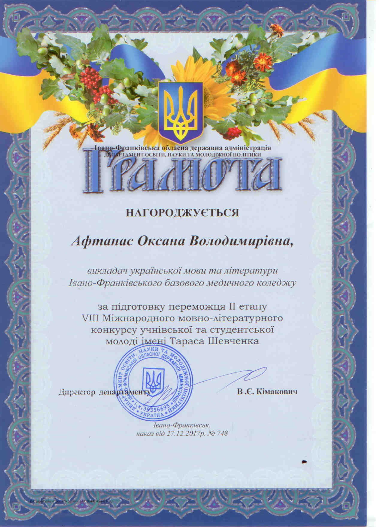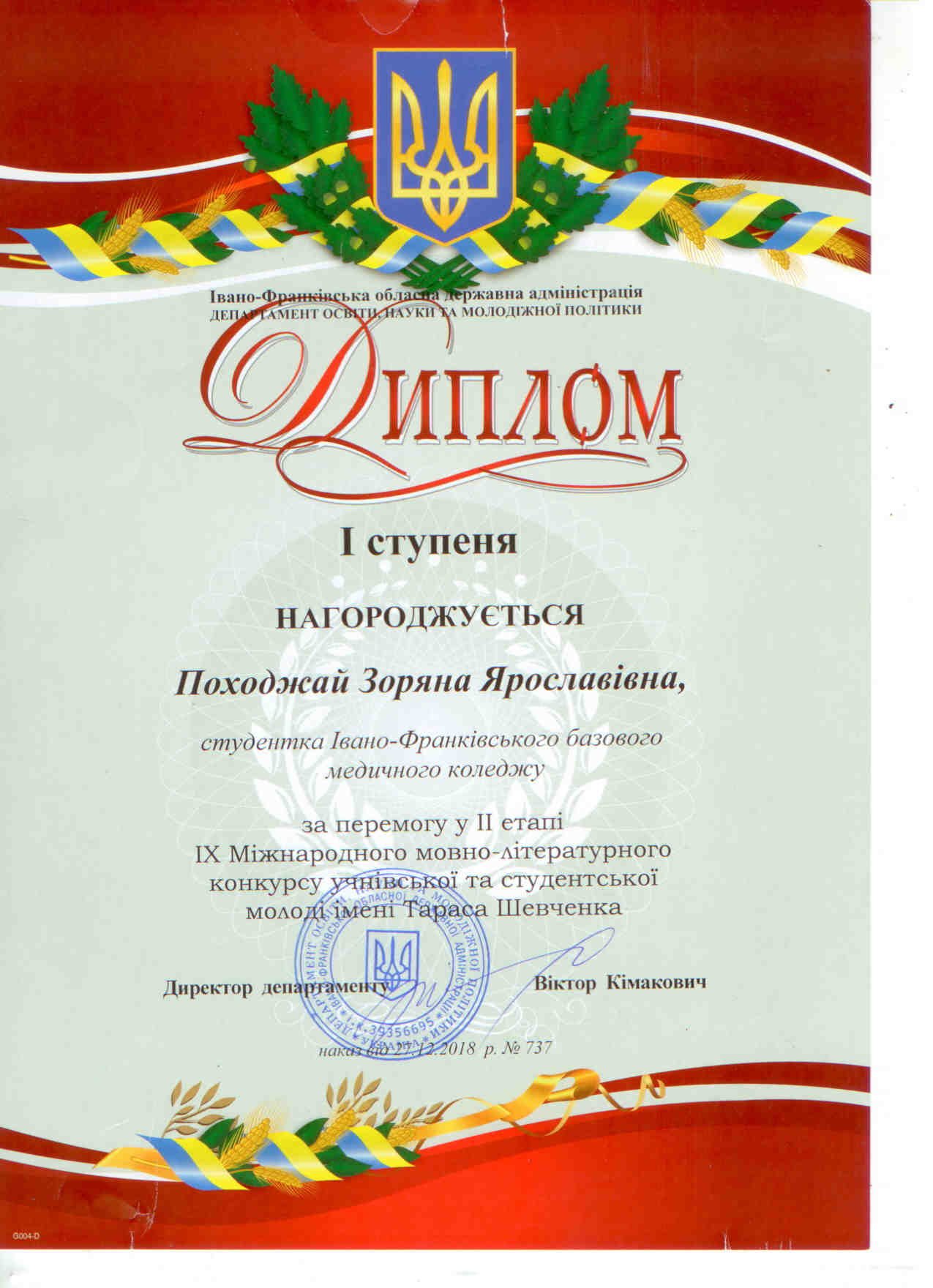 До нагородження за зайняте І місце у ІІ етапі IX Міжнародного мовно-літературного конкурсу учнівської і студентської молоді імені Тараса Шевченка було запрошено студентку ІІ курсу 2 групи спеціалізації «Сестринська справа» Походжай Зоряну та викладача української мови та літератури Афтанас Оксану Володимирівну.