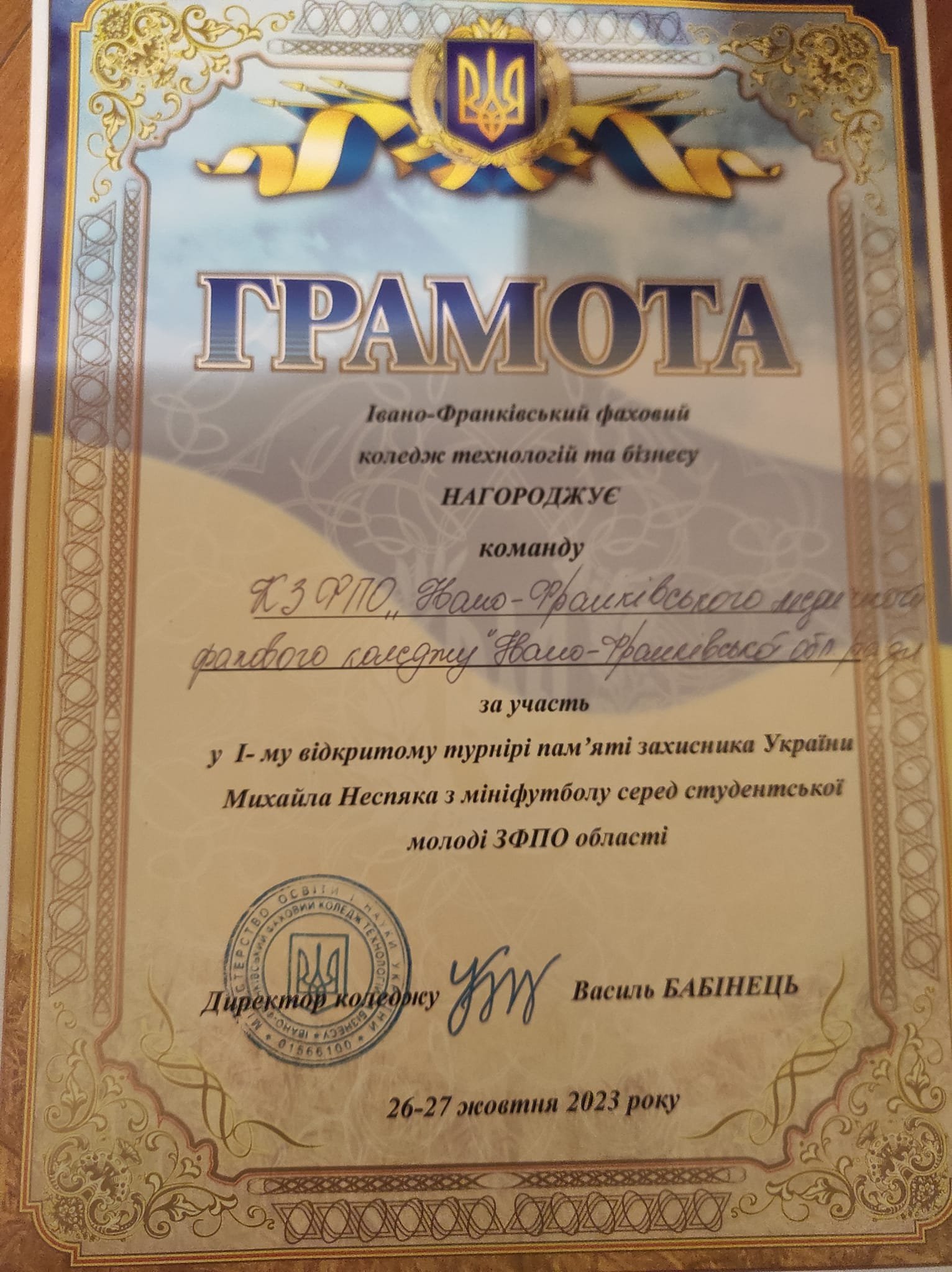 Команда КЗФПО «Івано-Франківський медичний фаховий коледж» ІФОР (вул. Гетьмана Мазепи, 165) взяла участь у першому відкритому турнірі з міні-футболу серед студентської молоді закладів фахової передвищої освіти Івано-Франківської області, присвяченому пам’яті захисника України та педагога Михайла Неспяка.