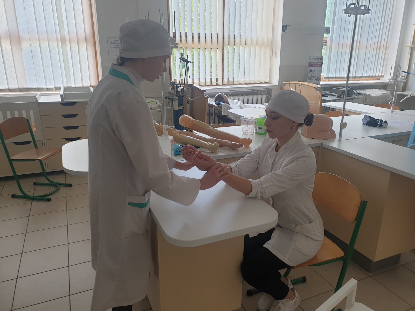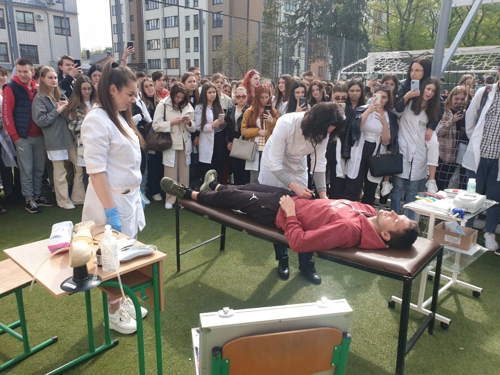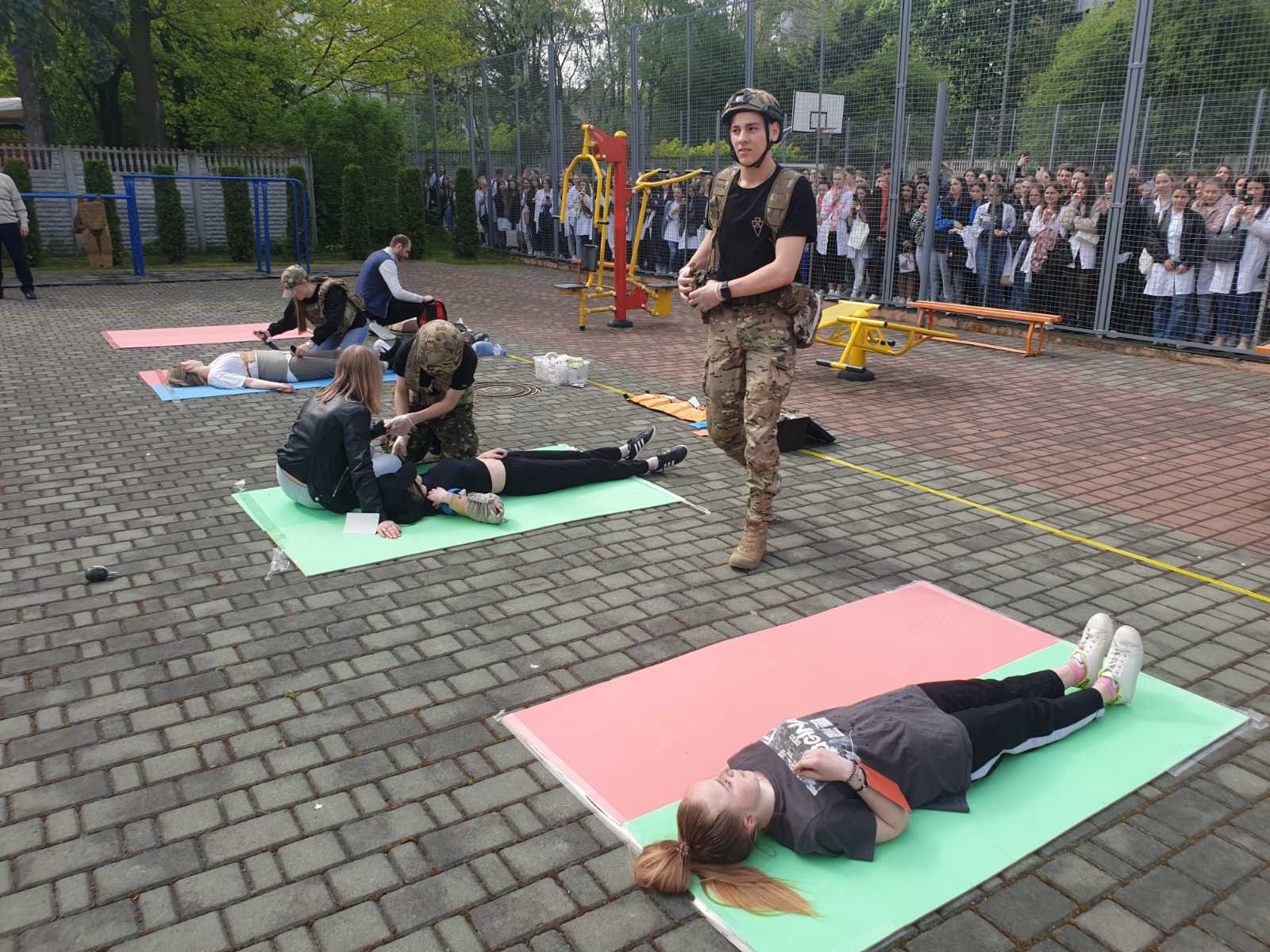 В рамках святкування Міжнародного дня медичної сестри в ІФМФК відбулося практичне заняття з тактичної медицини. Схематично територія коледжу була поділена на три зони, в яких надавалась медична допомога: