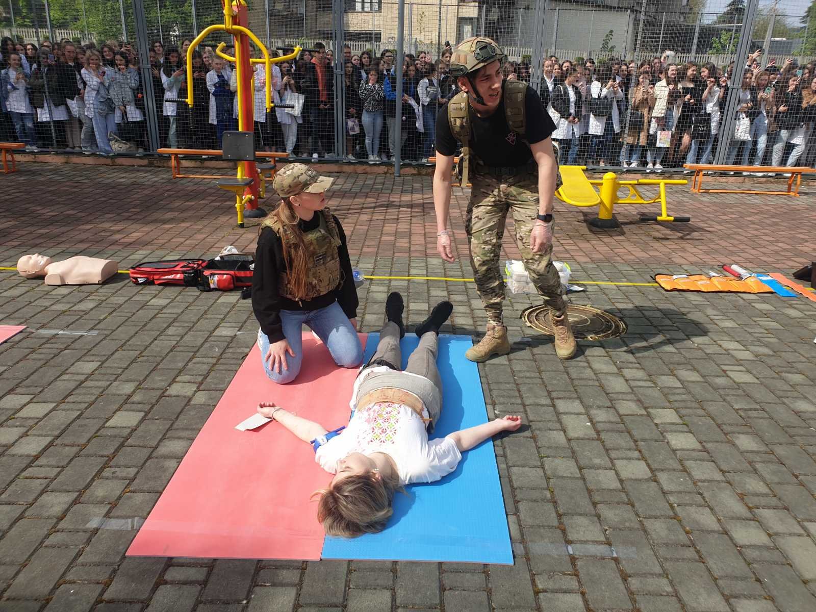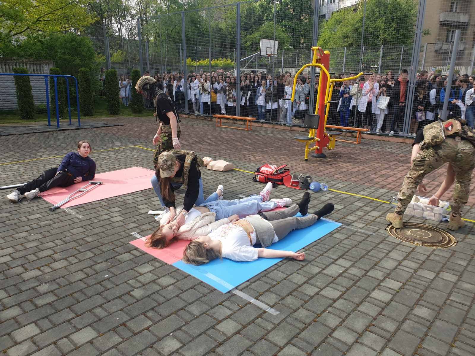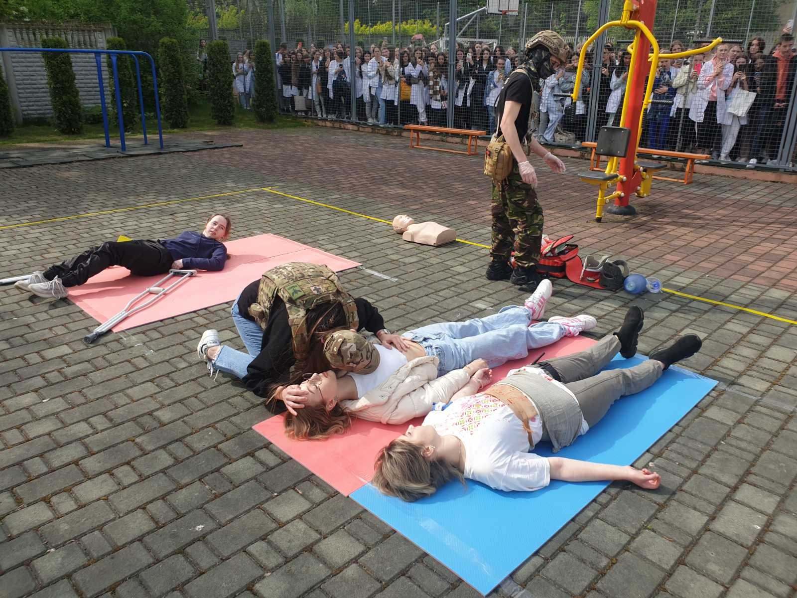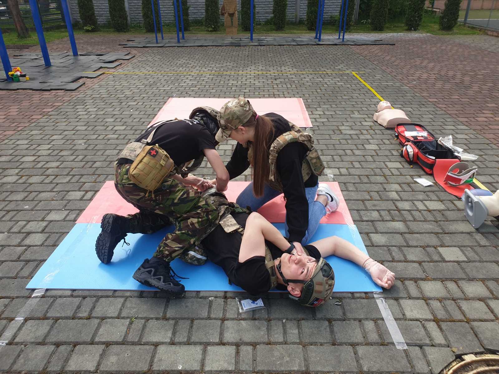Під час заняття відпрацювали основні правила та способи зупинки зовнішньої кровотечі (джгути, турнікети, тампонада рани), перевіряли прохідність дихальних шляхів та відновлювали дихання у разі його відсутності, встановлювали назофарингіальну трубку у разі потреби, проводили транспортну іммобілізацію різними шинами, в тому числі і пневматичними, та підручними засобами при різних переломах та інших важких пошкодженнях м’яких тканин. Був виділений окремий медичний пункт у «жовтій» зоні, де постраждалим можна було виміряти артеріальний тиск, при потребі зробити ЕКГ, надати невідкладну допомогу при стенокардитичних нападах та гіпертензивному кризі (таблетовані препарати, в/м, в/в струминно та в/в краплинно).