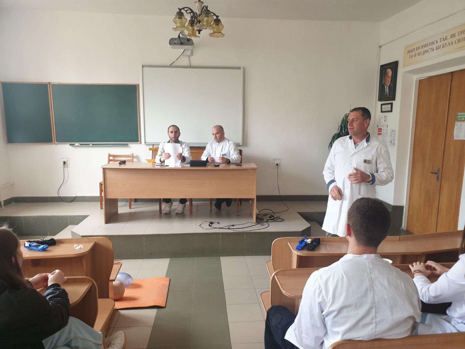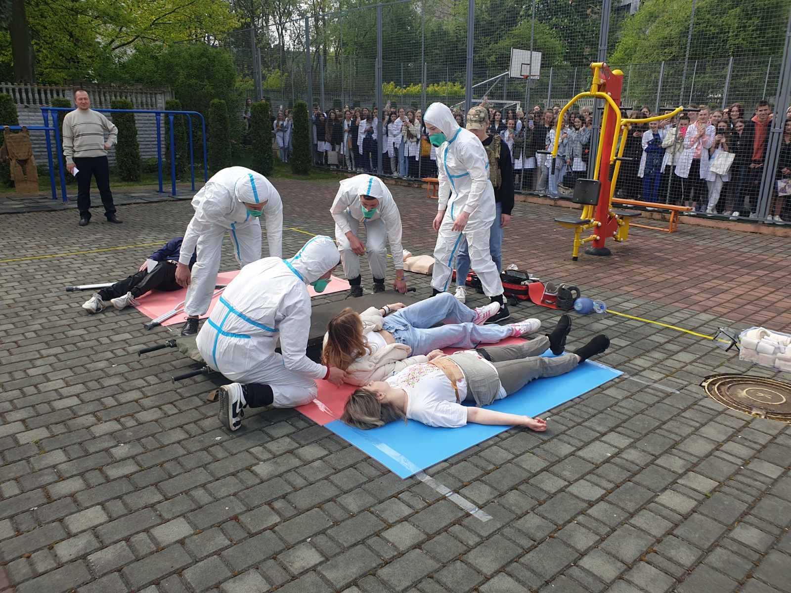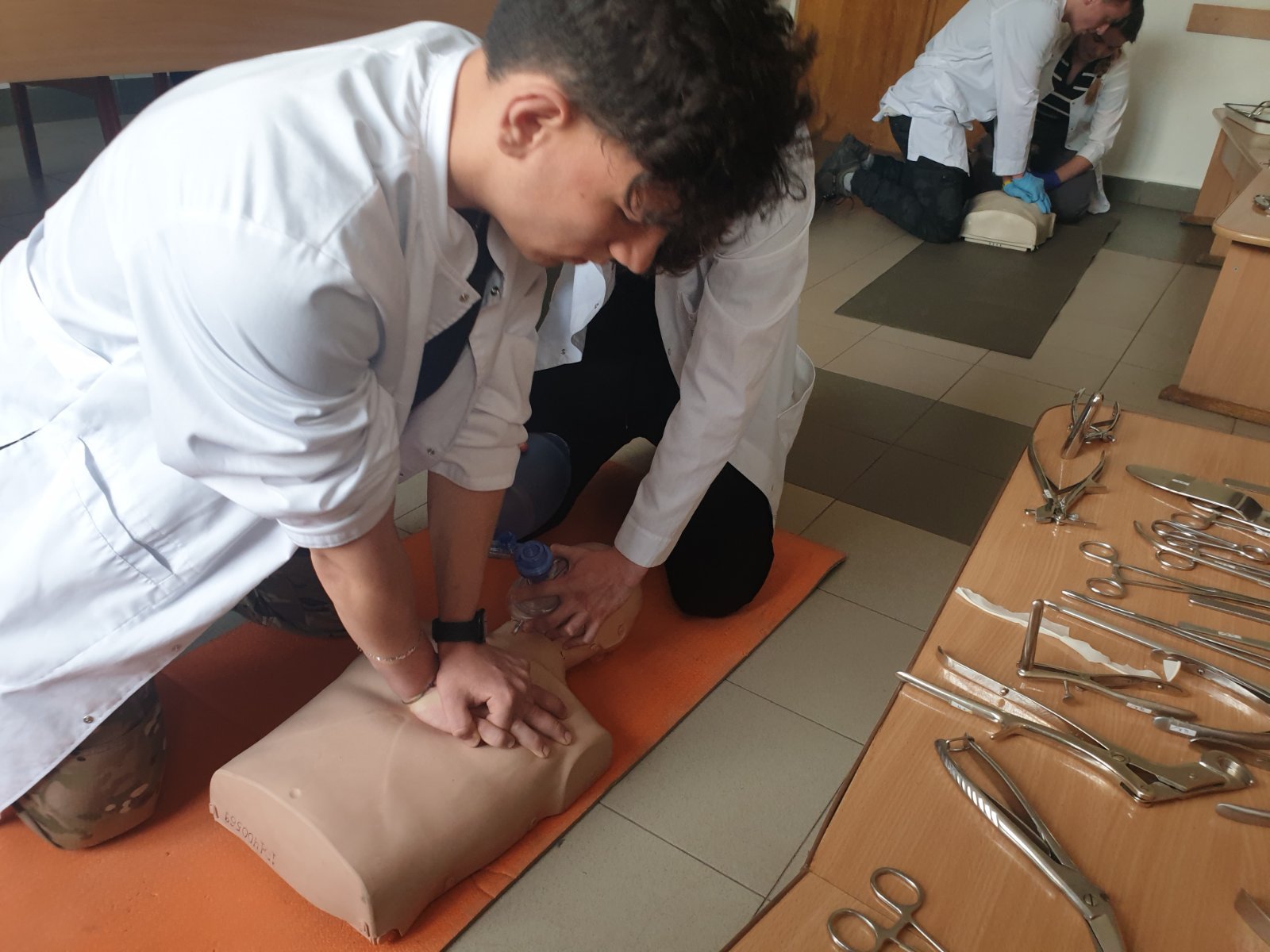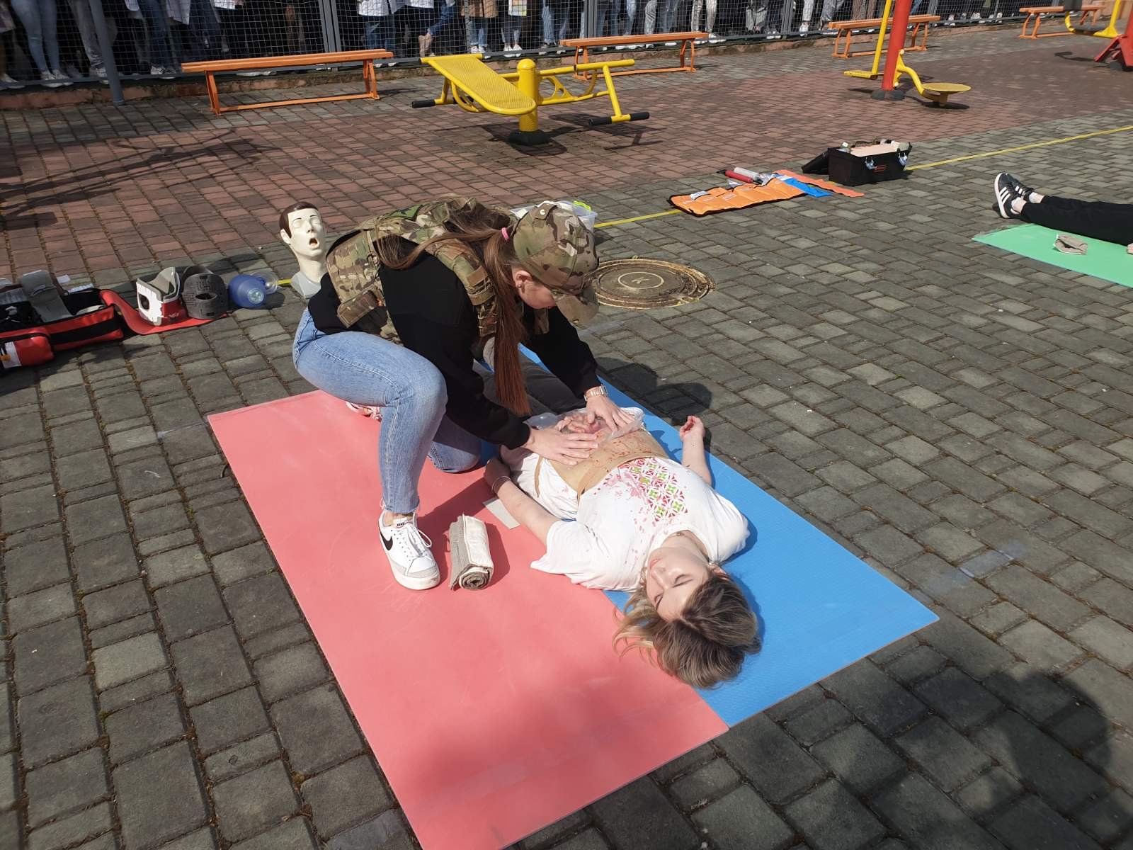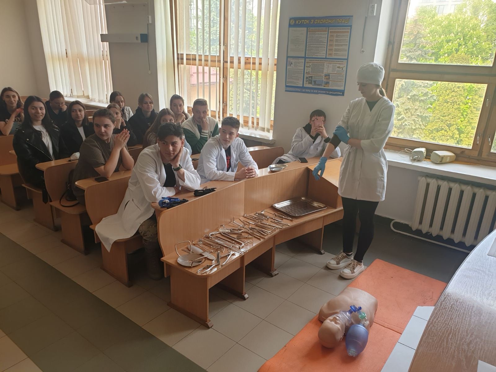 Під час заняття відпрацювали основні правила та способи зупинки зовнішньої кровотечі (джгути, турнікети, тампонада рани), перевіряли прохідність дихальних шляхів та відновлювали дихання у разі його відсутності, встановлювали назофарингіальну трубку у разі потреби, проводили транспортну іммобілізацію різними шинами, в тому числі і пневматичними, та підручними засобами при різних переломах та інших важких пошкодженнях м’яких тканин. Був виділений окремий медичний пункт у «жовтій» зоні, де постраждалим можна було виміряти артеріальний тиск, при потребі зробити ЕКГ, надати невідкладну допомогу при стенокардитичних нападах та гіпертензивному кризі (таблетовані препарати, в/м, в/в струминно та в/в краплинно).