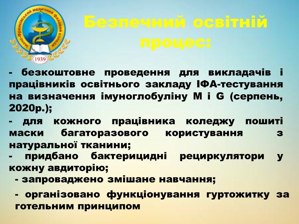 Насамперед – безпечна освіта. Працівники коледжу були забезпечені масками багаторазового користування з натуральної тканини та безкоштовно пройшли ІФА-тестування на визначення імуноглобуліну М і G. Встановлено майже 70 бактерицидних рециркуляторів. Після дистанційного навчання в умовах карантину було запроваджене змішане навчання, а гуртожиток переведено на готельний принцип функціонування.