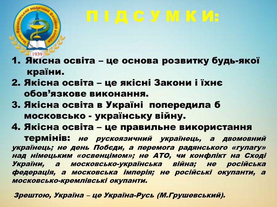 - 4. Якісна освіта – це правильне використання термінів, зокрема: не рускоязичний українець, а двомовний українець; не день Побєди, а перемога радянського «гулагу» над німецьким «освенцімом»; не АТО чи конфлікт на Сході України, а московсько-українська війна; не російська федерація, а московська імперія; не російські окупанти, а московсько-кремлівські окупанти.