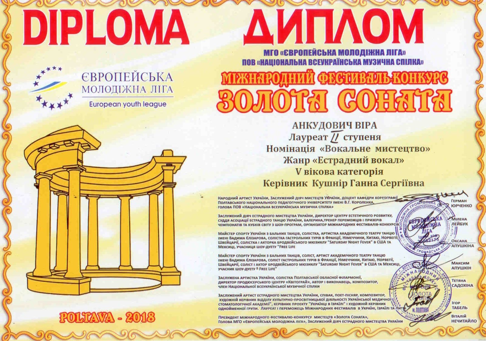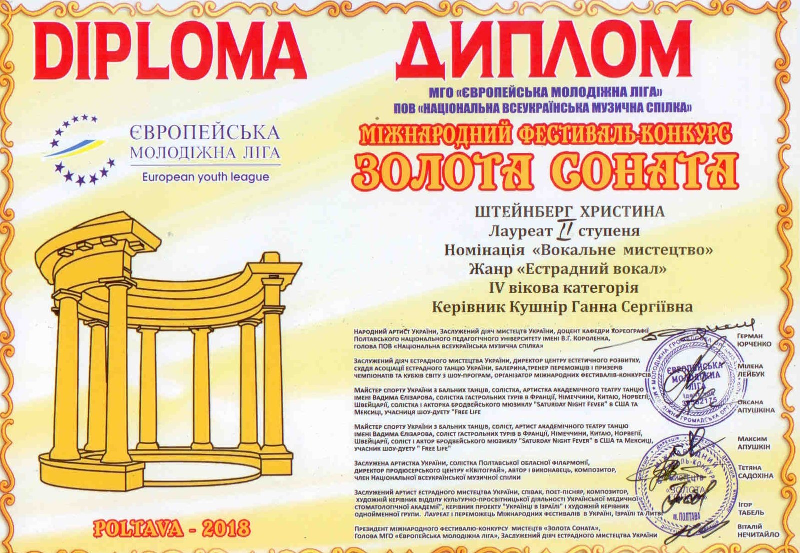 27-28 жовтня 2018 року в м. Полтава пройшов Міжнародний телевізійний фестиваль-конкурс мистецтв «Золота соната - 2018».