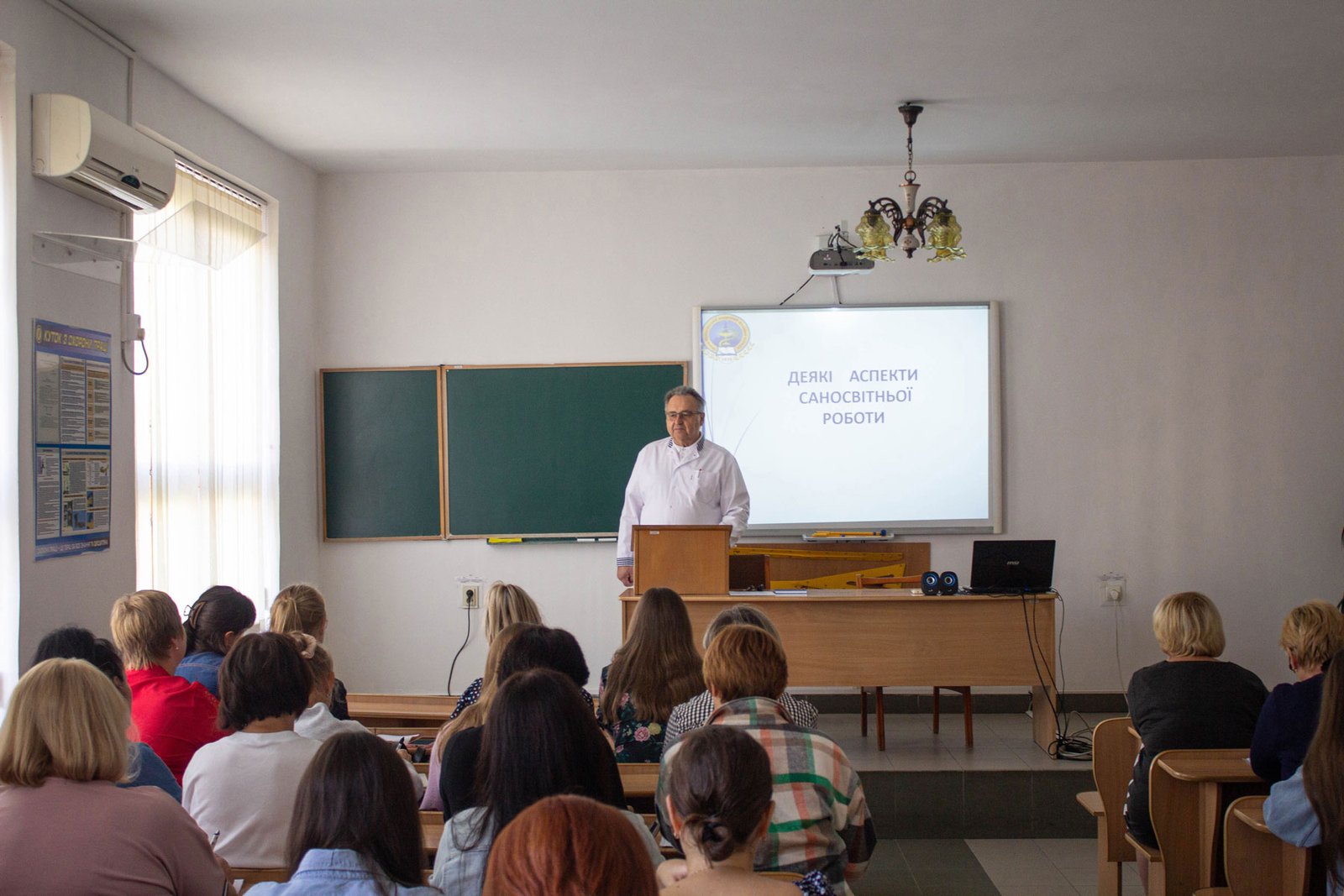 Директор коледжу Володимир Васильович Стасюк зупинився на деяких важливих аспектах санітарно-освітньої роботи, класичних визначеннях здоров’я, класифікації Роббінса, духовній складовій здоров’я.