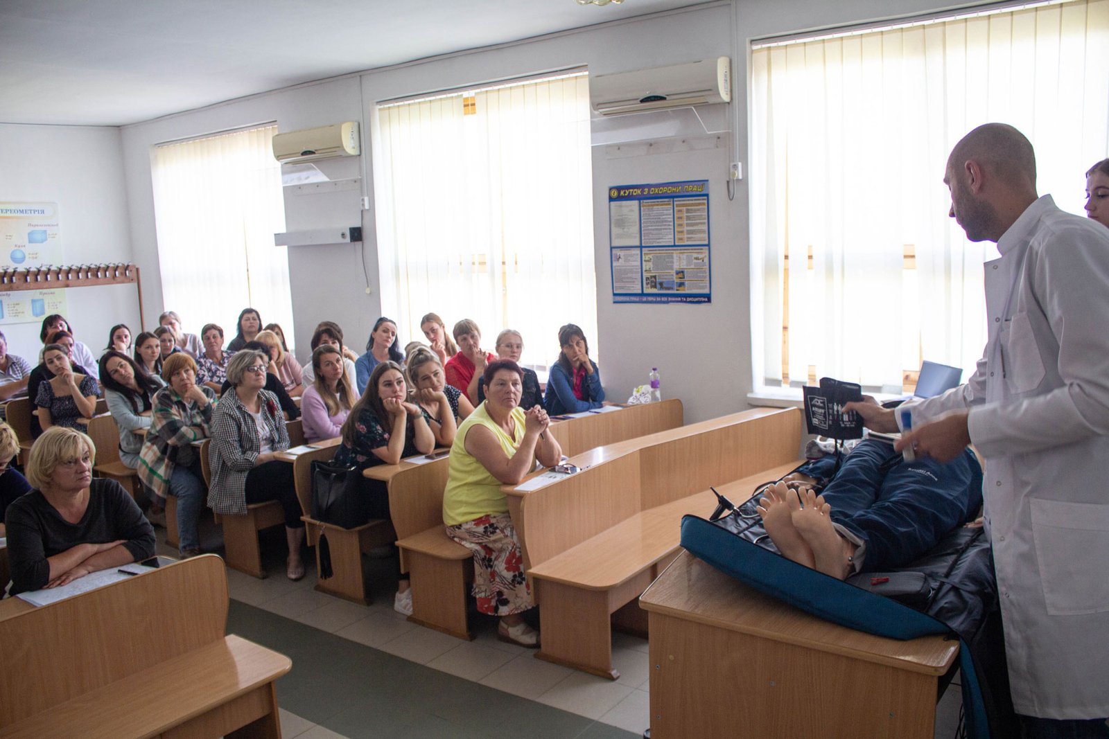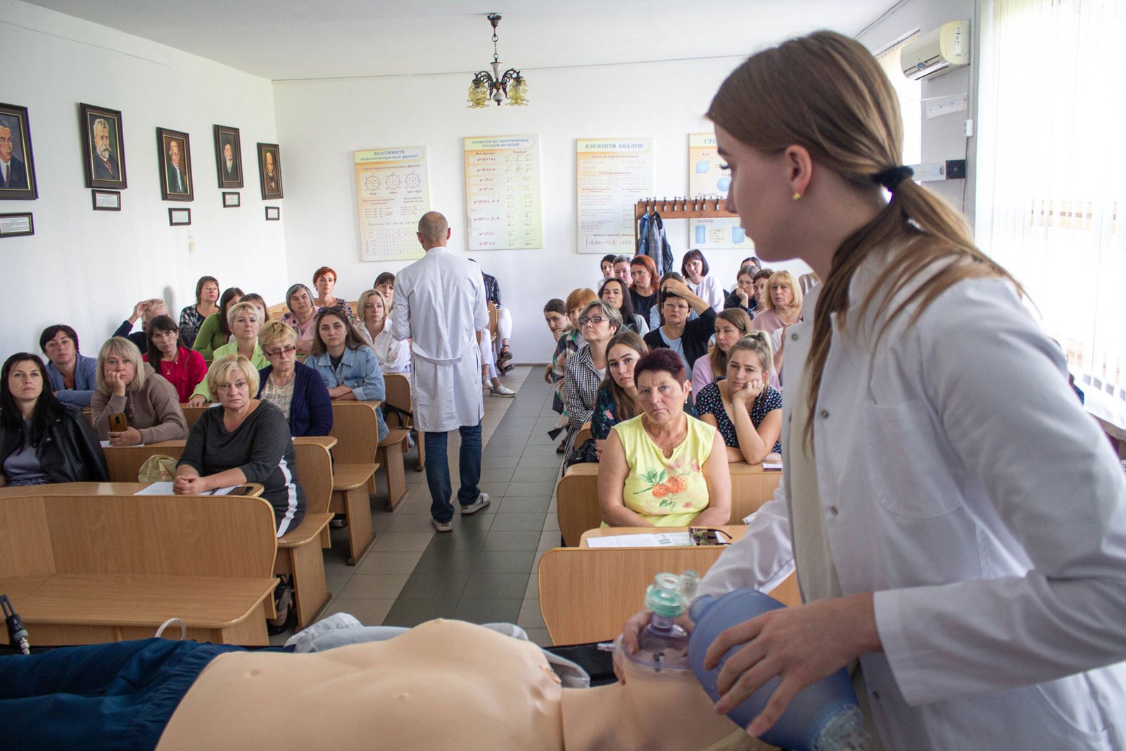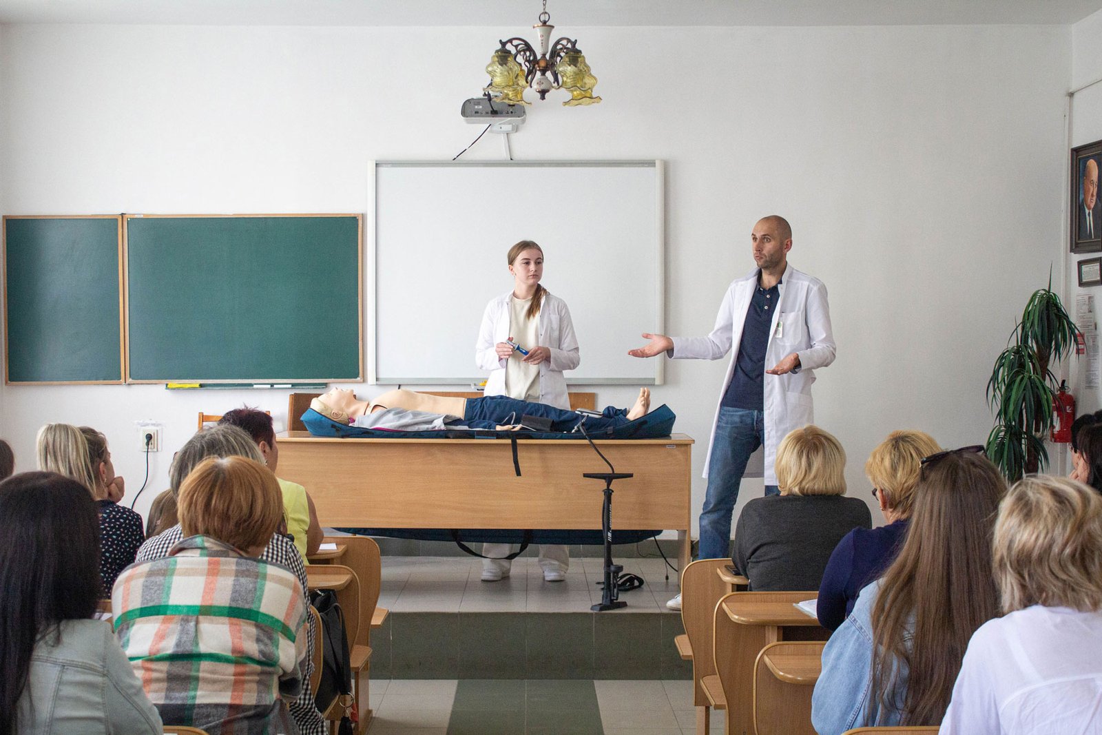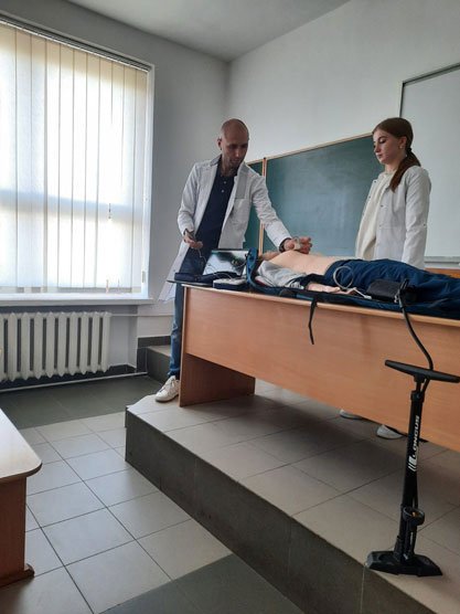 А голова циклової комісії хірургічних дисциплін Володимир Миколайович Яцків провів з слухачами практичне заняття – відпрацювання на реанімаційному тренажері-симуляторі, який коледж отримав у подарунок від Klinikum Ernst von Bergmann gGmbH з Потсдама (Німеччина), практичних навичок невідкладної допомоги, оцінки параметрів роботи дихальної системи, серцево-судинної системи (пульс, тиск, тони серця, серцеві шуми, ЕКГ), користування автоматичним зовнішнім дефібрилятором (АЗД), проведення внутрішньокісткової канюляції за допомогою набору для внітрішньокісткового доступу. Це унікальне навчальне обладнання, третє такого рівня в Україні і єдине в області, воно дозволяє підвищити якість допомоги та професійної майстерності медсестер/медбратів.