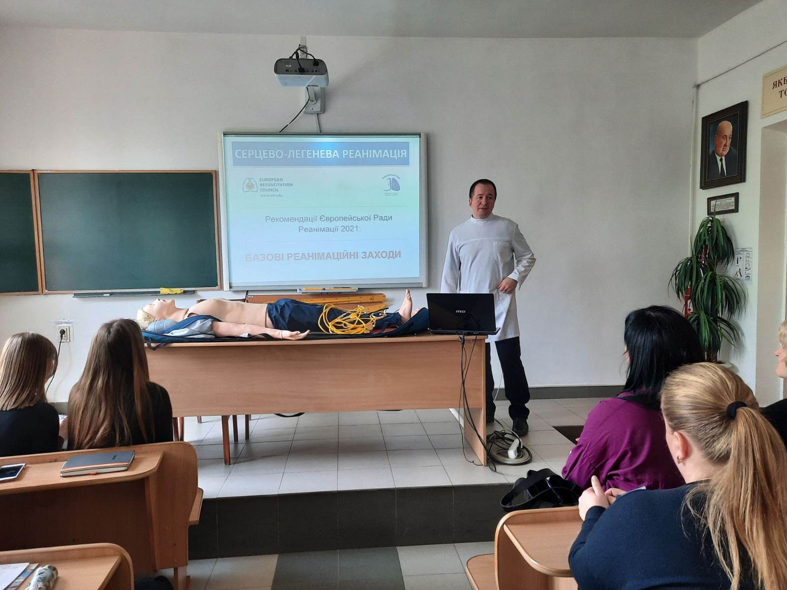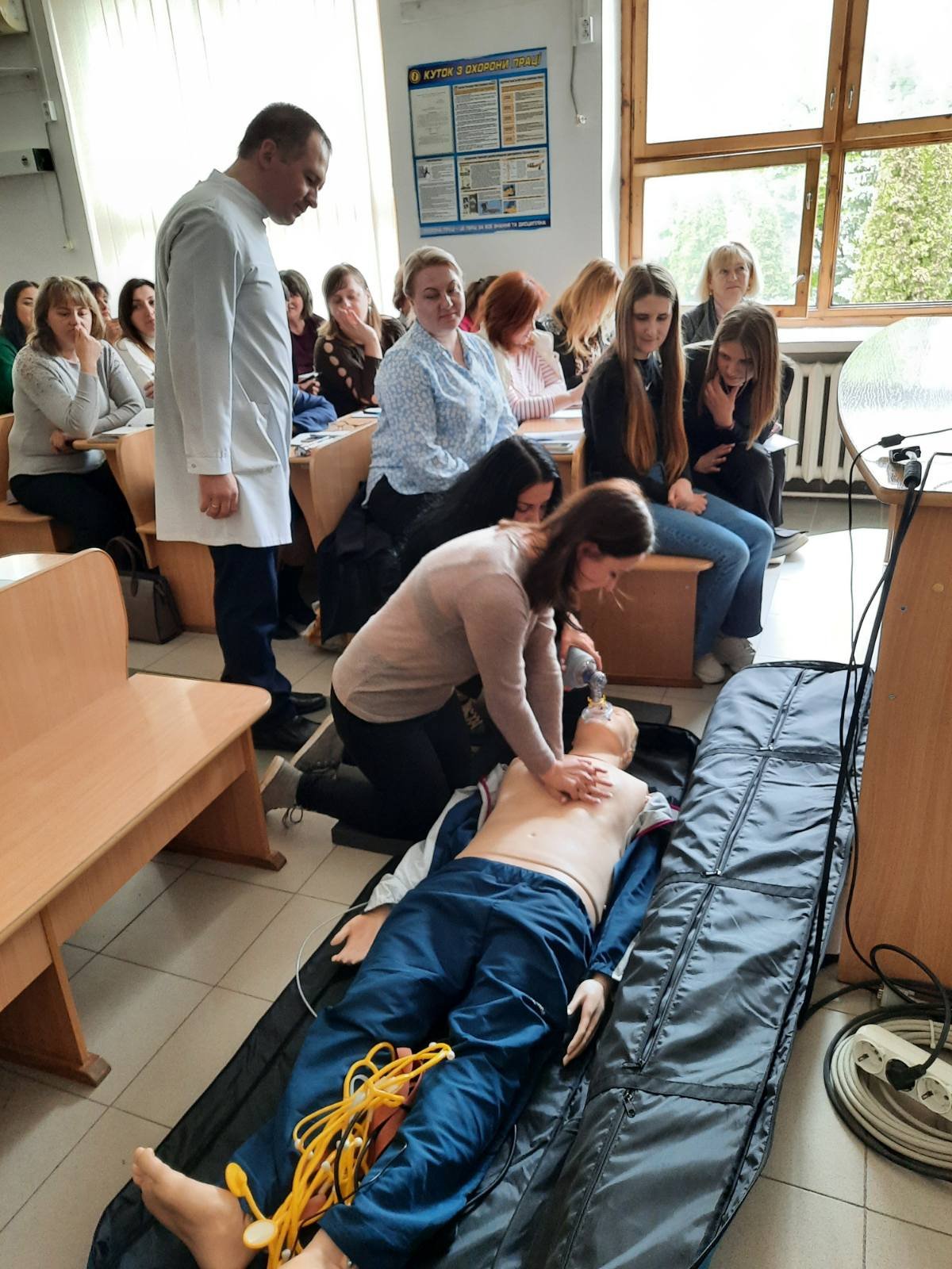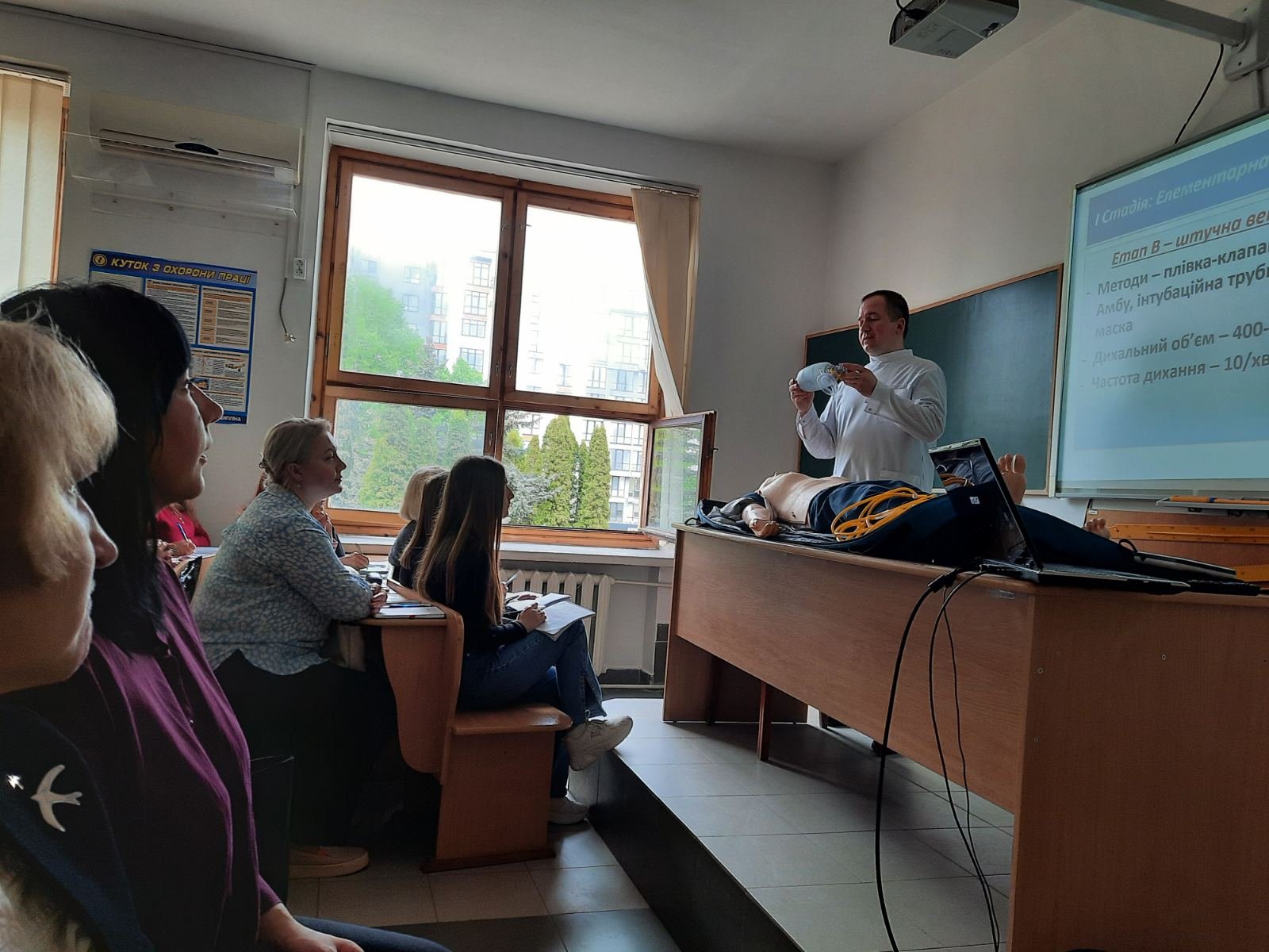 Викладач хірургії Веприняк Микола Миколайович провів із курсантами практично-орієнтоване заняття під час якого були відпрацьовані навички користування військовою індивідуальною аптечкою, мішком Амбу, проведення серцево-легеневої реанімації, у т.ч особливості проведення СЛР із застосуванням АЗД на реанімаційному тренажері-симуляторі, який коледж отримав у подарунок від Klinikum Ernst von Bergmann gGmbH (Потсдам, Німеччина).