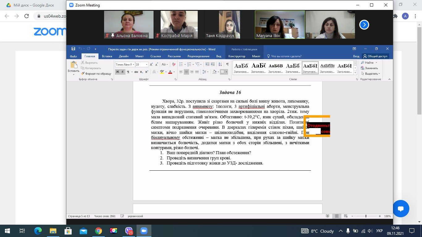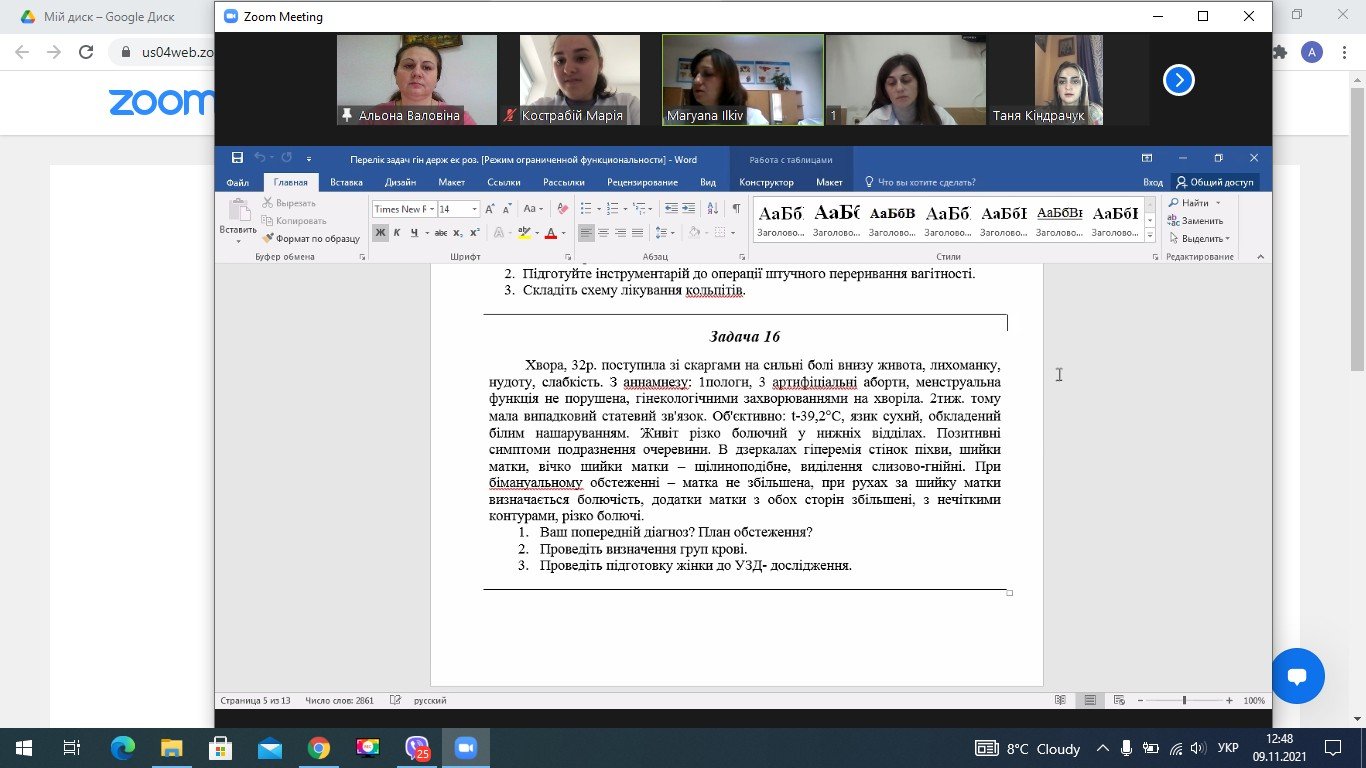 Теоретична частина екзамену з гінекології складалася з теоретичних питань, ситуаційних задач та практичних навичків. На платформу Zoom одночасно входило по двоє студентів, дотримуючись порядковості за алфавітом. За під’єднанням до екзамену спостерігала і відповідала староста групи.