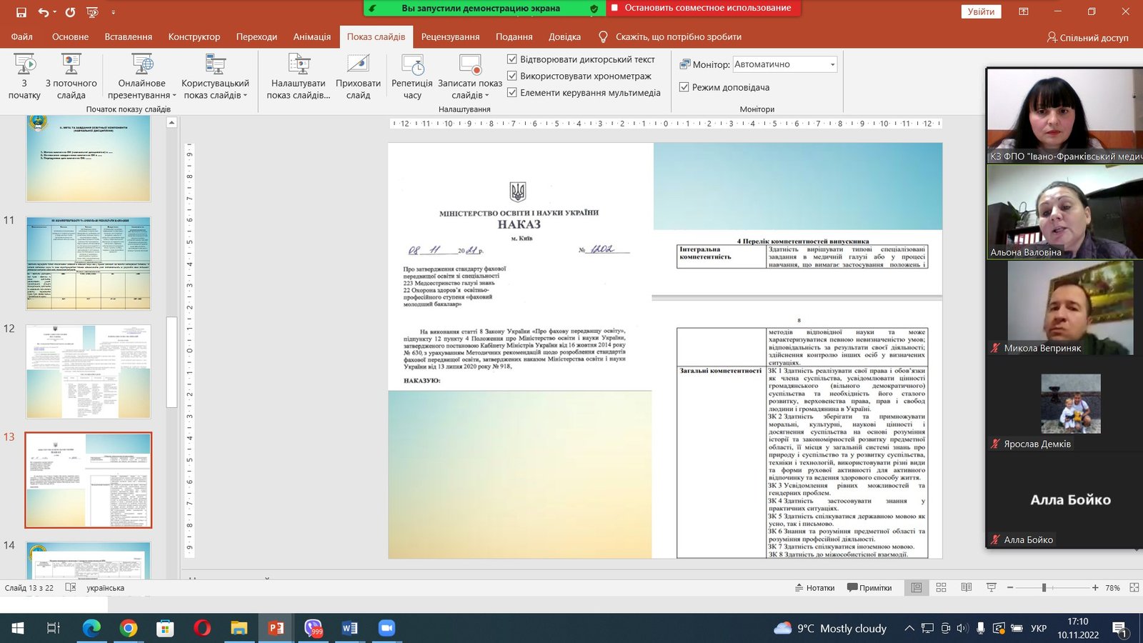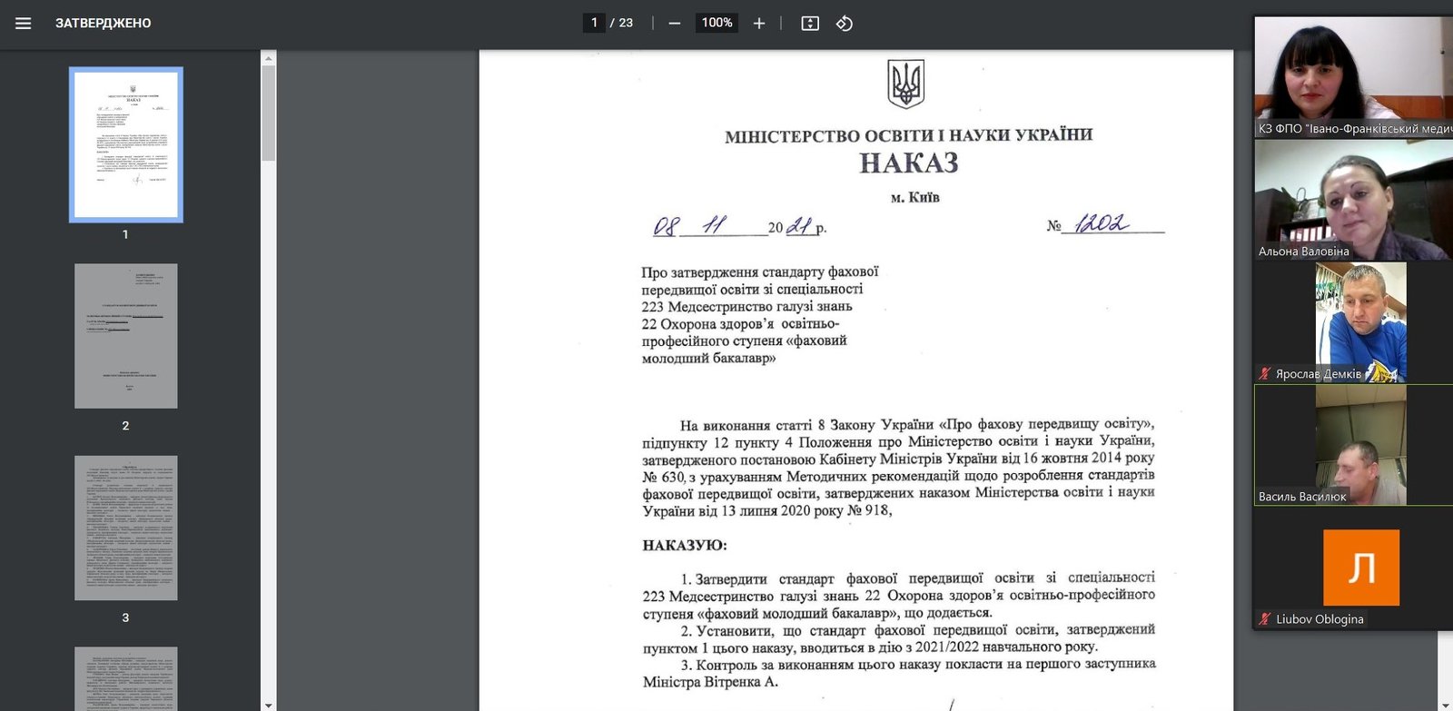 Ірина Іванівна поінформувала викладачів ІФМФК про засідання та презентувала матеріали теми онлайн-семінару. До відома присутніх довела, що основними документами, відповідно до яких забезпечується якісна освіта компетентного здобувача освіти є Стандарт фахової передвищої освіти зі спеціальності 223 Медсестринство галузі знань 22 Охорона здоров’я освітньо-професійного ступеня «фаховий молодший бакалавр», затверджений наказом Міністерства освіти і науки України № 1202 від 08 листопада 2021 року. Освітньо-професійні програми формуються на основі стандарту. Ірина Гафійчук зазначила, що у коледжі вже розроблені робочі програми освітніх компонентів (сучасний термін на означення навчальної дисципліни), враховуючи компетентнісні підходи. Однак програми потребують доопрацювання, систематичного перегляду, удосконалення, оновлення відповідно до нових ОПП, чинних нормативних документів органів освіти та охорони здоров’я.