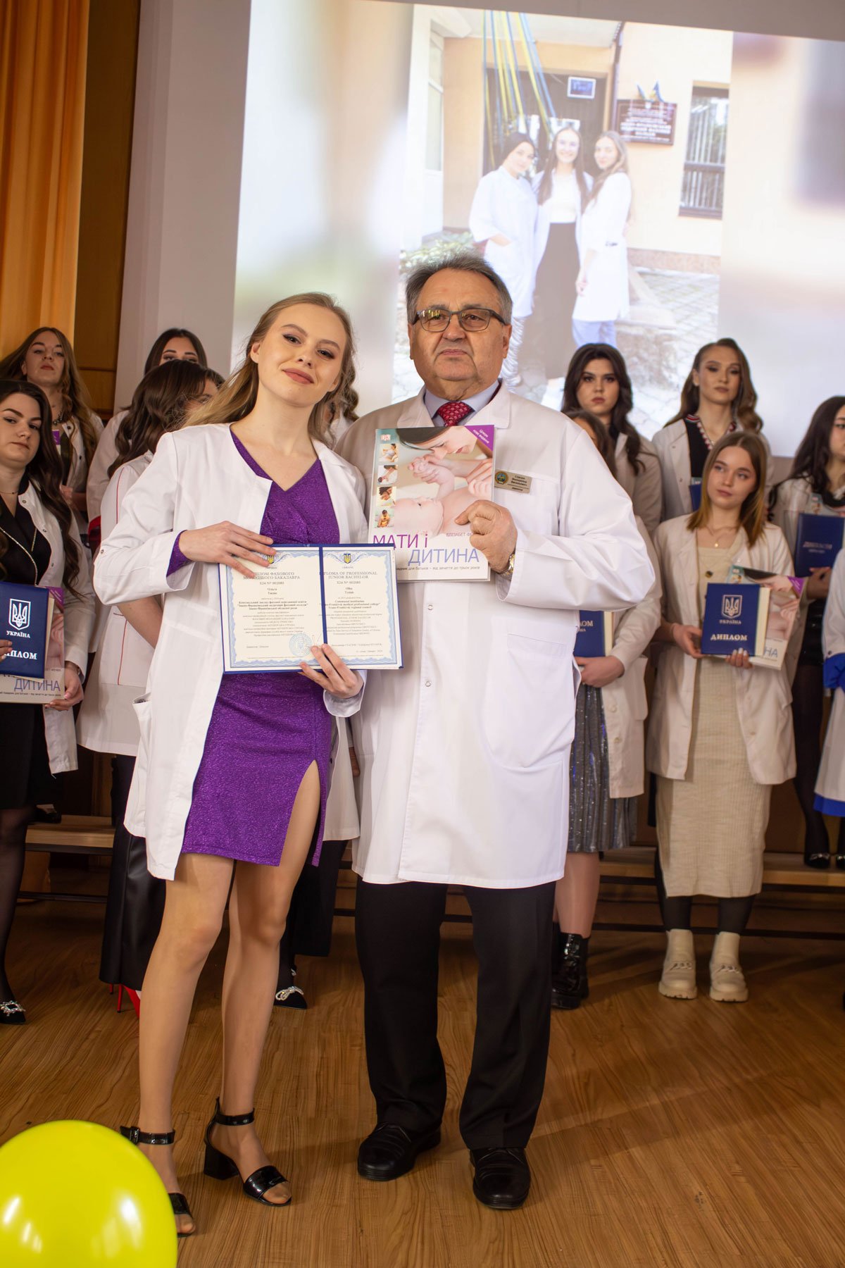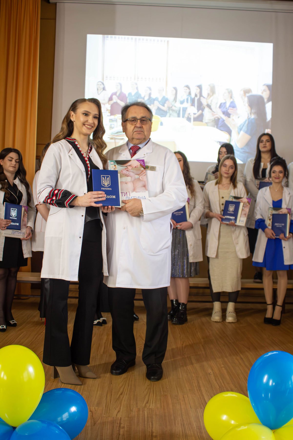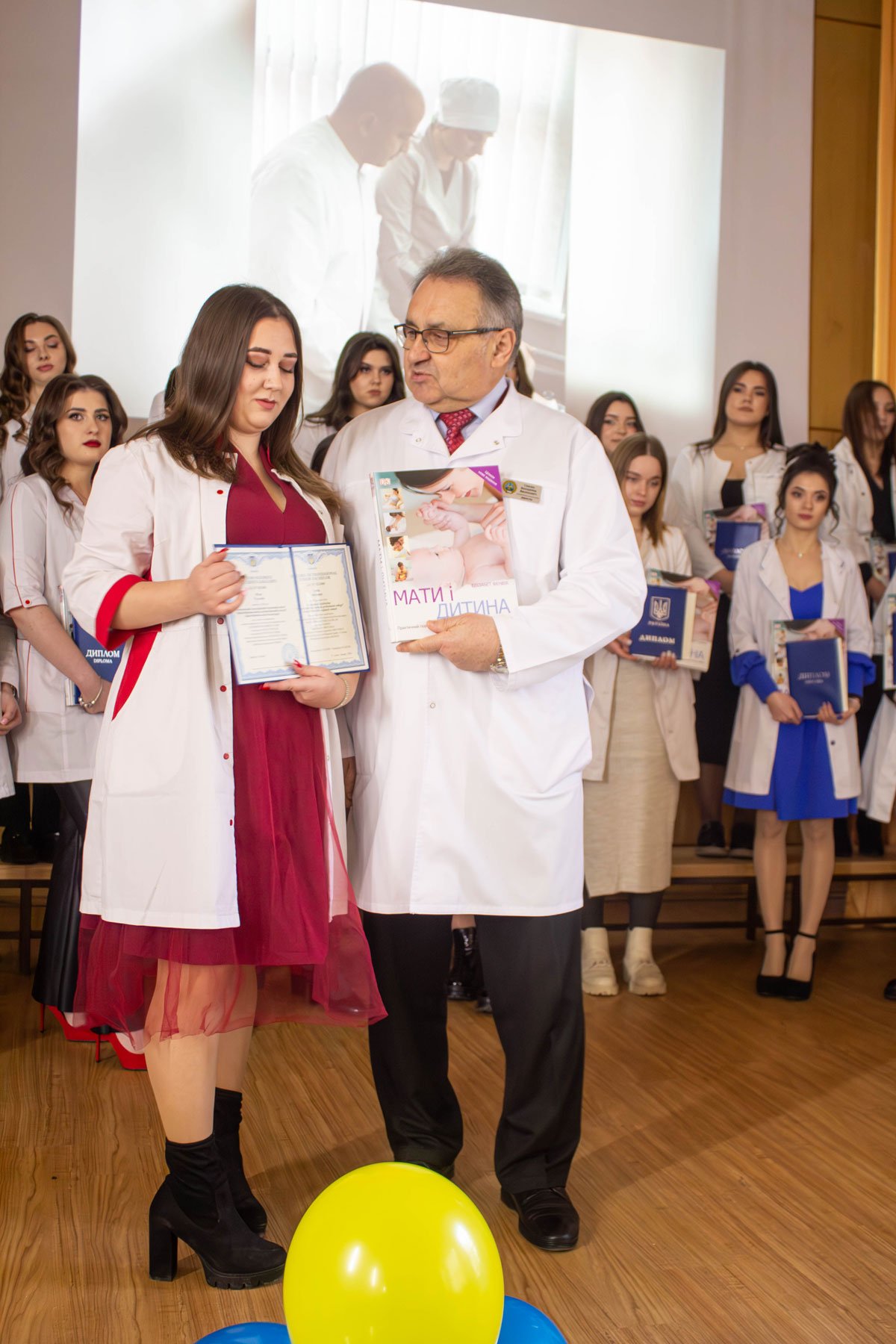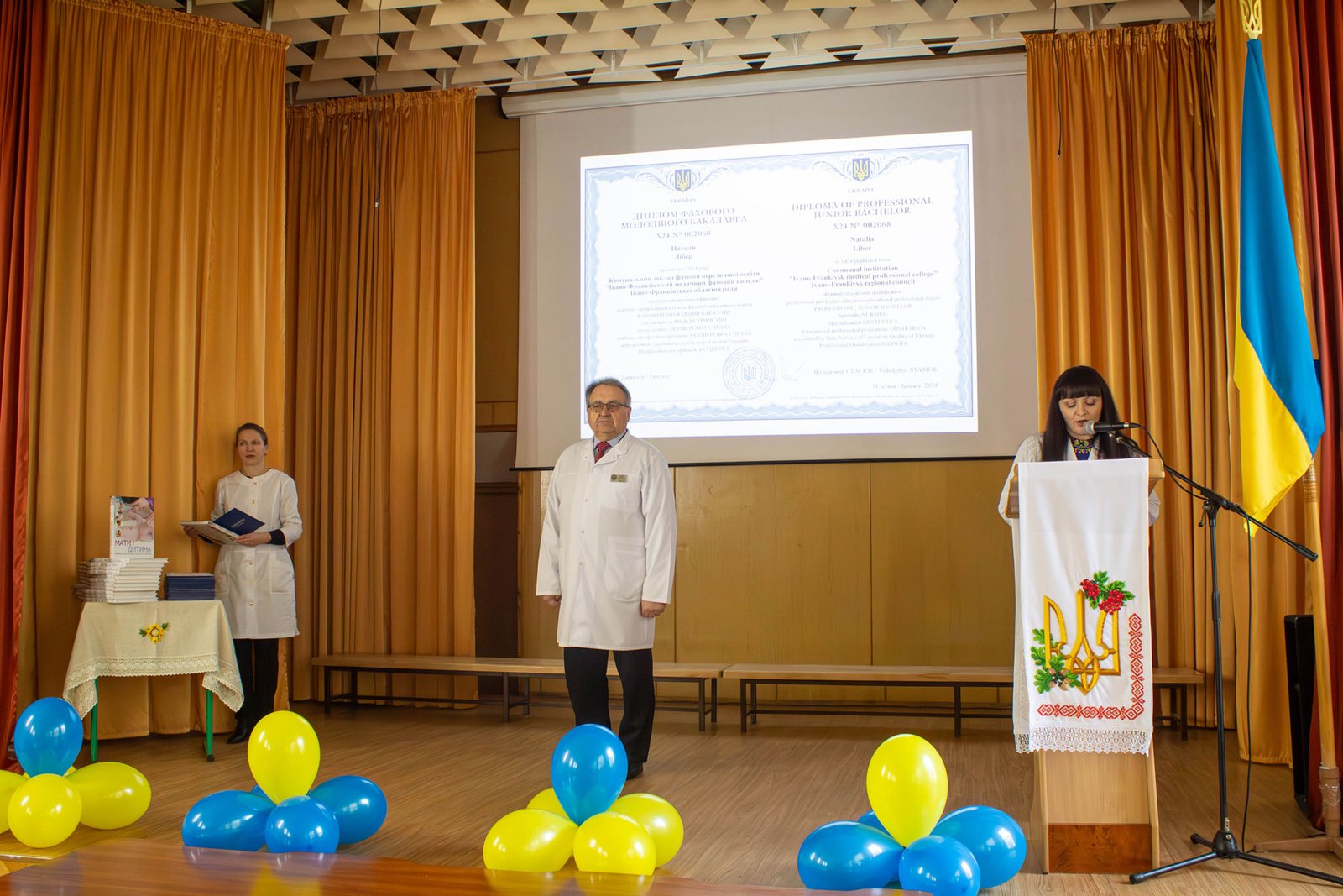 Наказ про вручення дипломів фахових молодших бакалаврів зачитувала заступниця директора з навчально-методичної роботи Ірина Іванівна Гафійчук, а дипломи вручали директор ІФМФК Володимир Васильович Стасюк і заступниця директора з виховної роботи Наталія Валеріївна Мальованчук. Дипломи отримали 23 випускники. І кожному у подарунок – книга «Мати і дитина». Для майбутніх акушерок такий подарунок символічний і корисний.