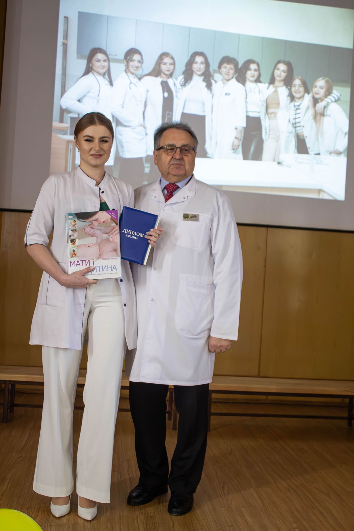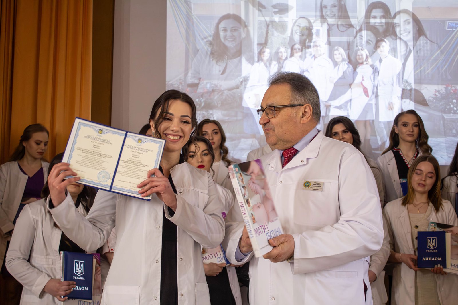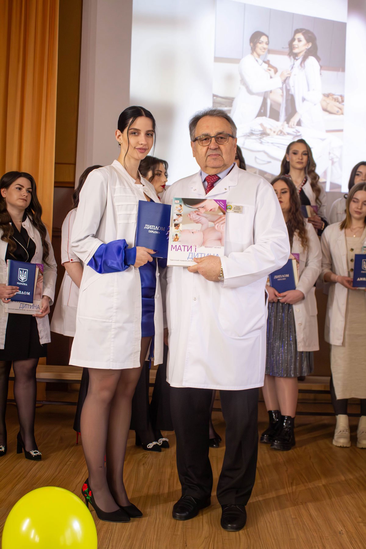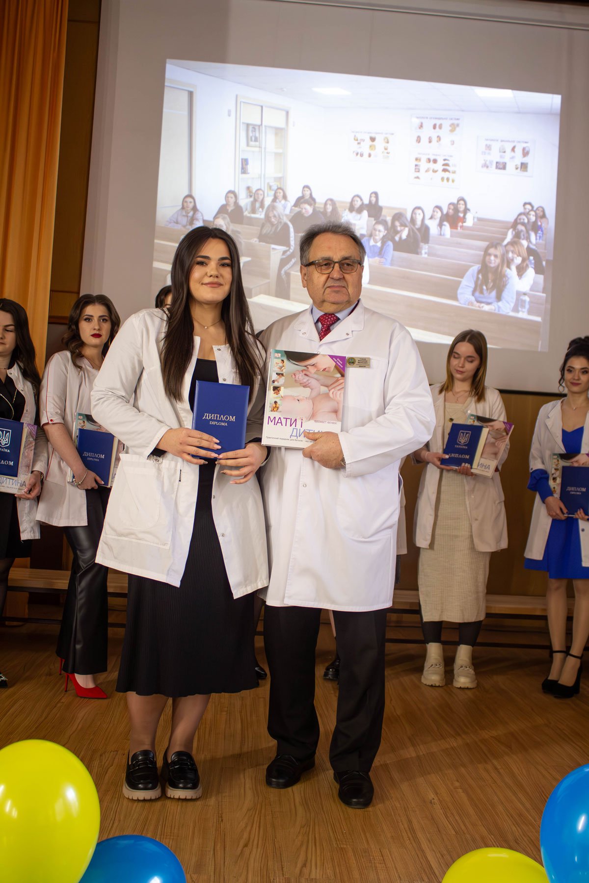 Наказ про вручення дипломів фахових молодших бакалаврів зачитувала заступниця директора з навчально-методичної роботи Ірина Іванівна Гафійчук, а дипломи вручали директор ІФМФК Володимир Васильович Стасюк і заступниця директора з виховної роботи Наталія Валеріївна Мальованчук. Дипломи отримали 23 випускники. І кожному у подарунок – книга «Мати і дитина». Для майбутніх акушерок такий подарунок символічний і корисний.